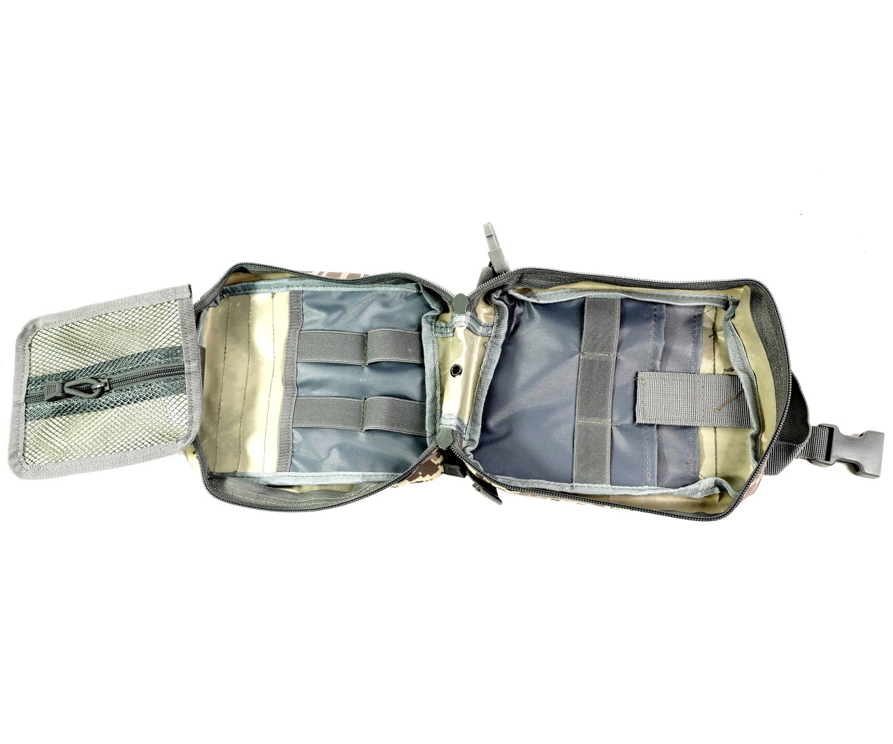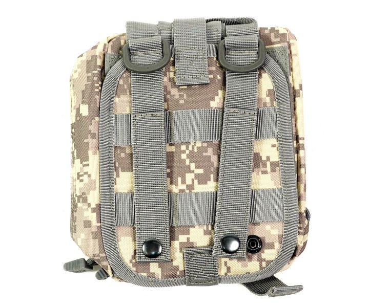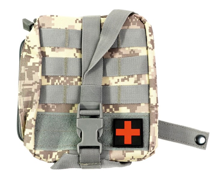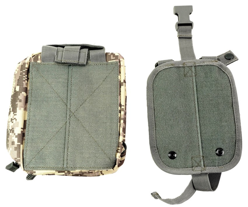 Аптечка среднего размера для размещения медикаментов и перевязочного материала для оказания первой помощи в полевых условиях. Подсумок с медикаментами при помощи липучки велкро крепится на платформе и страхуется хлястиком. Если отстегнуть хлястик, то резко потянув за ручку, подсумок можно сорвать с платформы и либо передать партнеру, либо начать использовать самому.