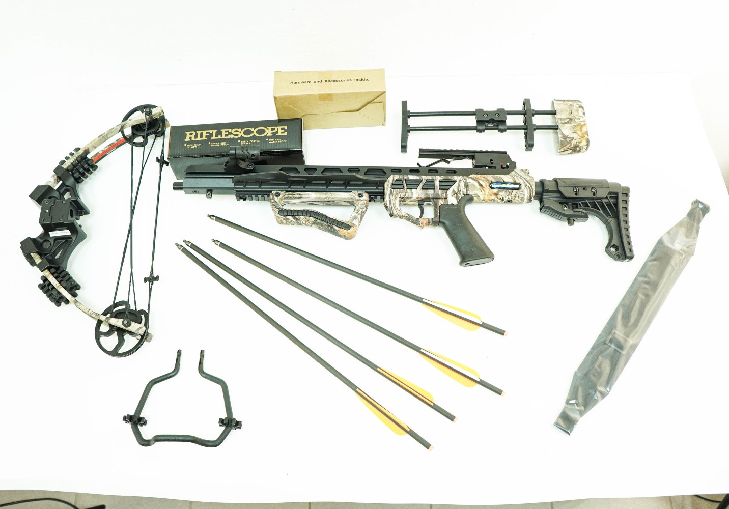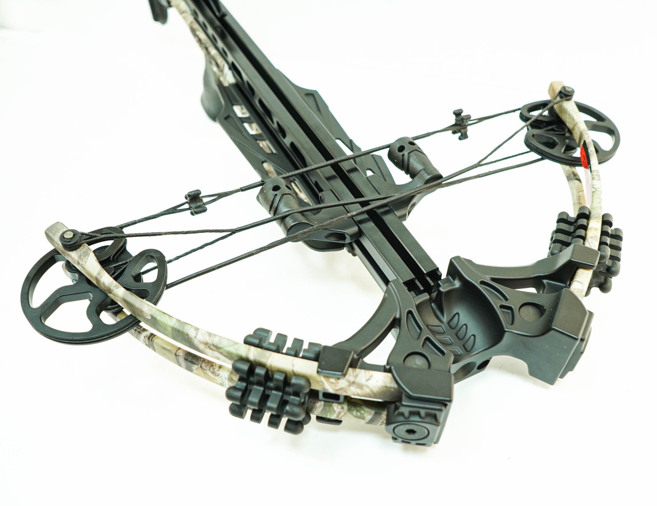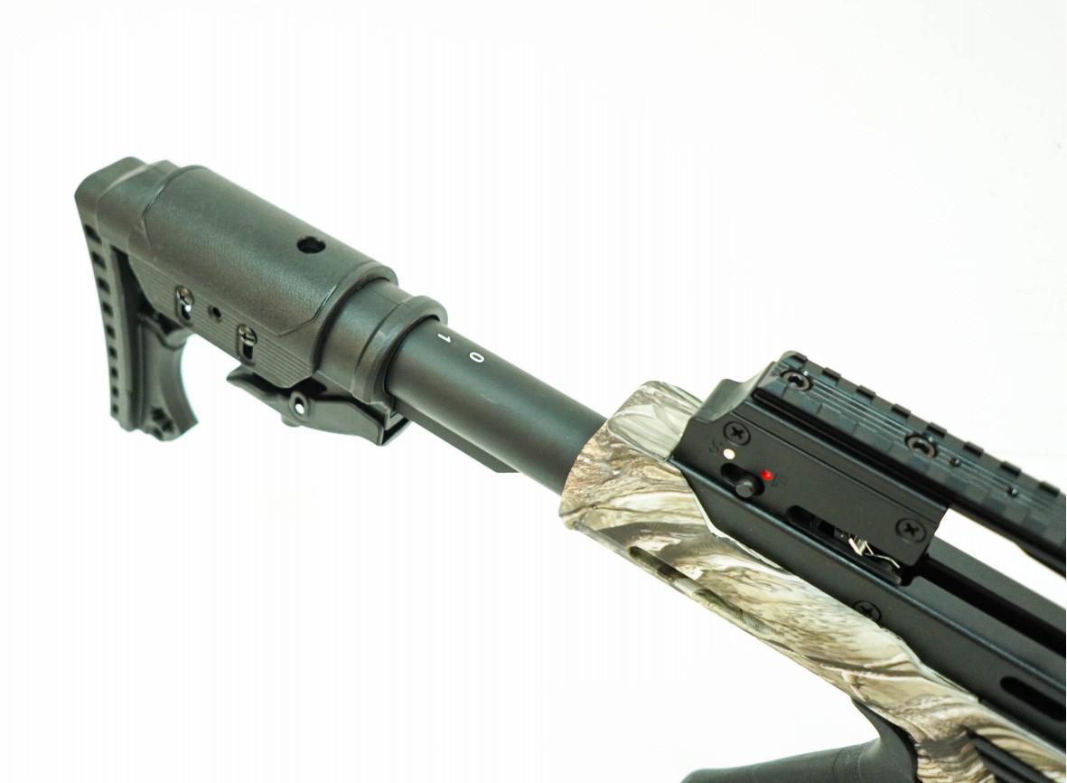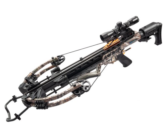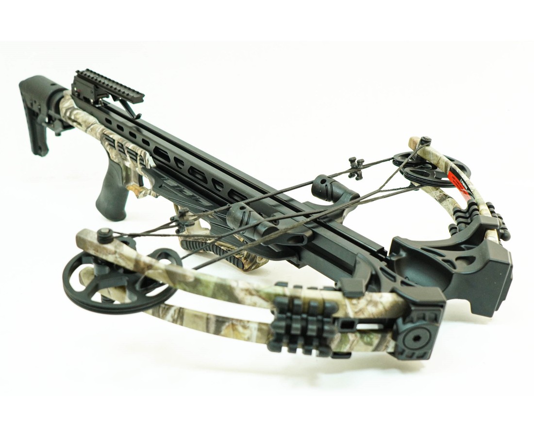 Щечка приклада крепится жестко 4-мя винтами, и может регулироваться. Цвет исполнения камуфляж. Весит модель 3,5 кг. Комплектация: оптика 4x32, 4 стрелы из алюминия 20 дюймов, кивер, ручной натяжитель, ремень, воск.