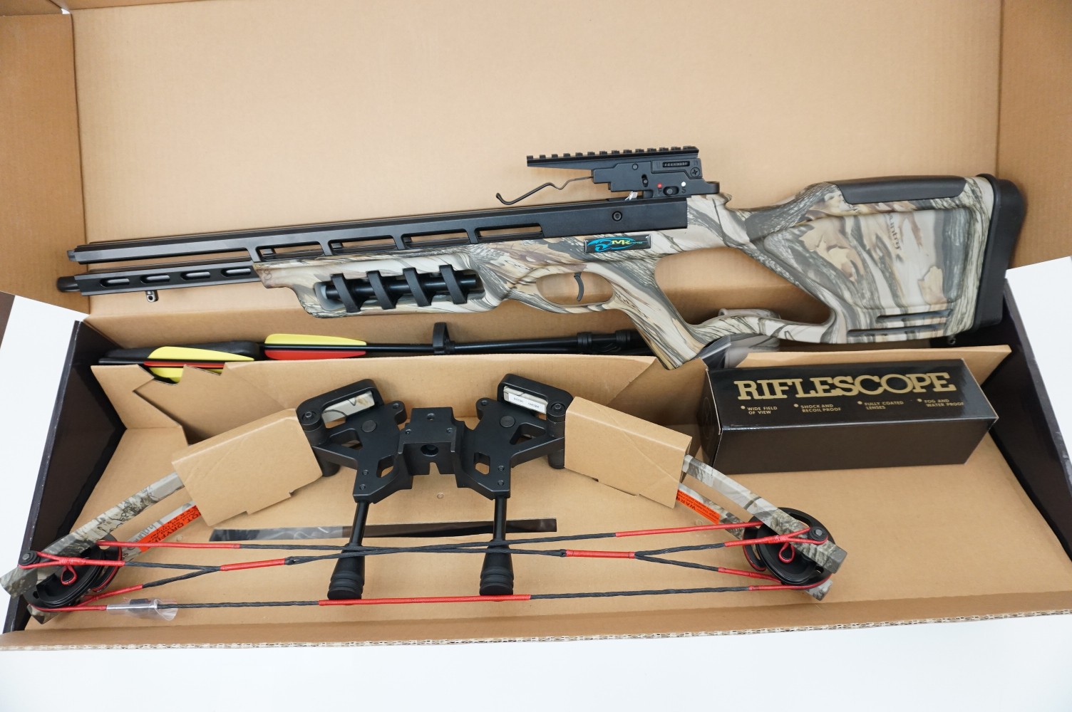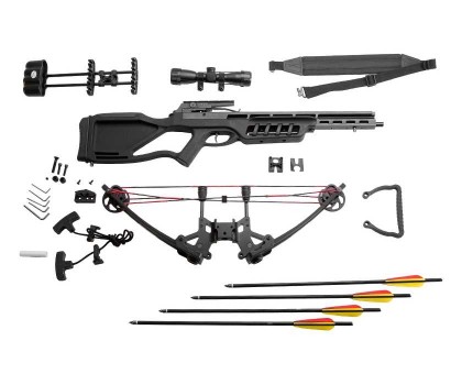 Комплектация (?): | арбалет, оптический прицел 4x32, воск, ремень, кивер, 4 алюминиевые стрелы, ручной натяжитель |