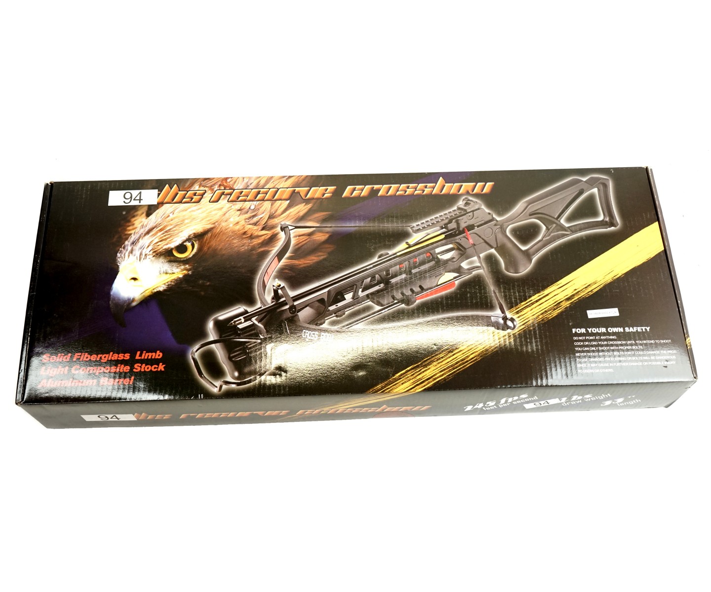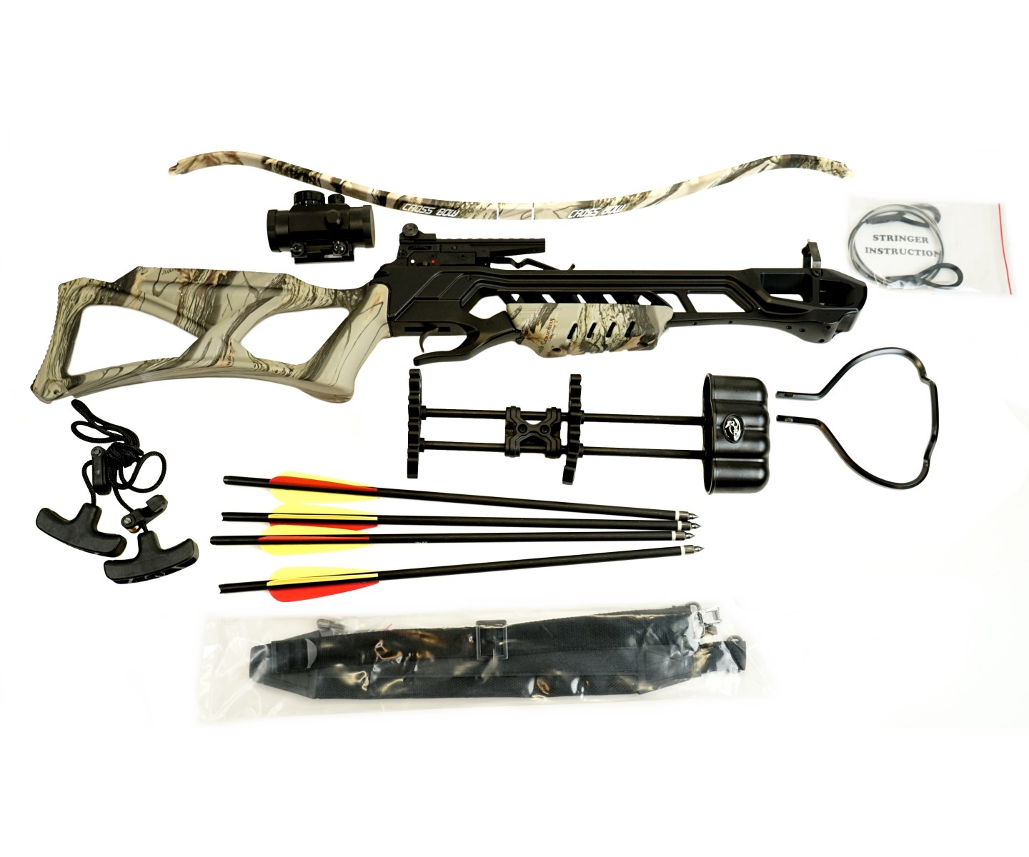 Вес арбалета 2,4 кг, длина 84 см, ширина плеч 66 см. Поставляется в двух комплектациях – базовой и расширенной. Упаковка – коробка из картона.