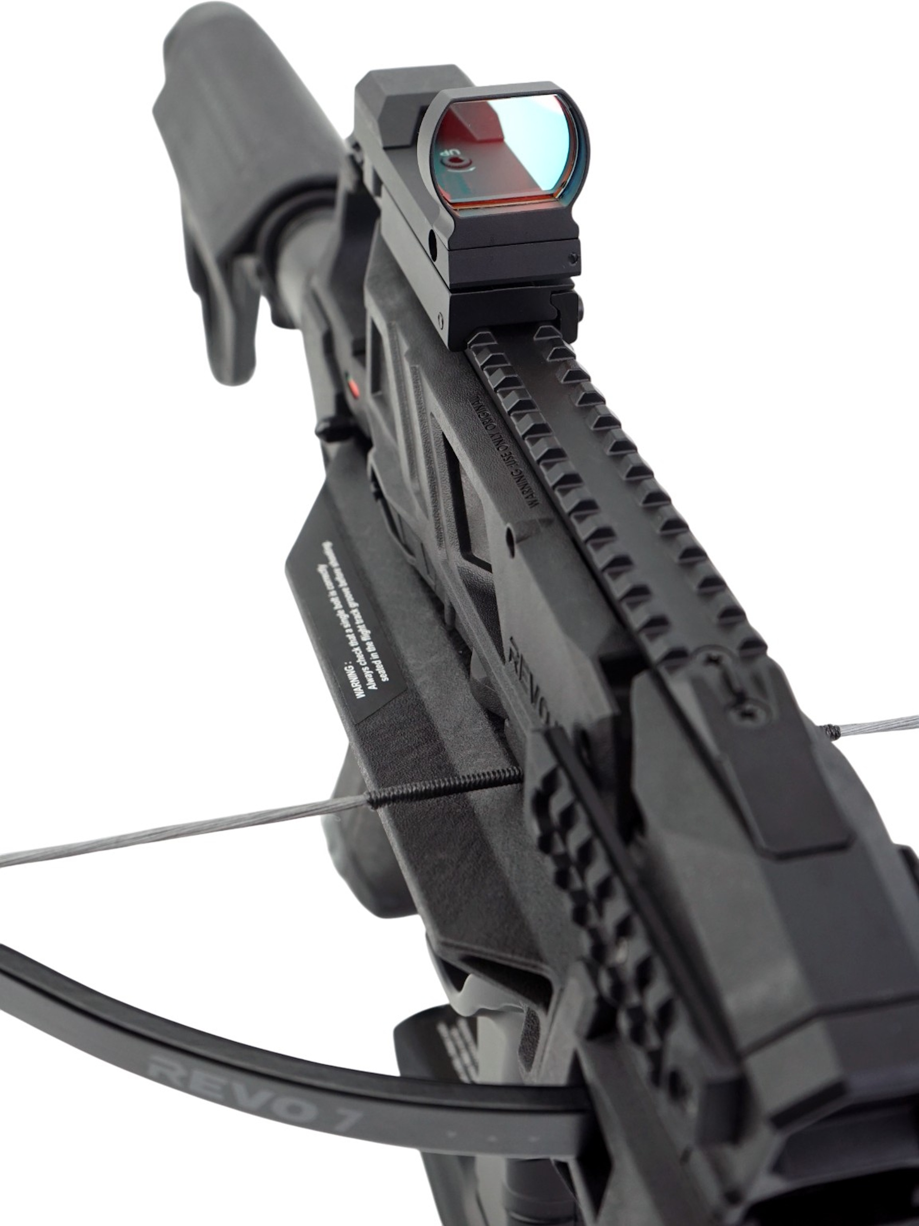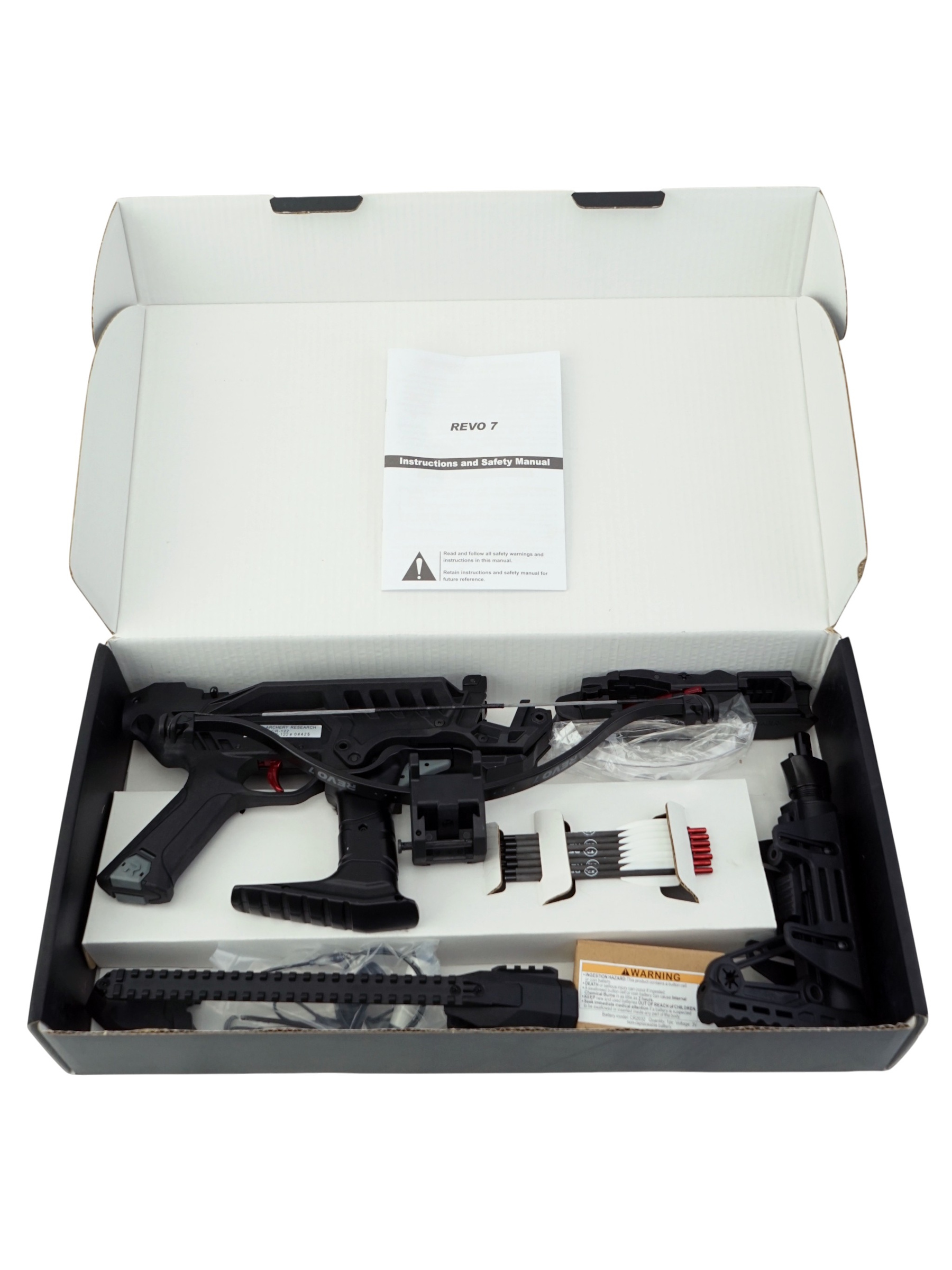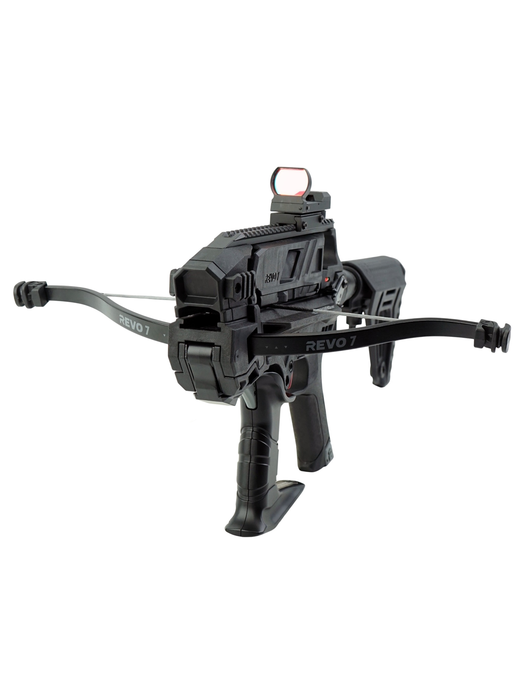 Если предыдущие модели серии обладали строгим дизайном с оглядкой на старую школу арбалетостроения, то Revo 7 – это арбалет, дизайн которого вдохновлен эстетикой современного автоматического оружия. Revo обладает компактными габаритами и отличной эргономикой. Арбалет комплектуется тактическим телескопическим прикладом на трубе com-spec с регулируемым подщечником и быстросъемным ременным креплением QD. По всей длине корпуса проходит прицельная планка picatinny на 25 слотов. Две дополнительные планки располагаются по бокам. Имеется специальный инструмента для снятия арбалета с боевого взвода, который аккуратно спрятан в рукоятке, а также специальное отверстия под установку замка, чтобы не допустить использование арбалетом ребенком или посторонним человеком.