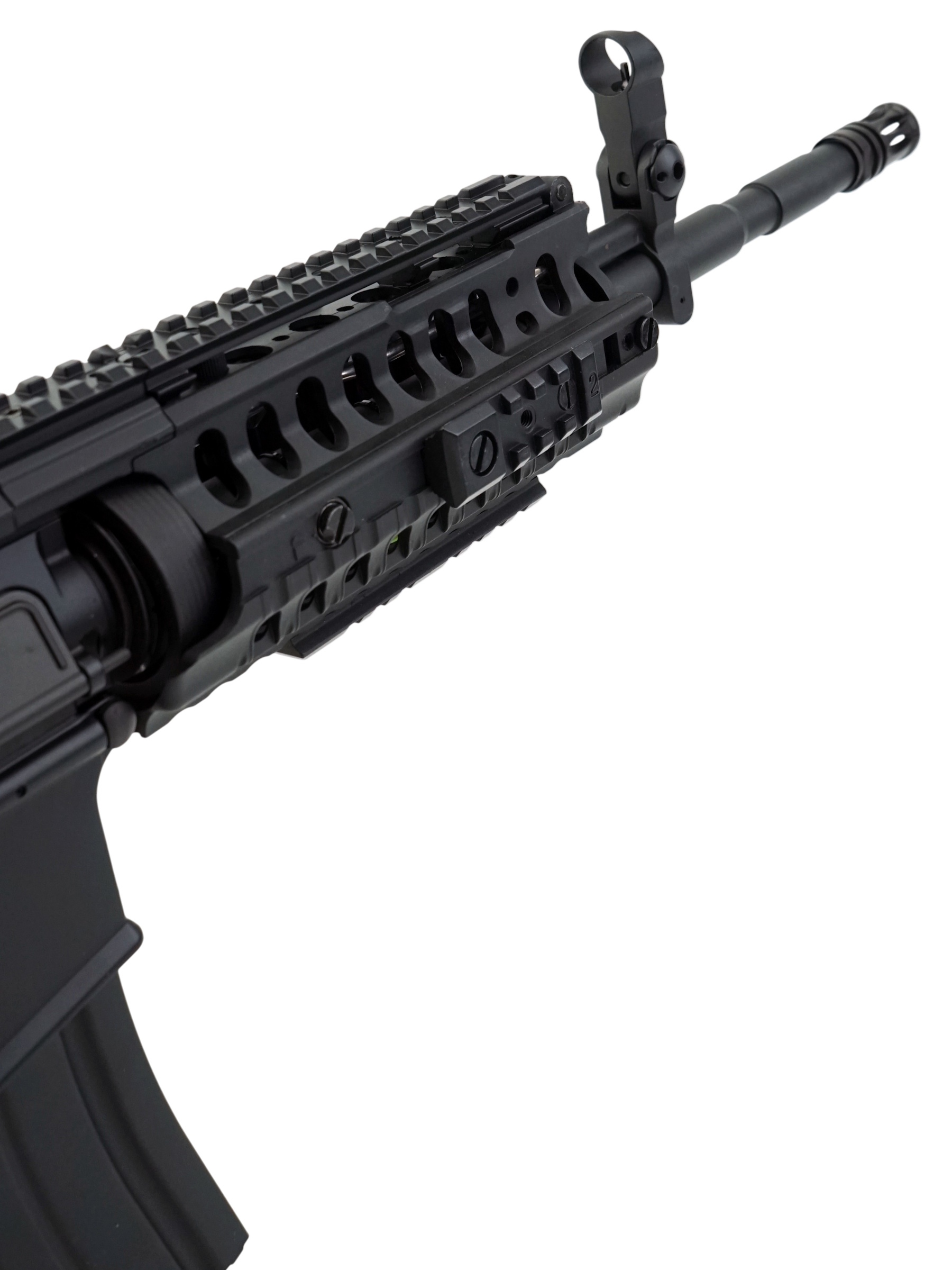 Страйкбольный автомат Cyma M4 S-System (CM008) – это AEG-копия боевой винтовки М4, с цевьем CASV и несколькими тактическими направляющими. Привод стреляет с хорошей кучностью, эффективная дальность выстрела составляет, по заявлению производителя, около 40 метров. Хоп-ап с возможностью настройки, гирбокс из алюминиевого сплава Ver.2.