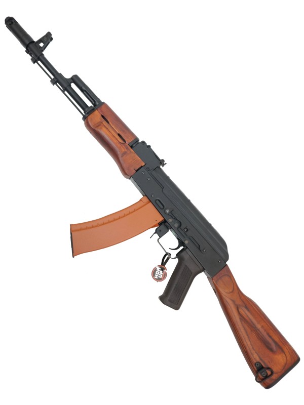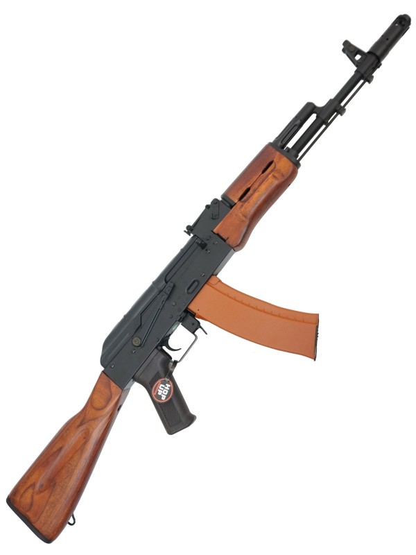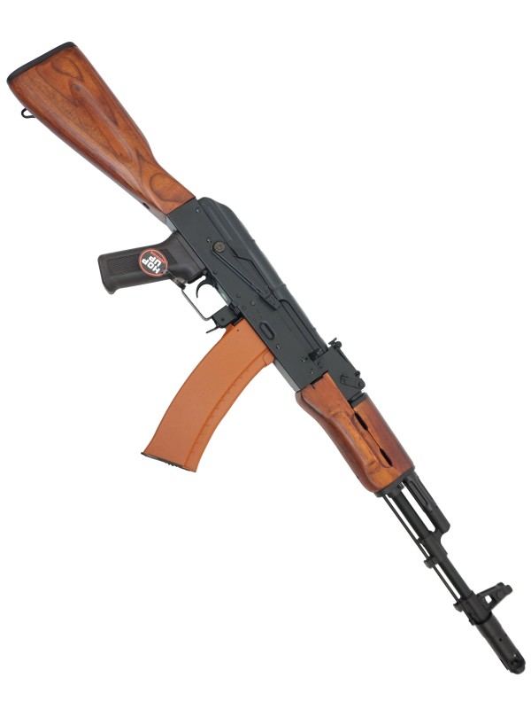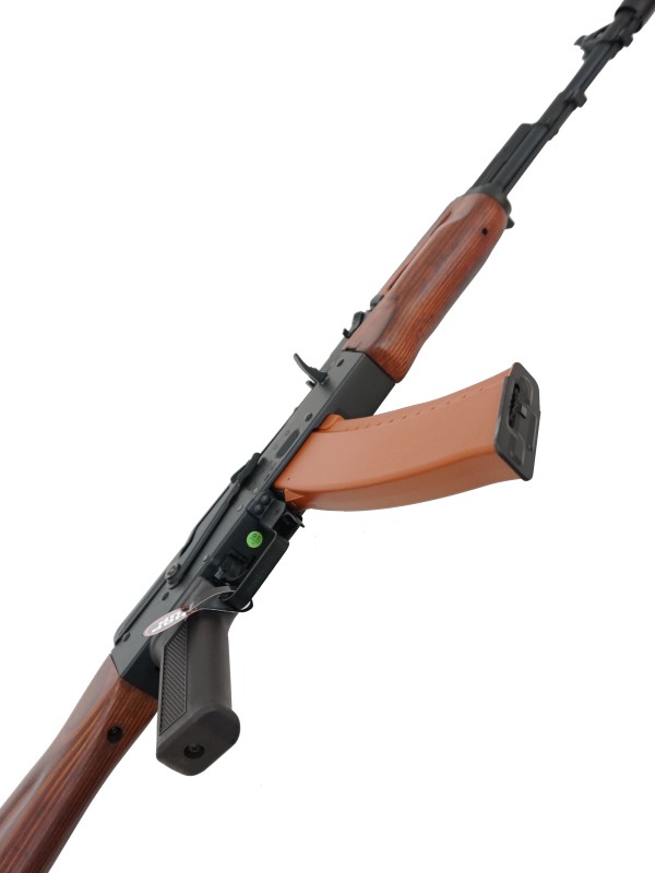 Страйкбольный автомат Cyma АК-74, дерево (CM048) – это реплика знаменитого «Калашникова» АК-74, привод высокого качества сборки, практически полностью изготовленный из металла. Изделие имеет базовый гирбокс 3-го поколения, и показывает скорость вылета в 130 м/с, что является максимальной для игр в зданиях. За кучность стрельбы отвечает настраиваемая камера хоп-ап. Боеприпасы – шарики 0,2 г, которые могут быть заменены на более тяжелые.