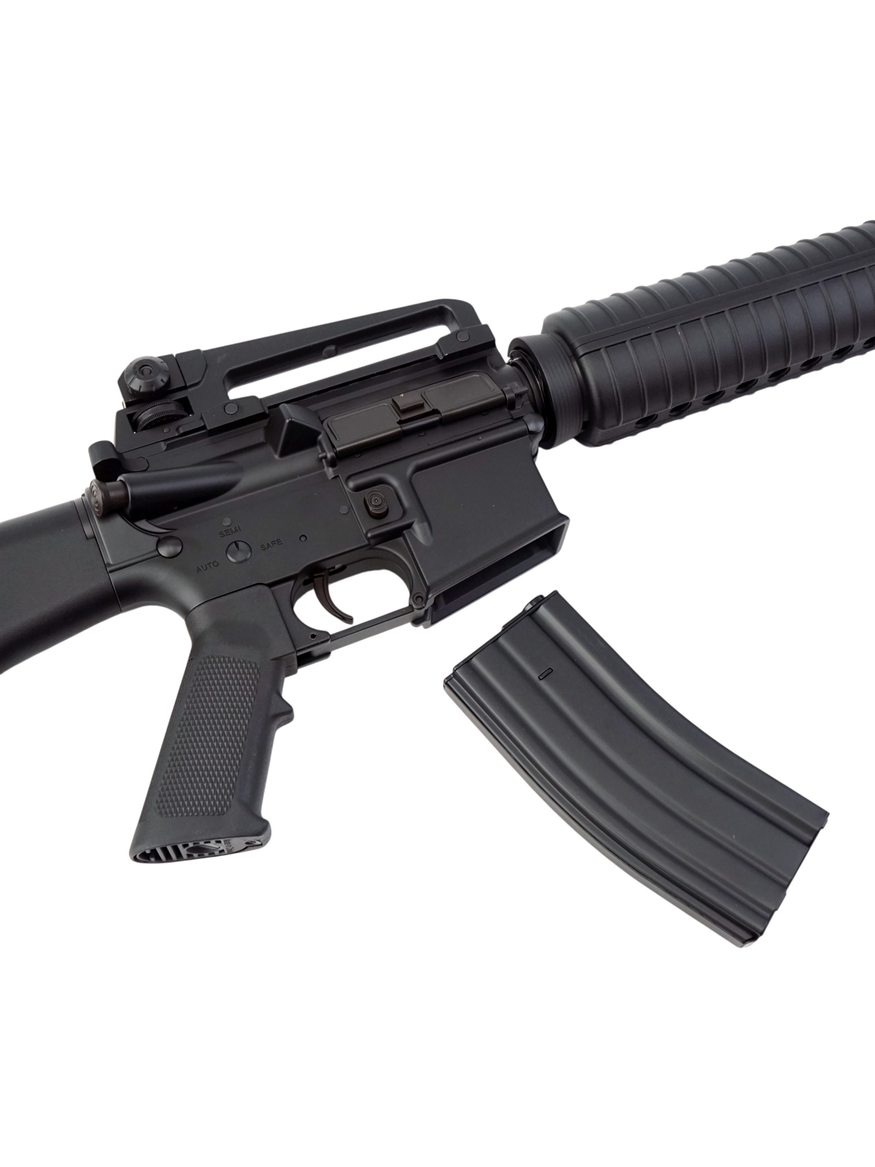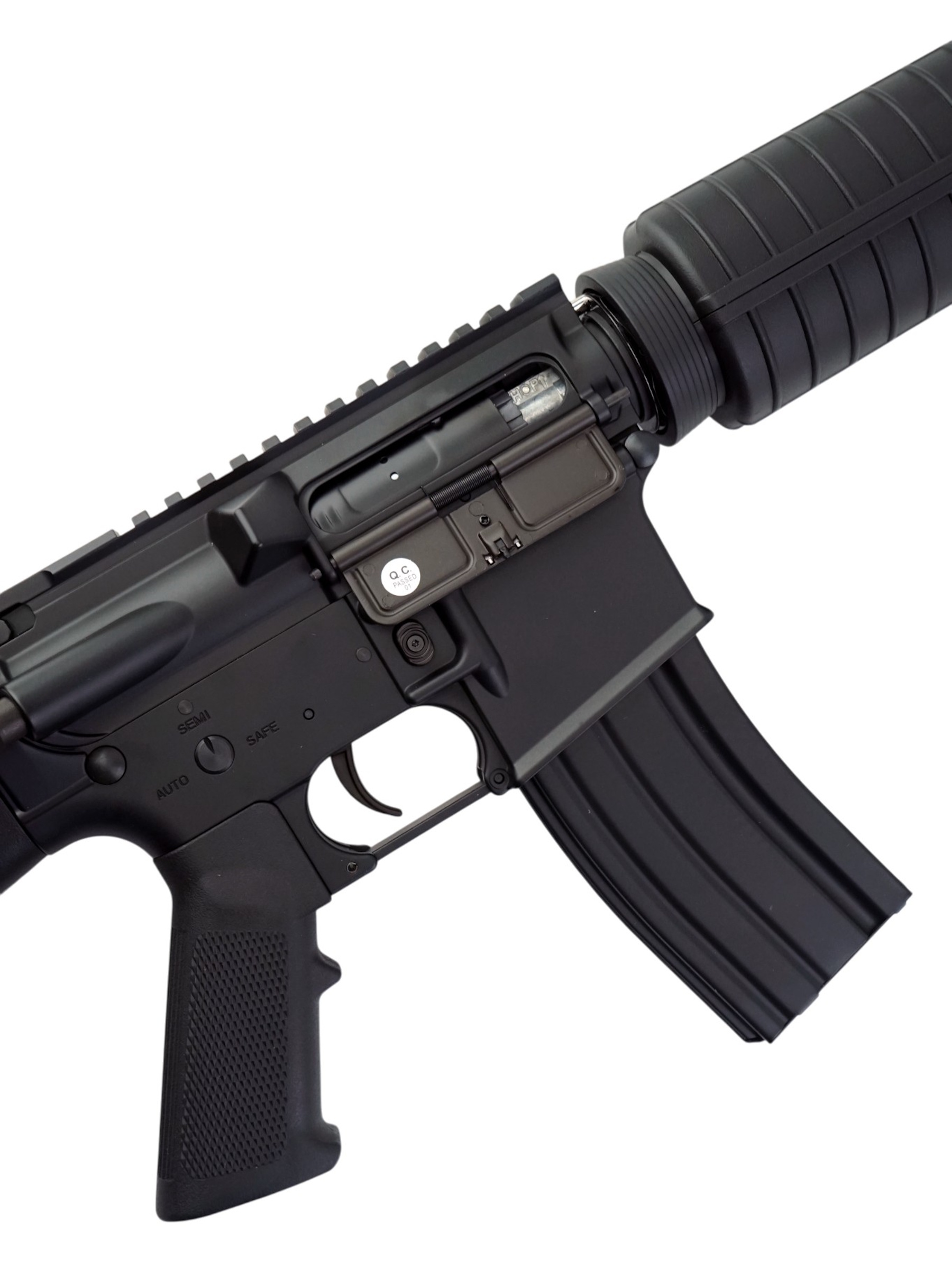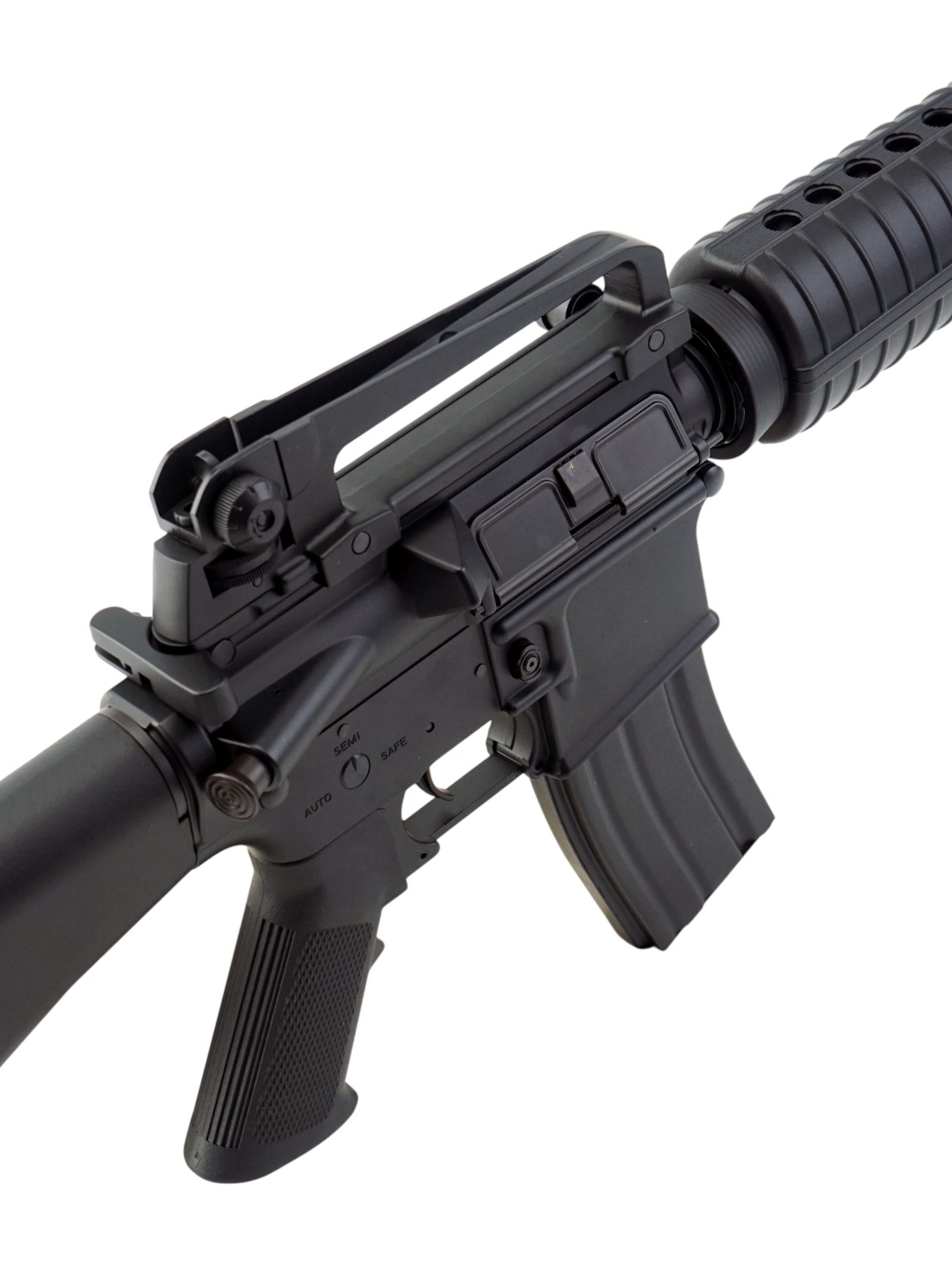 Страйкбольный автомат Cyma M16A3 (CM009) – это электропневматическая копия американской винтовки, недорогой и довольно качественный привод. Здесь используется гирбокс версии 2, шарики 6 мм вылетают со скоростью 120 м/с. Узел хоп-ап регулируемый, механизм регулировки находится в окне выброса гильз. Магазин на 350 шариков бункерный, кнопка сброса магазина расположена удобно.
