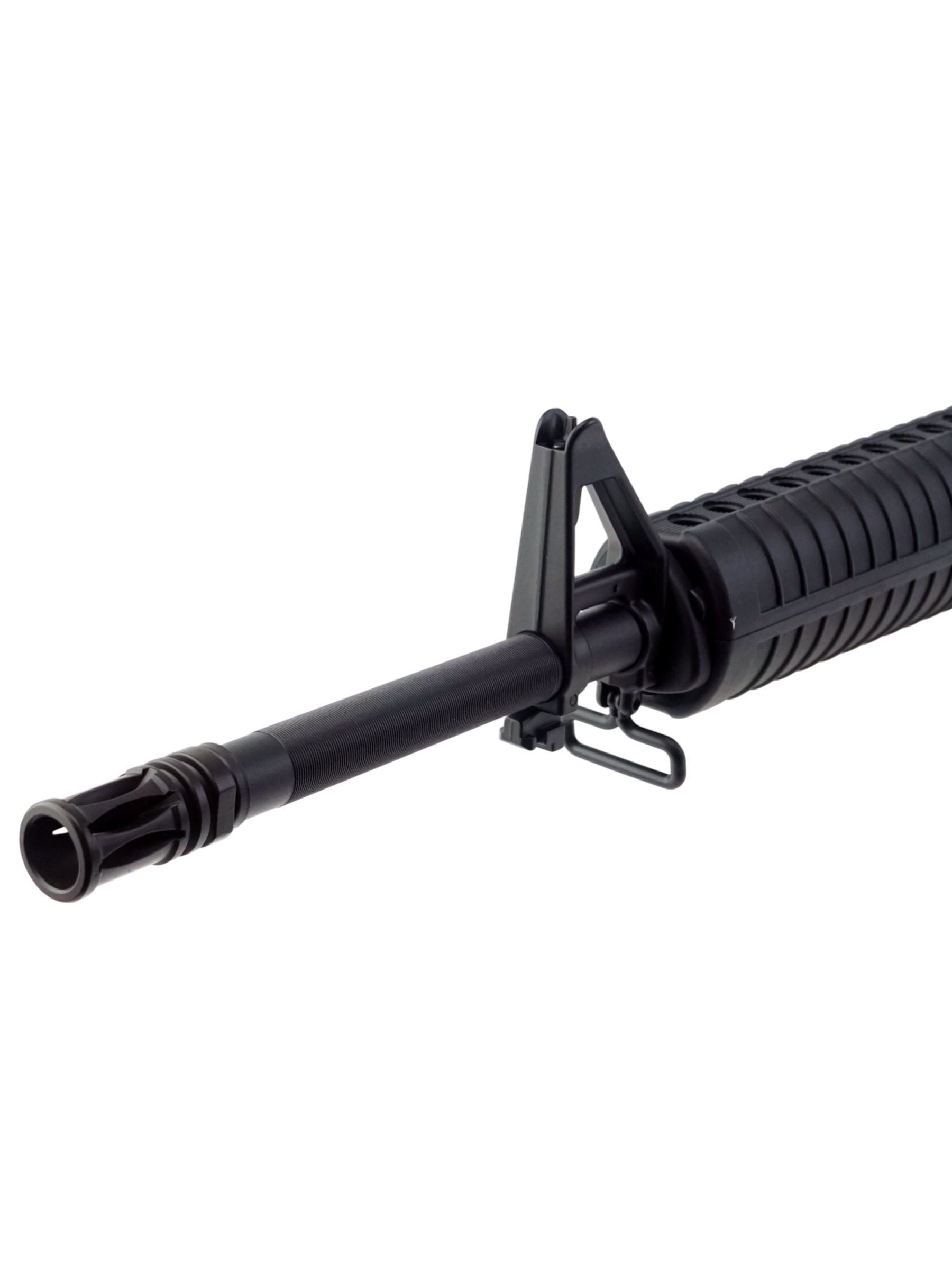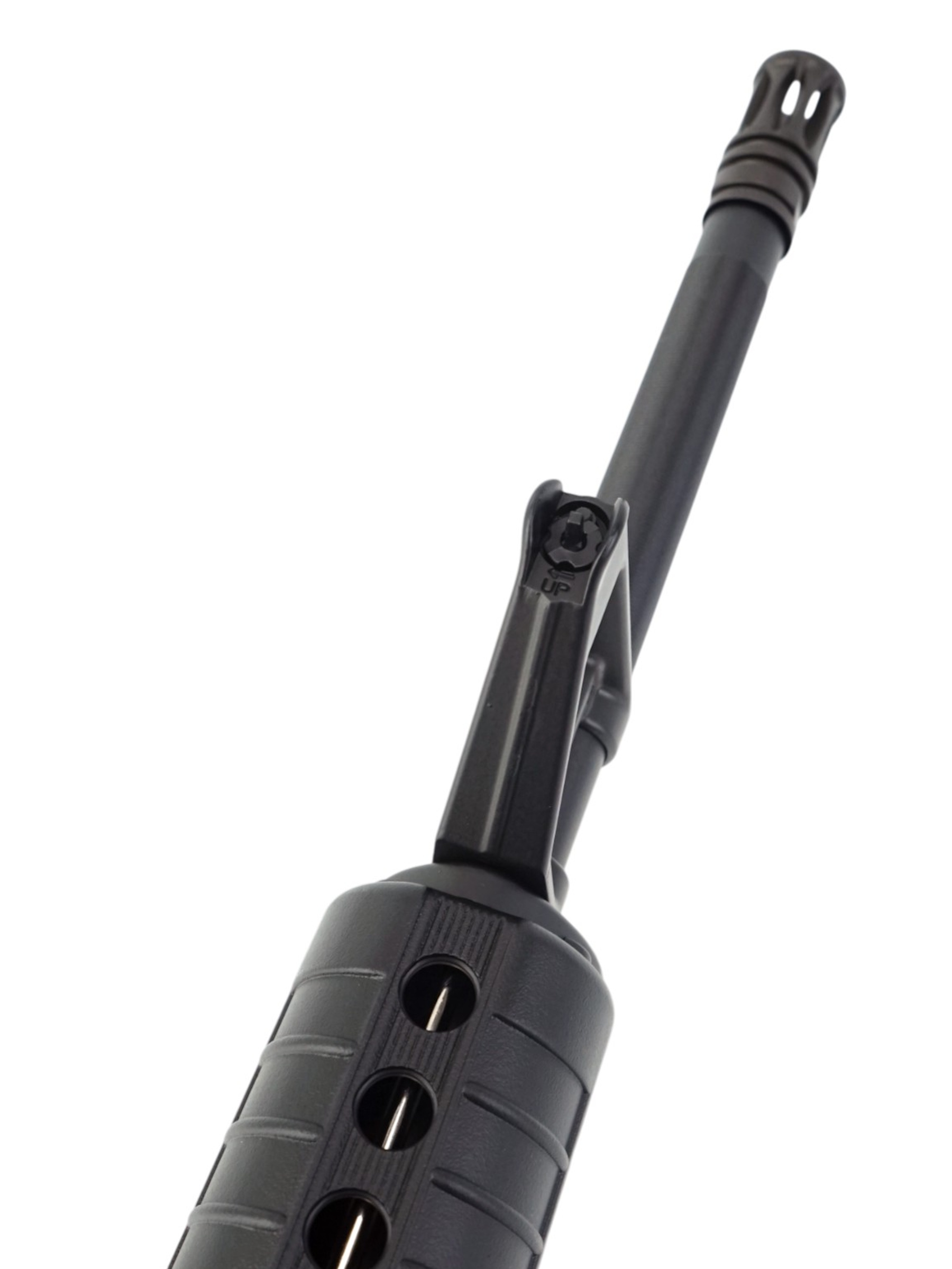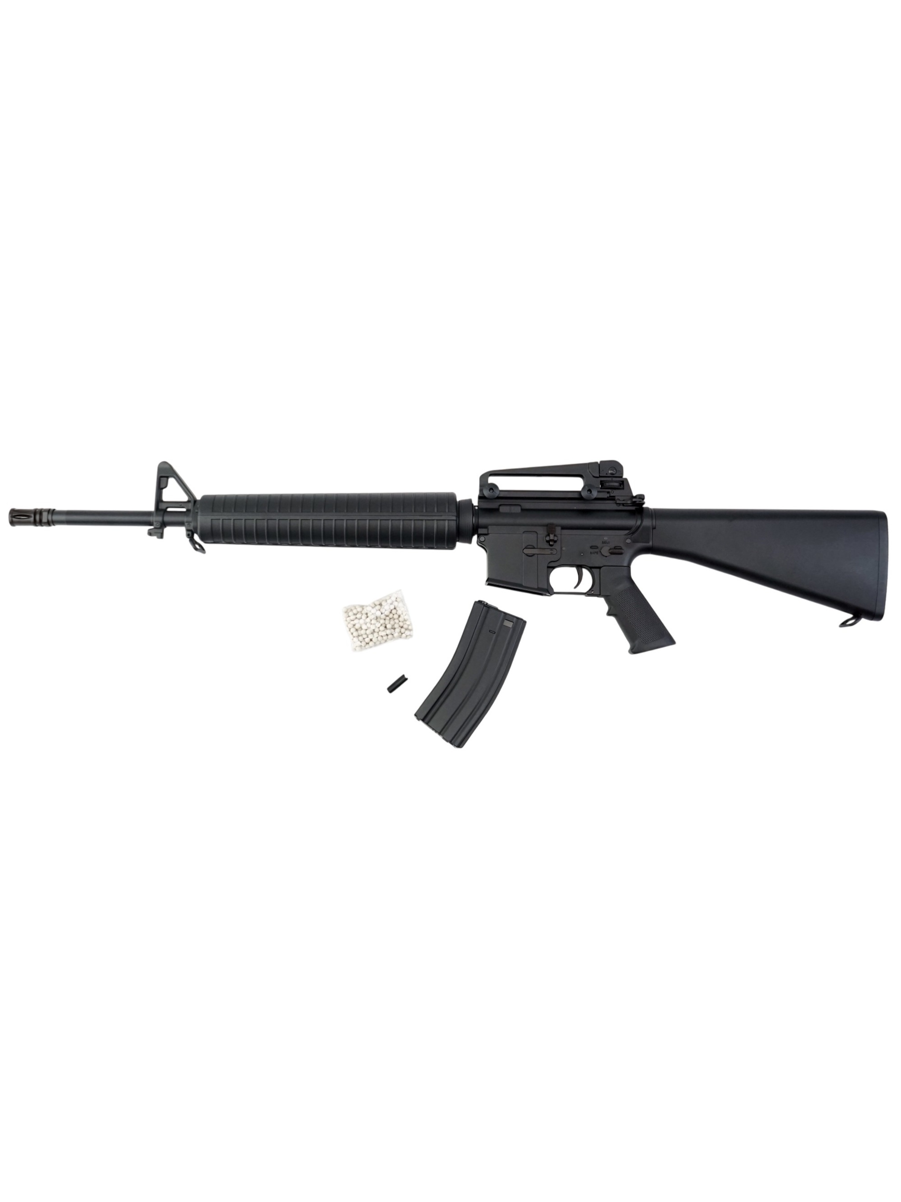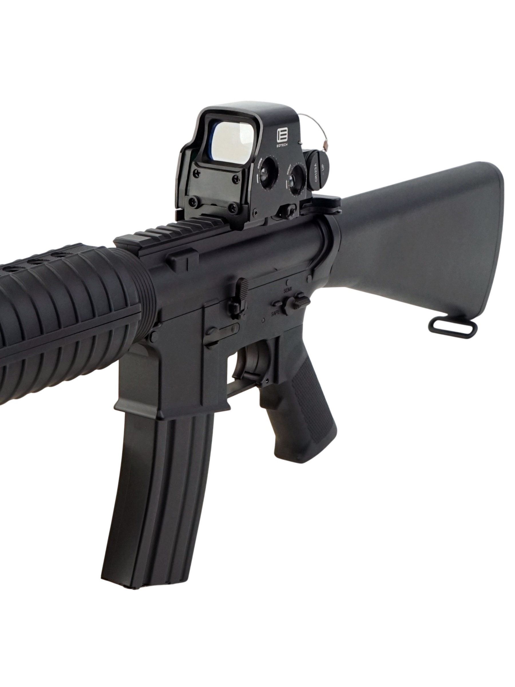 Страйкбольный автомат Cyma M16A3 (CM009) – это электропневматическая копия американской винтовки, недорогой и довольно качественный привод. Здесь используется гирбокс версии 2, шарики 6 мм вылетают со скоростью 120 м/с. Узел хоп-ап регулируемый, механизм регулировки находится в окне выброса гильз. Магазин на 350 шариков бункерный, кнопка сброса магазина расположена удобно.