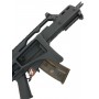 Автомат отличается бункерным магазином большого объема – вмещает 450 шариков 6 мм. Скорость выстрела приличная – 125 м/с. Мощность привода не выше 3 Дж, это позволяет приобрести изделие всем желающим. Благодаря дублированию механизма переводчика огня с двух сторон оружие удобно в эксплуатации всем стрелкам – и левшам, и правшам.