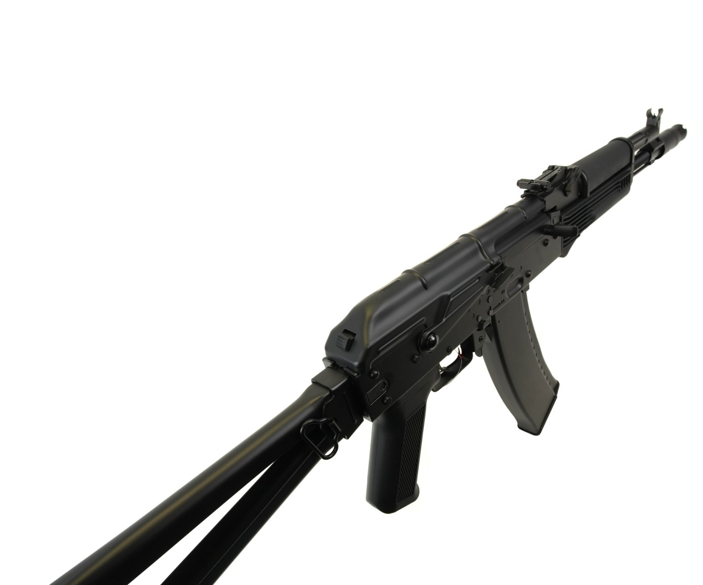 Достоинство автоматаа – в максимальной внешней схожести с боевым образцом. Габариты и вес модификации аналогичны прототипу. Приклад рамочный складного типа. Материал – алюминиевый сплав, из него изготовлены часть деталей корпуса, ствол со ствольной коробкой и ответственные компоненты. Остальные детали изготовлены из пластика отличного качества. Вес автомата – 2,7 кг, длина с прикладом – 83,8 кг. В комплект автомата входит магазин, лоадер, аккумулятор с ЗУ, инструкция, а также шомпол и набор шариков ВВ.