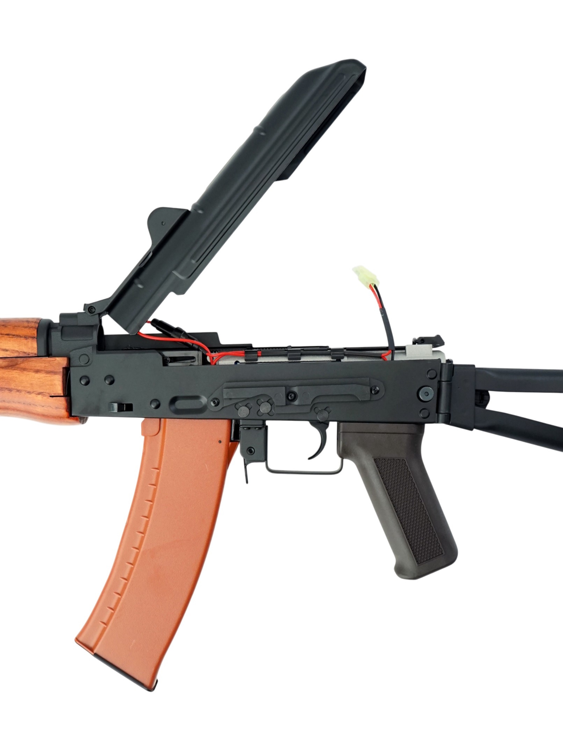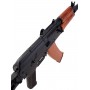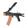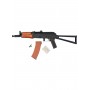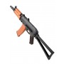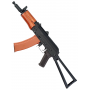 Особенность автомата – использование материалов, аналогичных оригинальному боевому образцу. Целик автомата регулируемый. Корпус и все ответственные составляющие привода изготовлены из металла, приклад стальной, цевье из натурального дерева и покрыто лаком. Приклад складного типа. Вес привода – 2,9 кг, длина – 73 см вместе с прикладом. В комплекте идут: магазин, аккумулятор и зарядное устройство, шомпол, шарики и инструкция.