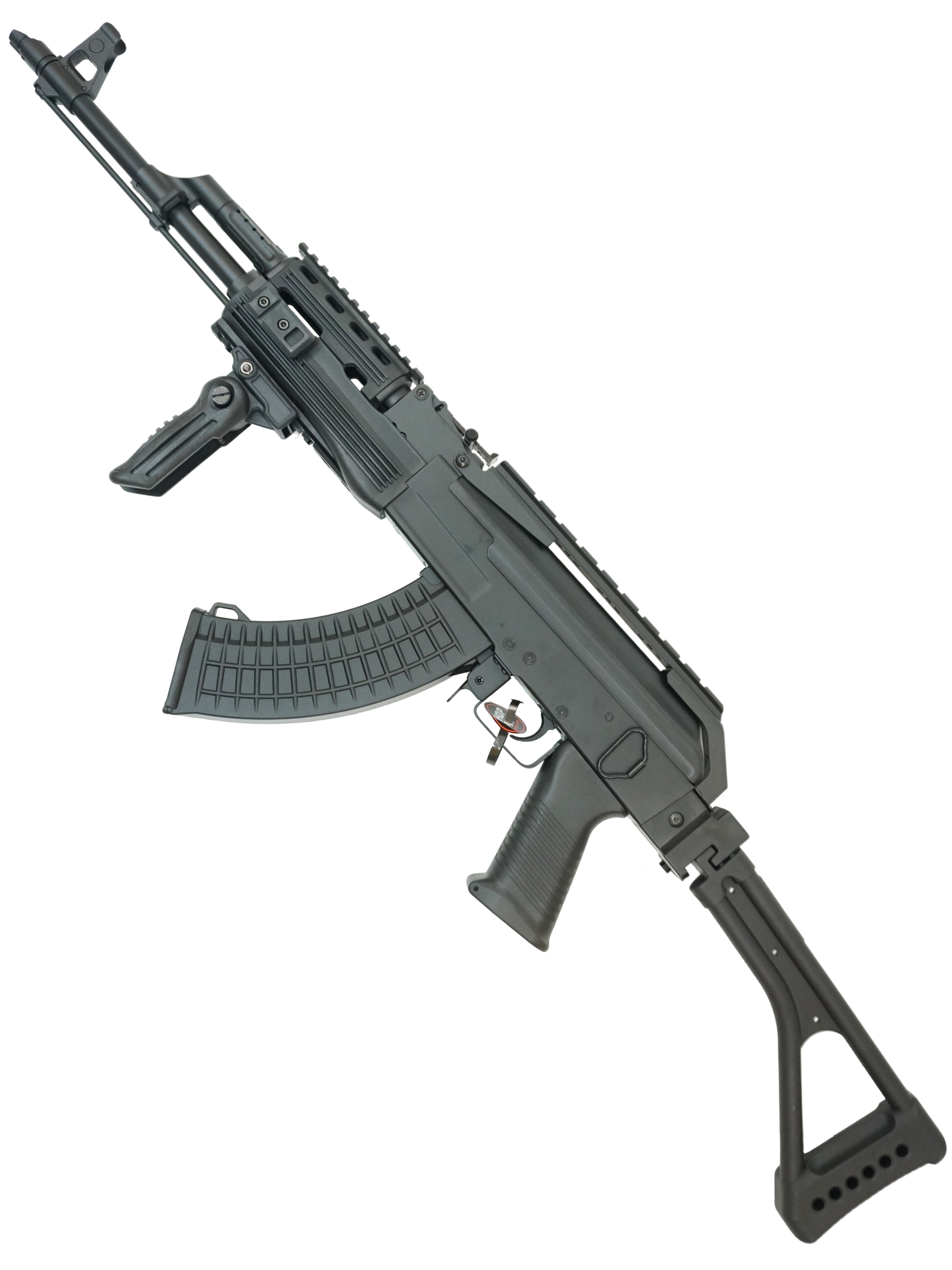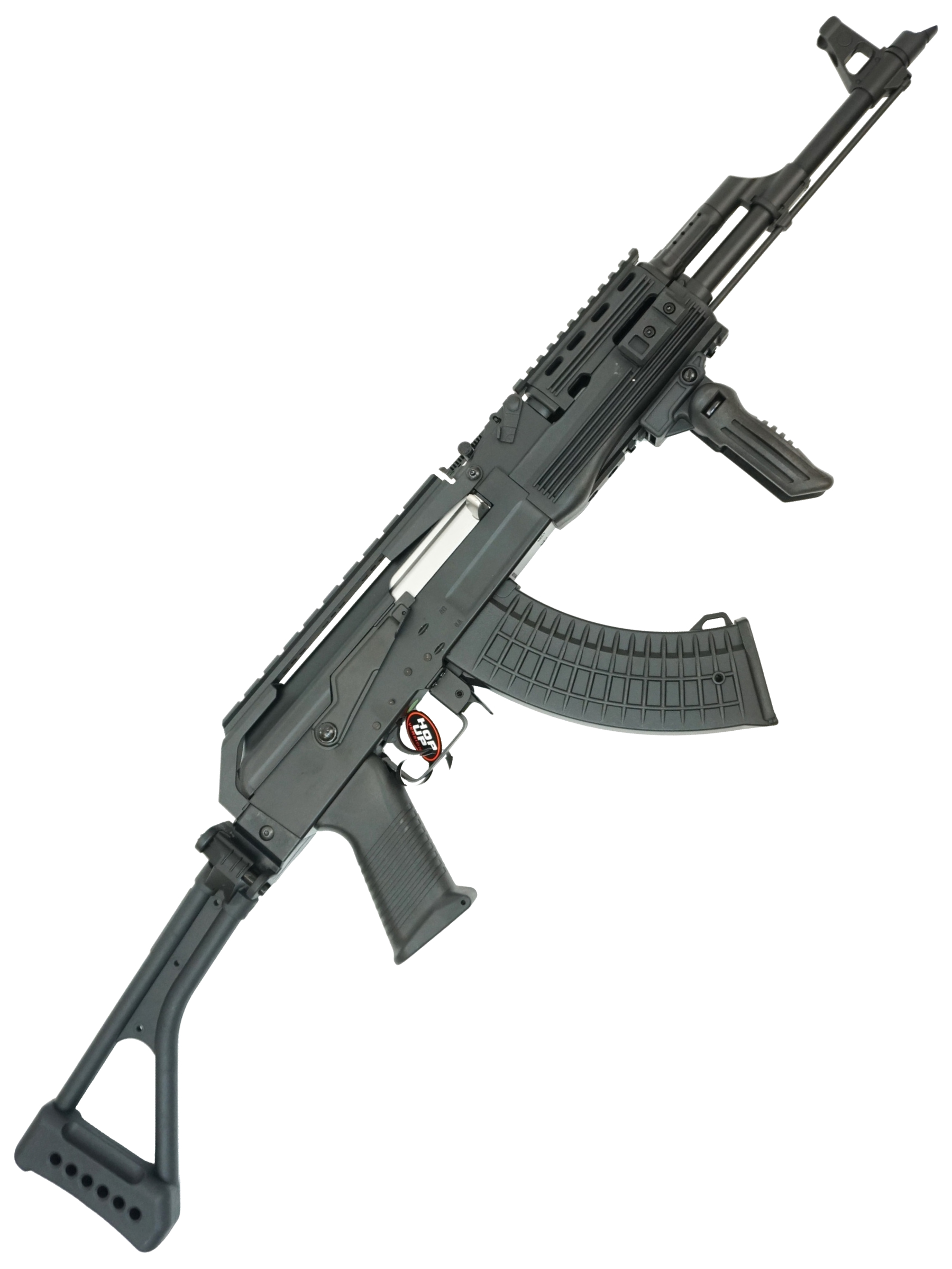 Страйкбольный автомат Cyma АК-47 АКМС Tactical (CM039U) – это AEG-реплика АК-47, разработанная известным производителем пневматики. Автомат отличается использованием тактического цевья для присоединения аксессуаров, а также прикладом складной конструкции. Работу приводу обеспечивает аккумулятор на 1100 mAh (расположен под крышкой ствольной коробки) и гирбокс 3-ей версии.