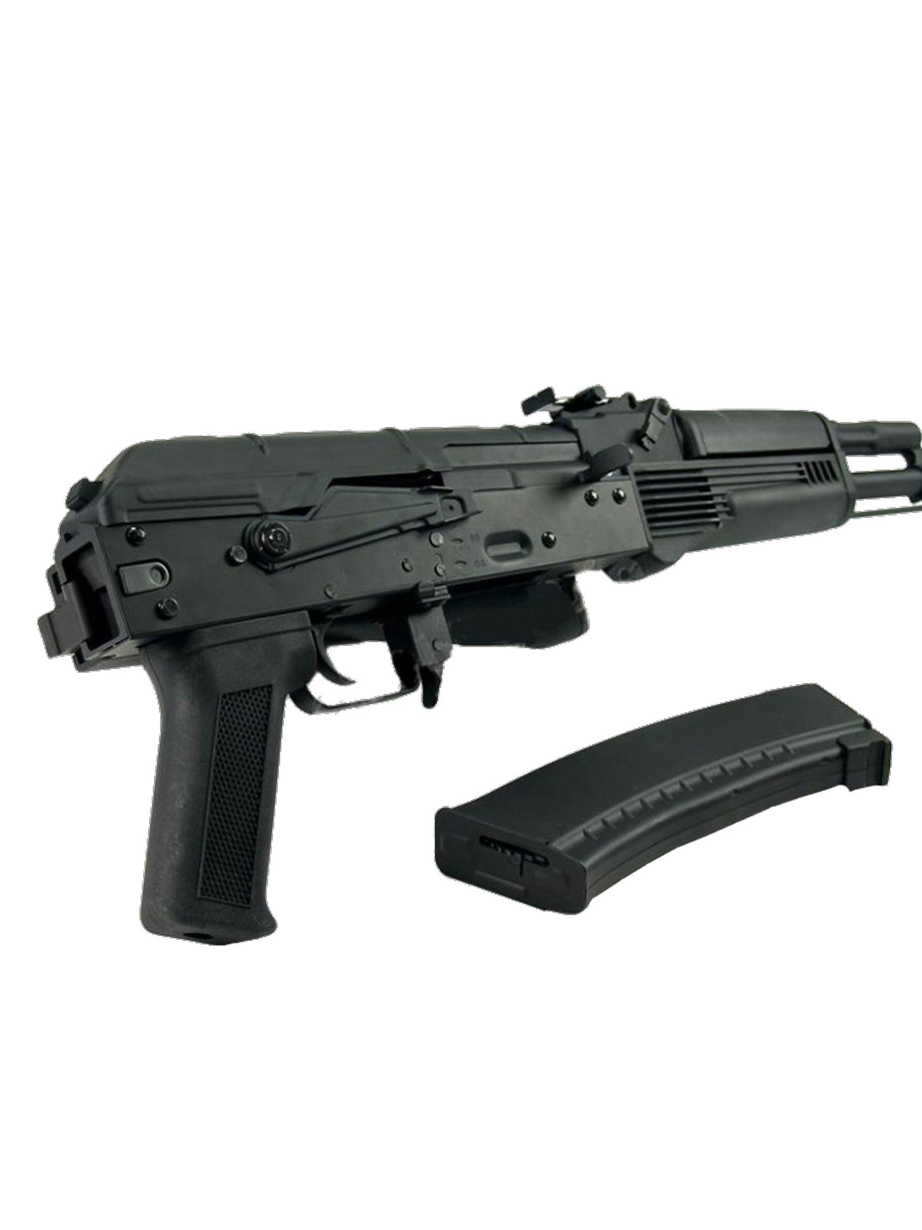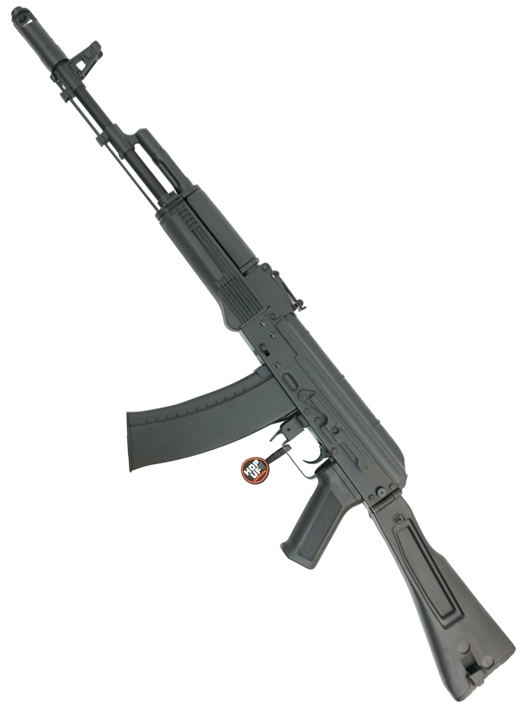 Страйкбольный автомат Cyma АК-74М (CM040C) – электропневматическая модификация отечественного автомата, выполненная специалистами популярного бренда пневматики. Привод отличает металлический корпус и высокое качество сборки. Стреляет автомат шариками из пластика весом 0,2 г. Здесь используется металлический гирбокс производства этого бренда и регулируемая камера Hop-up, подкручивающая шарики в полете.