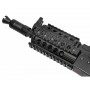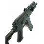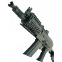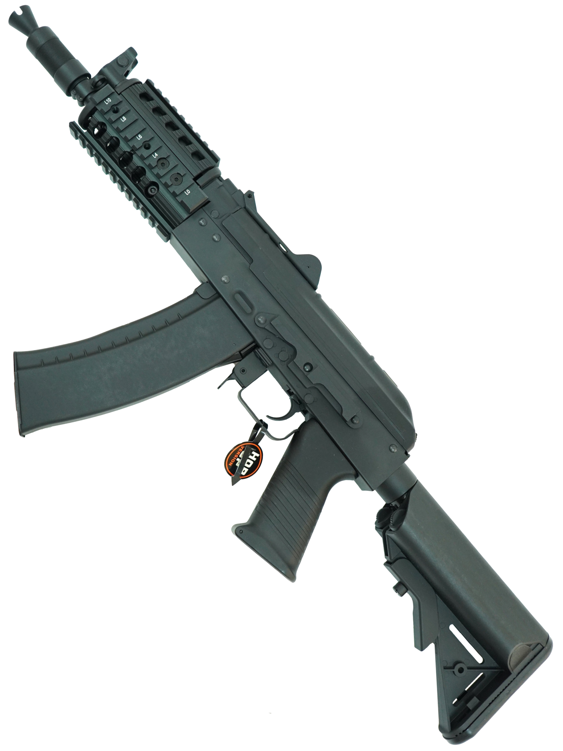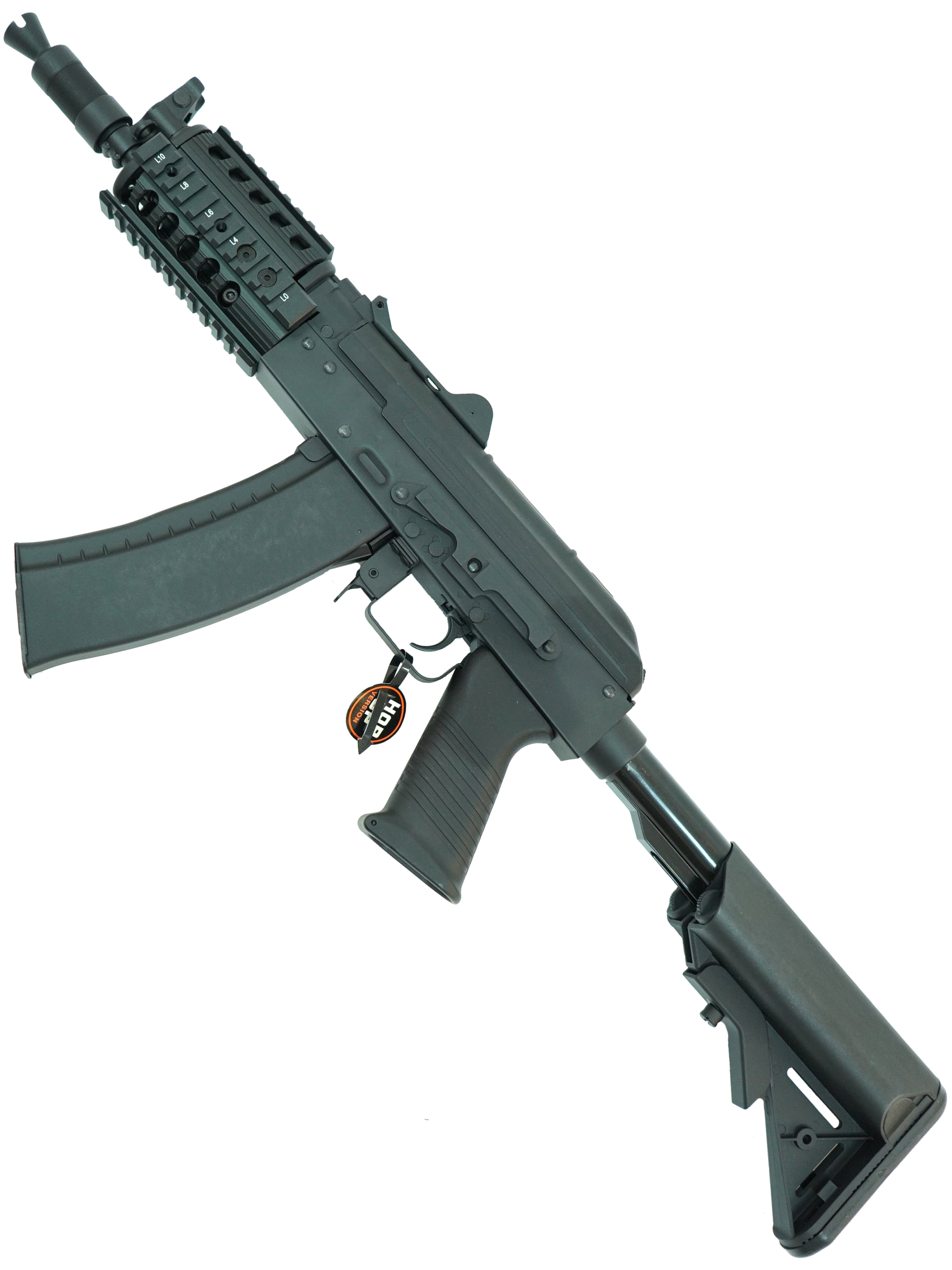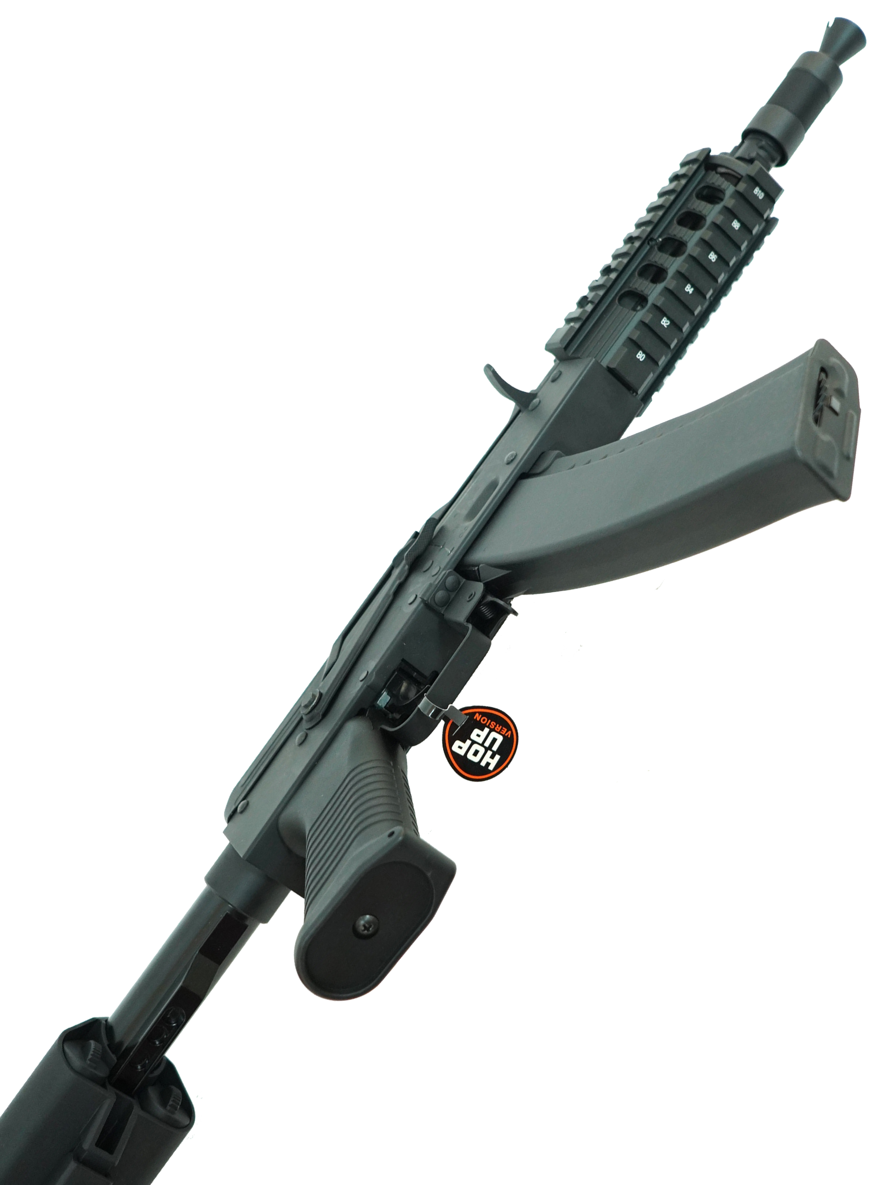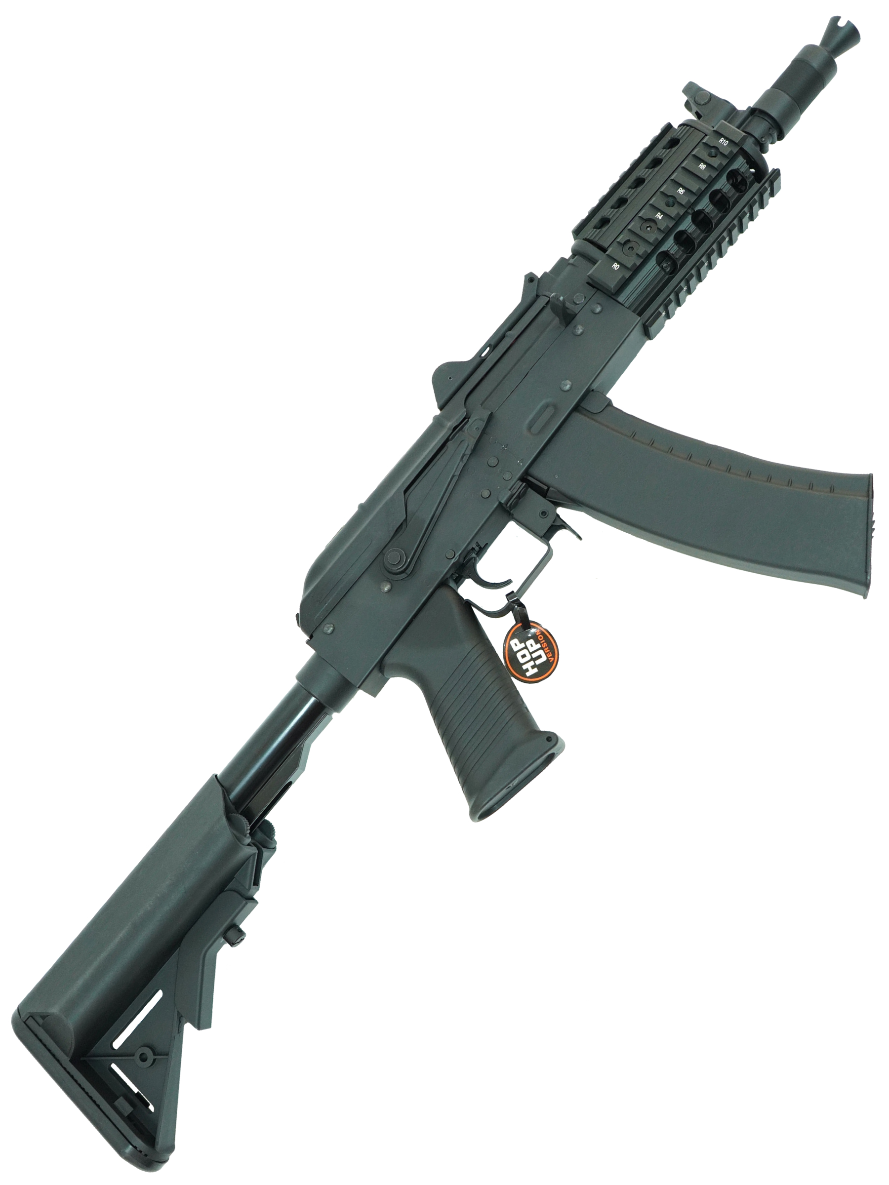 Страйкбольный автомат Cyma АКС-74У, приклад M-серии (CM040H) – это электропневматическая копия боевого АКС-74У, модификация с тактическим обвесом и телескопическим прикладом. Привод получает питание от никель-металлгидридного аккумулятора 1100 mAh с напряжением 8,4 V. В гирбоксе версии 3 создается давление, сообщающее шарикам ВВ – 0,2 г энергию, а регулируемая система хоп-ап обеспечивает стабильность шарика после вылета из ствола и влияет на кучность стрельбы.