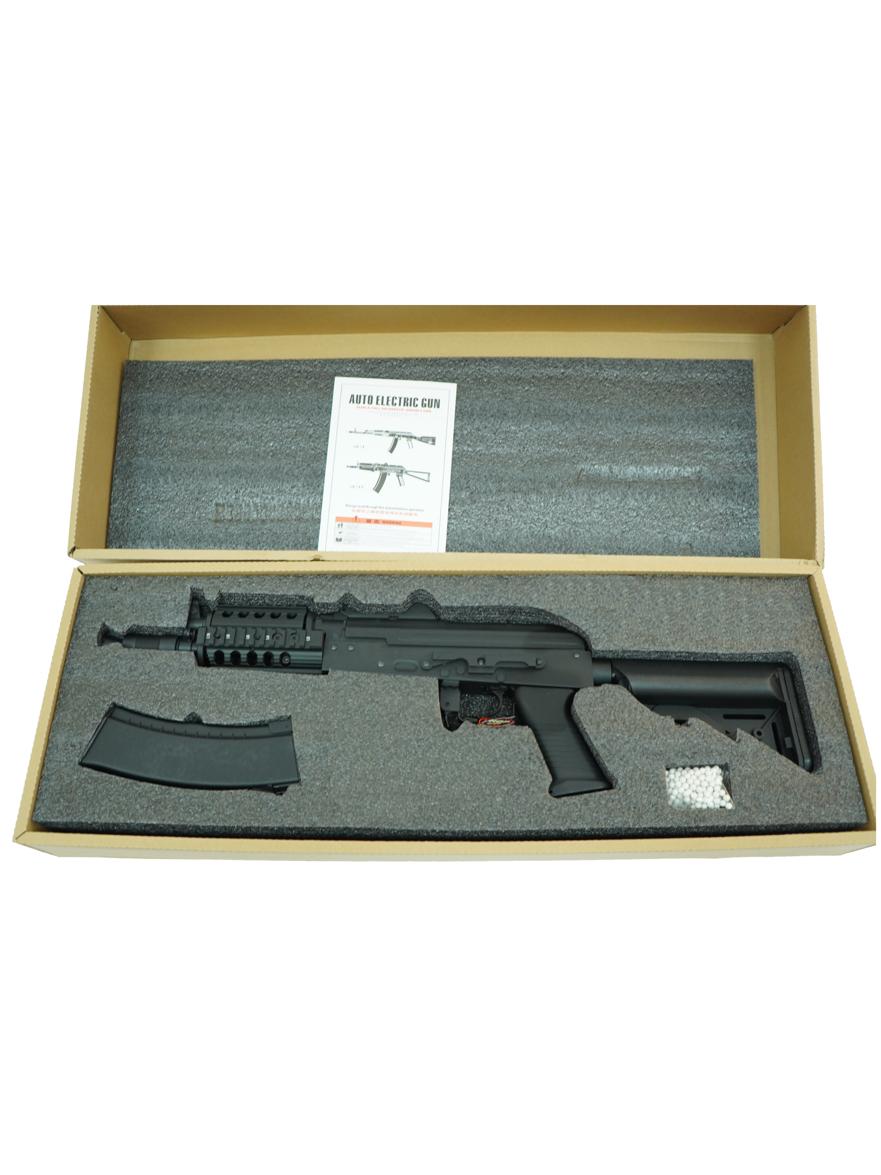 Наличие тактического цевья с направляющей позволяет расширить возможности привода, установив разнообразное снаряжение. Приклад телескопический, настраивается под каждого стрелка за счет пяти позиций фиксации. Автомат будет идеален для игр в замкнутых пространствах зданий. Основной материал – сталь, цевье и внешний ствол из алюминиевого сплава, пистолетная рукоять и приклад изготовлены из ABS-пластика.