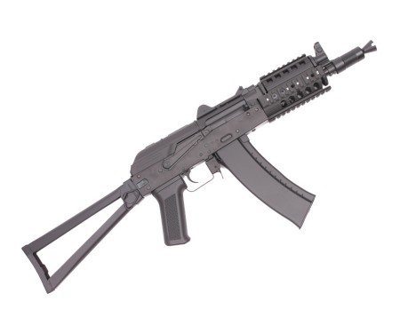 Характерной особенностью привода Cyma АКС-74У является наличие RIS-цевья, что позволяет использовать с ним фонарик, ЛЦУ или тактическую рукоятку. Кроме того, предусмотрена направляющая для оптики. Присутствует съемный пламегаситель, приклад складного типа. Основные материалы – сталь и алюминиевый сплав, из пластика здесь изготовлена только пистолетная рукоять. Вес 3 кг, длина 72 см. Продается автомат в комплекте с магазином, набором шариков ВВ, шомполом, аккумулятором с ЗУ и подробной инструкцией.