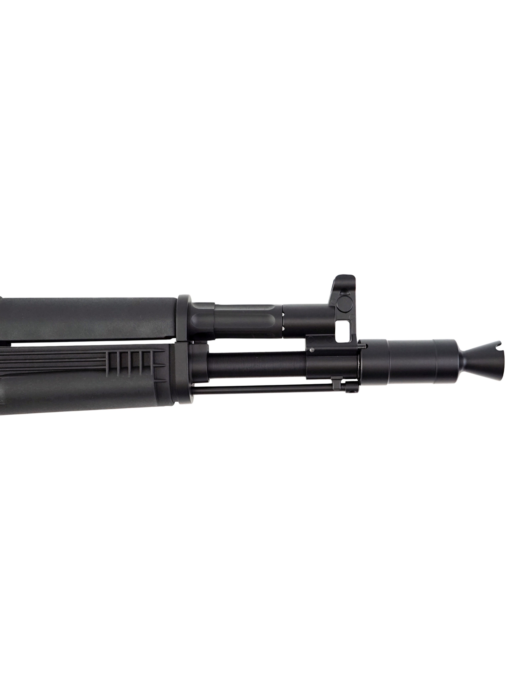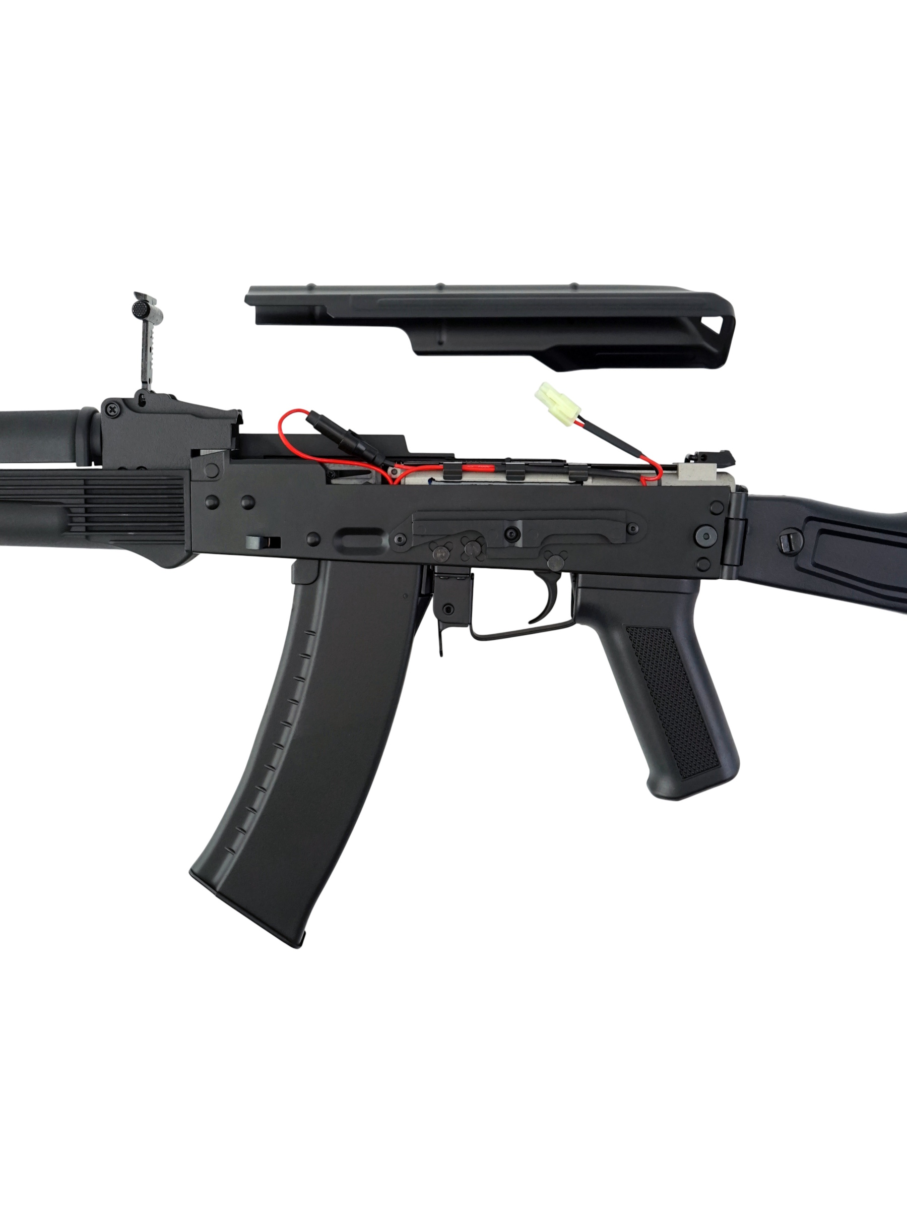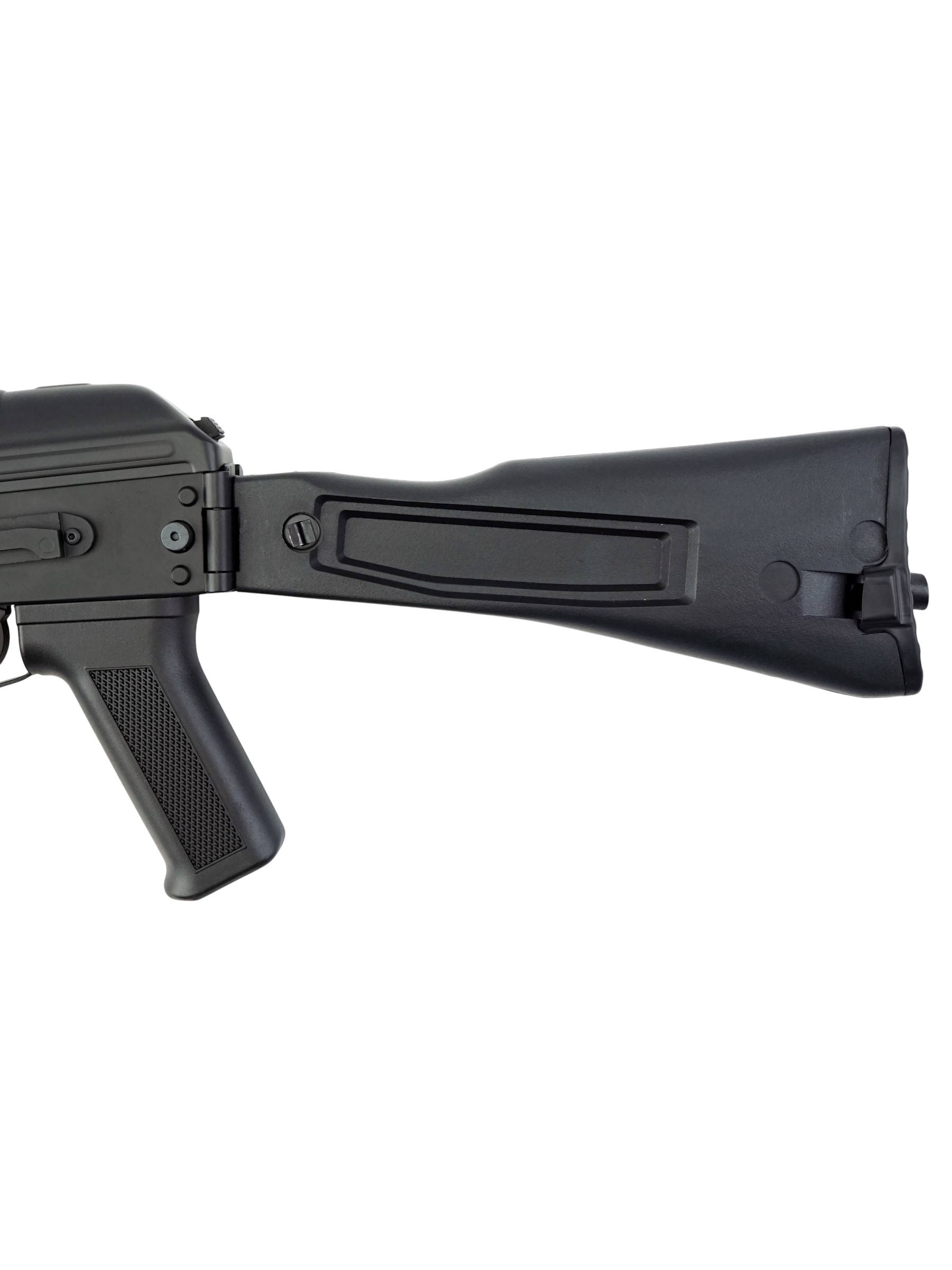 Складывание приклада выполняется влево, предусмотрен специальный зацеп для его фиксации. Кроме того, имеется место для пенала с принадлежностями для чистки оружия. Кнопка, снимающая приклад с фиксации, расположена на тыльнике. Привод изготовлен из стали и алюминиевого сплава, ABS- пластик используется для приклада и цевья. Весит автомат 2,8 кг, максимальная длина с прикладом 82 см. Поставляется в фирменной коробке вместе с магазином, зарядным устройством и аккумулятором, шомполом, набором шариков и паспортом изделия.