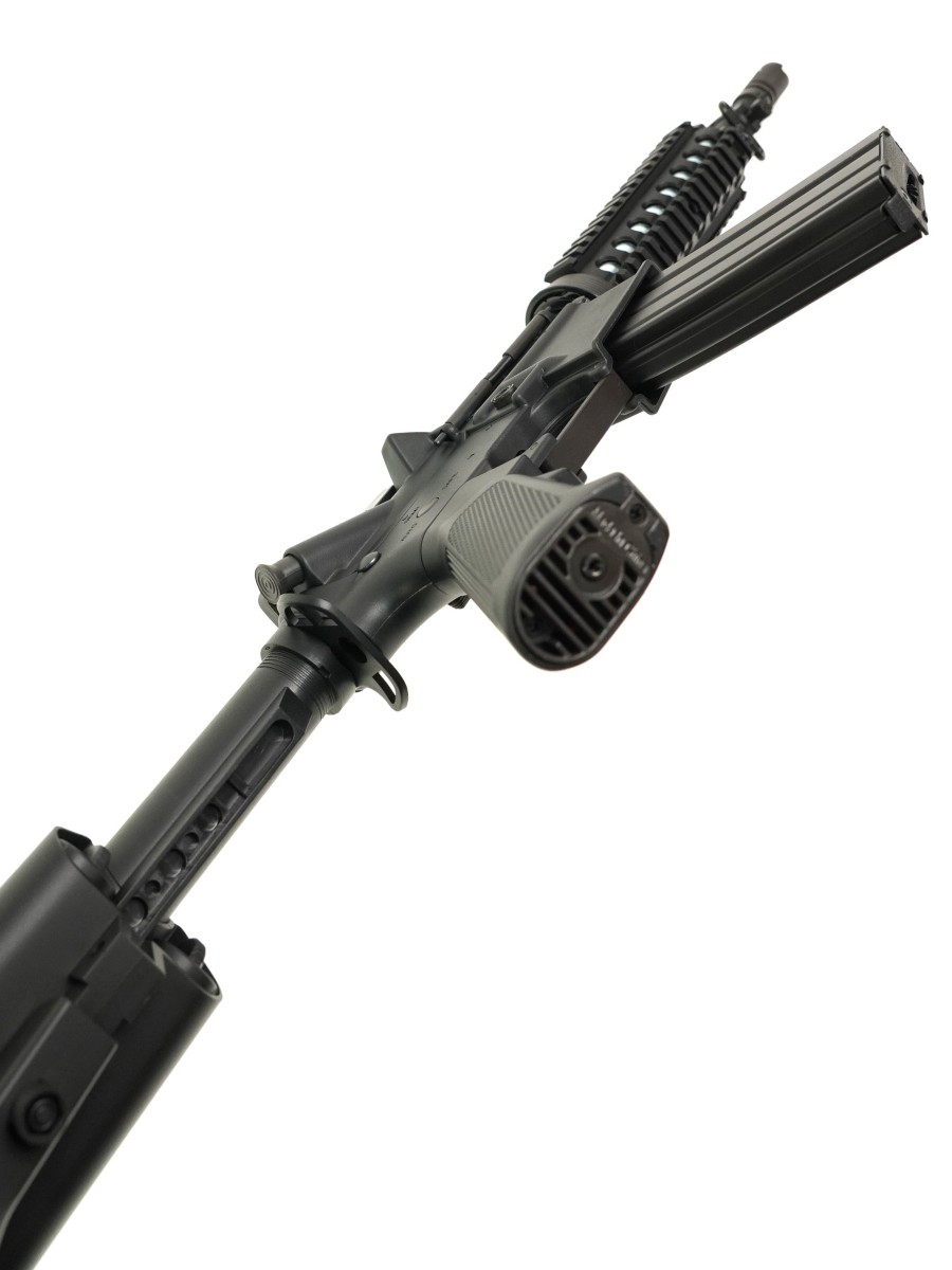 Пистолетная рукоятка имеет анатомическую форму, обеспечивая удобное удержание автомата в руках. Наличие антабок позволяет использовать плечевой ремень. Длина автомата 77,5 см, вес 1,9 кг.