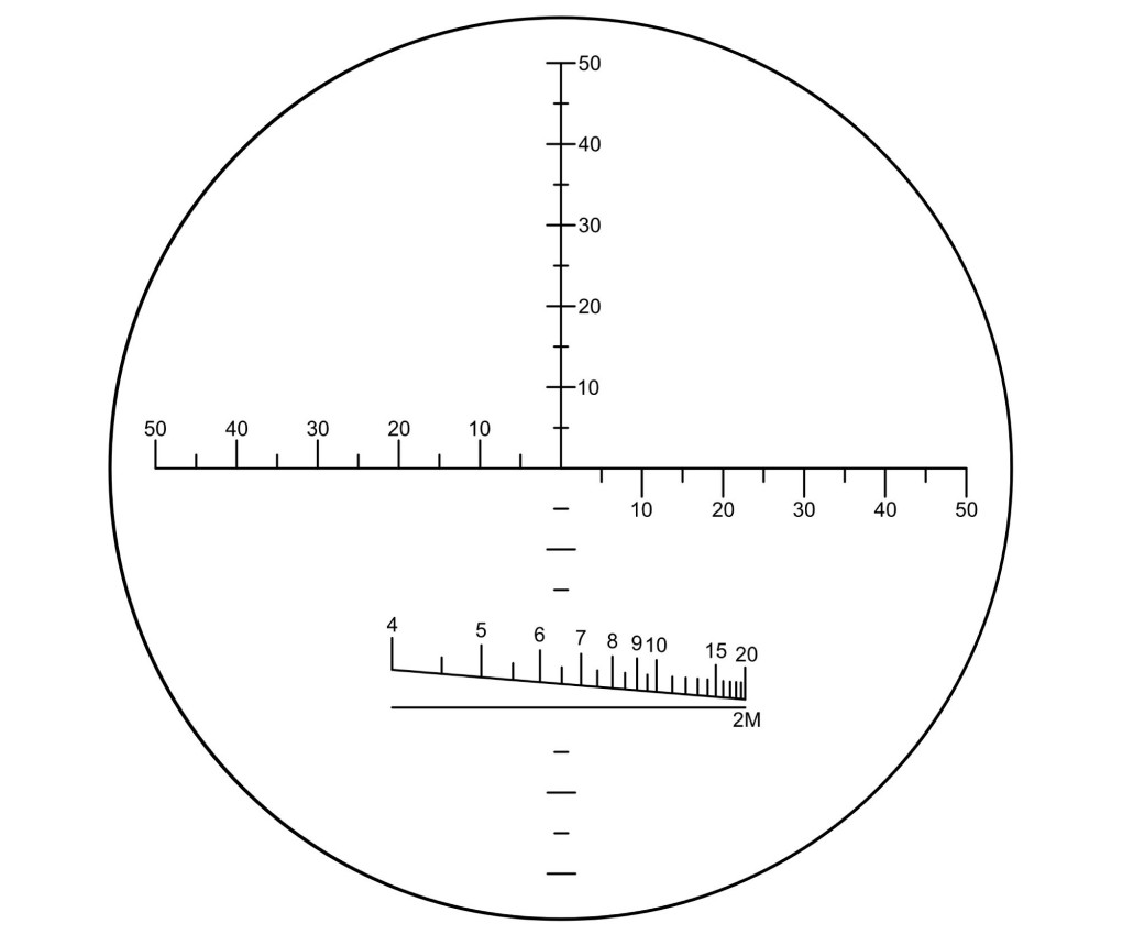 Тактическая измерительная сетка видна в левом окуляре бинокля и представляет собой комбинацию из угловой и дальномерной измерительных сеток.
