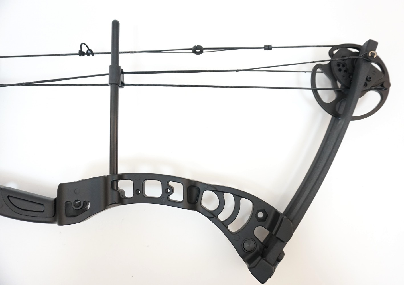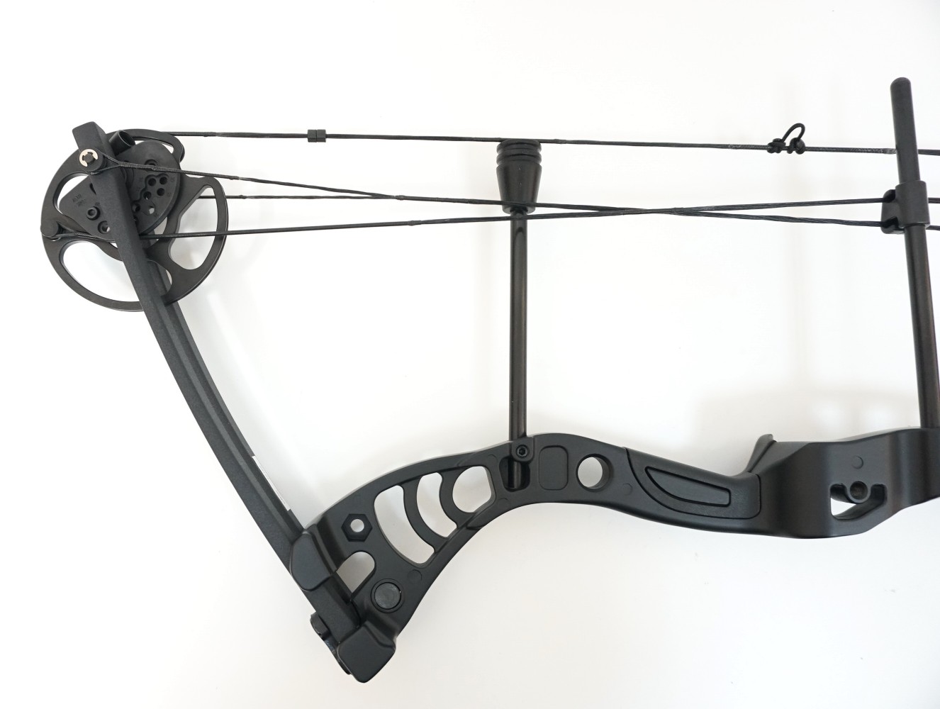 Рукоять лука MK-CB50 BK выполнена из сплава алюминия, за счет чего модель отличается легким весом – всего 1,4 кг. Плечи – из фибергласса, представляют собой две параллельных пластины. Эксцентрики выполнены из прочного полимера. На рукоятке предусмотрены крепежные места для отводящей штанги, полочки, прицела и штанги-успокоителя тетивы. Встроенная мушка регулируемого типа.