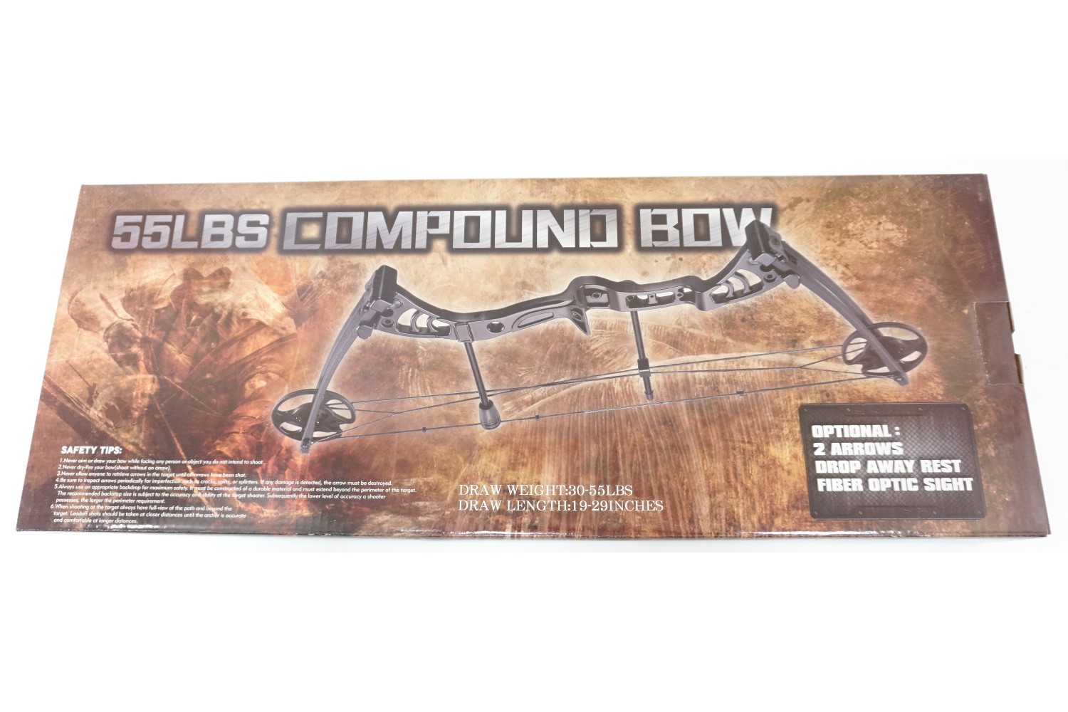 Длина лука 76 см. Изделие выполнено в черном цвете. На выбор два типа комплектации: в базовой – только лук, в полной комплектации – две стрелы, прицел с 3-мя пинами, релиз, пип-сайт, полочка, воск. Лук упакован в картонную коробку.