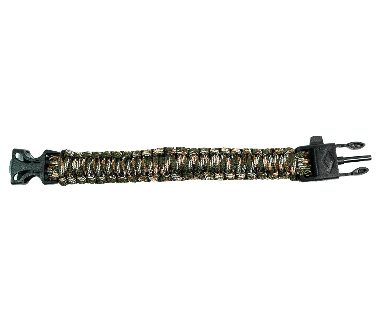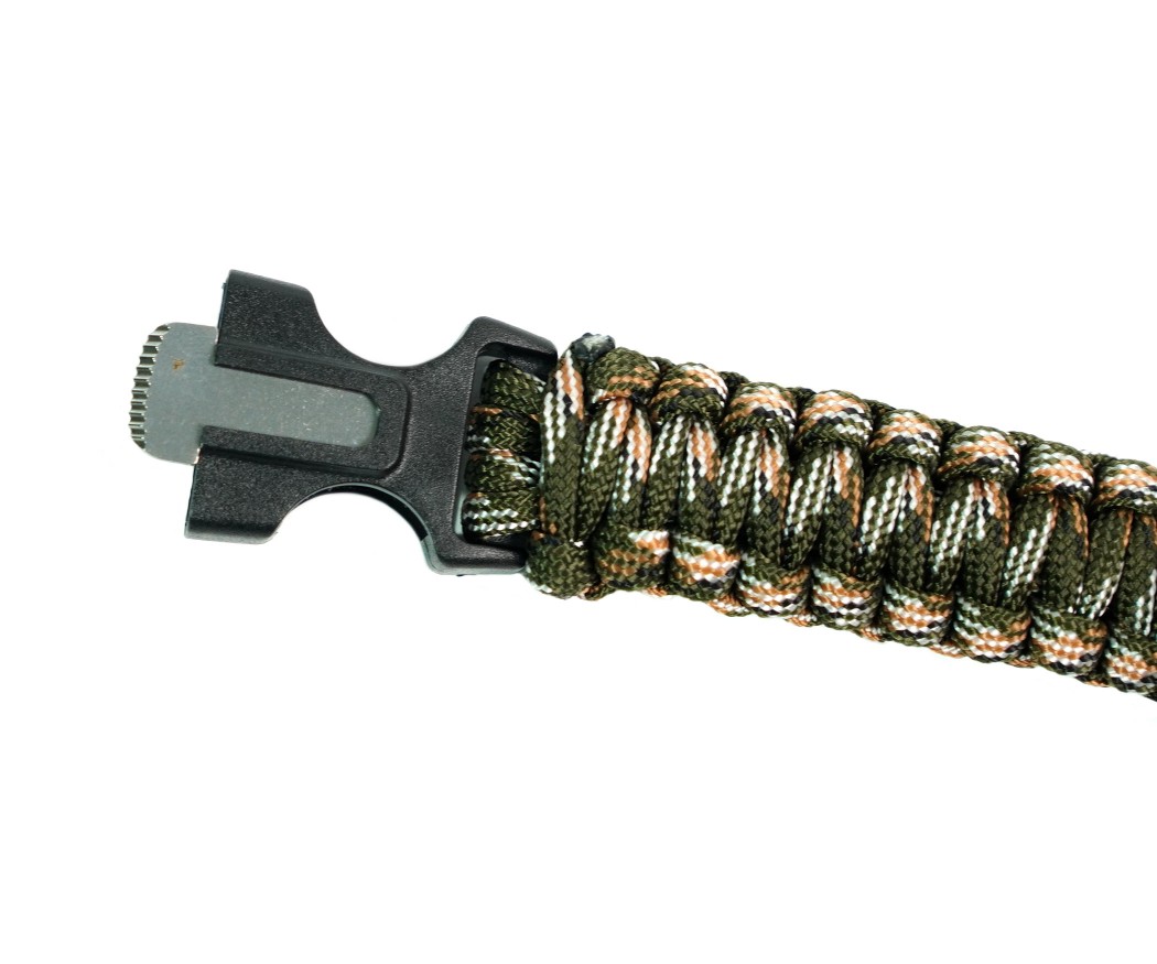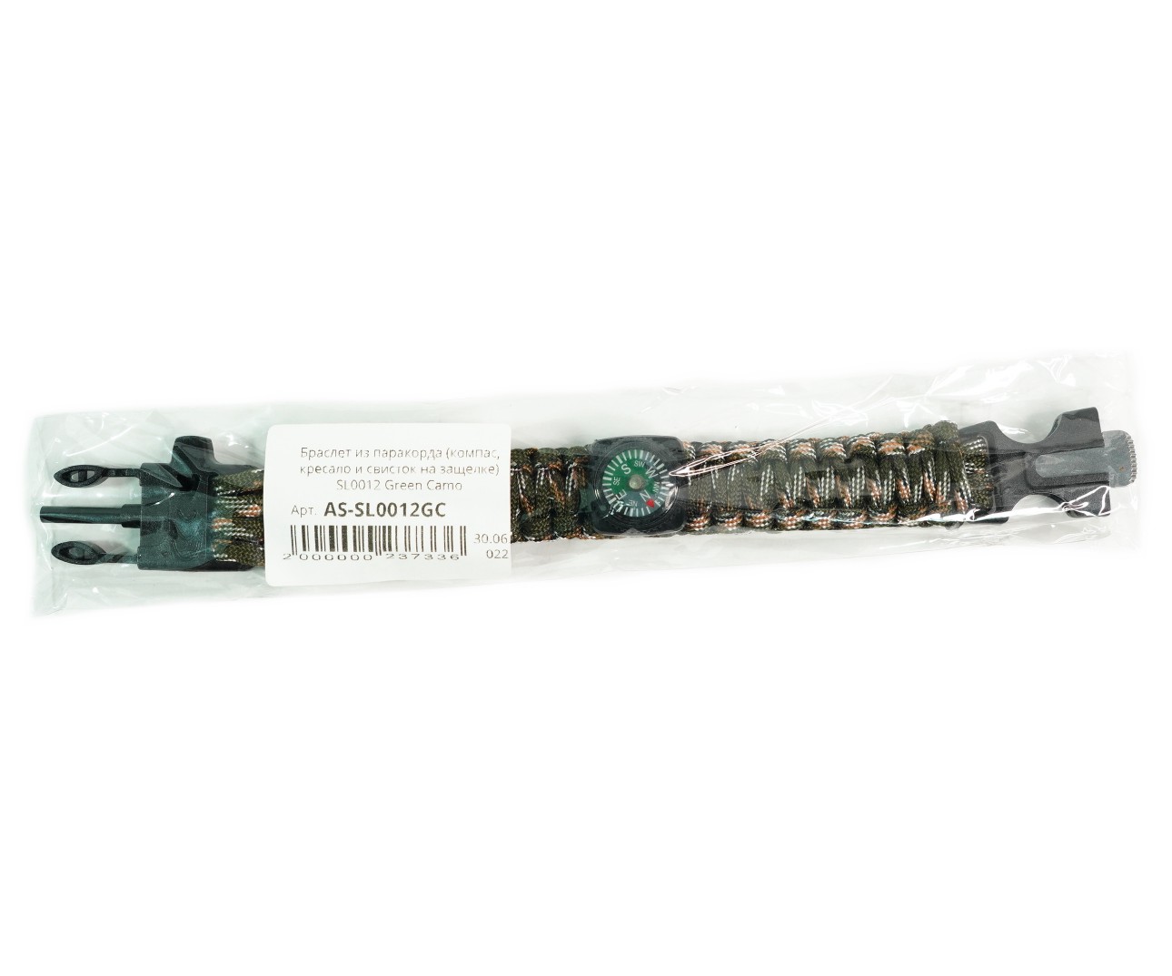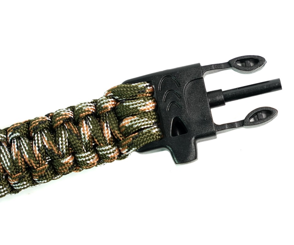 Можно носить на руке в сплетенном виде, или расплести и получить шнур-корд, которым можно закрепить вещи, соединить такелаж, и т.д. Помимо шнура, включает в себя кресало, компас и свисток для подачи звукового сигнала.