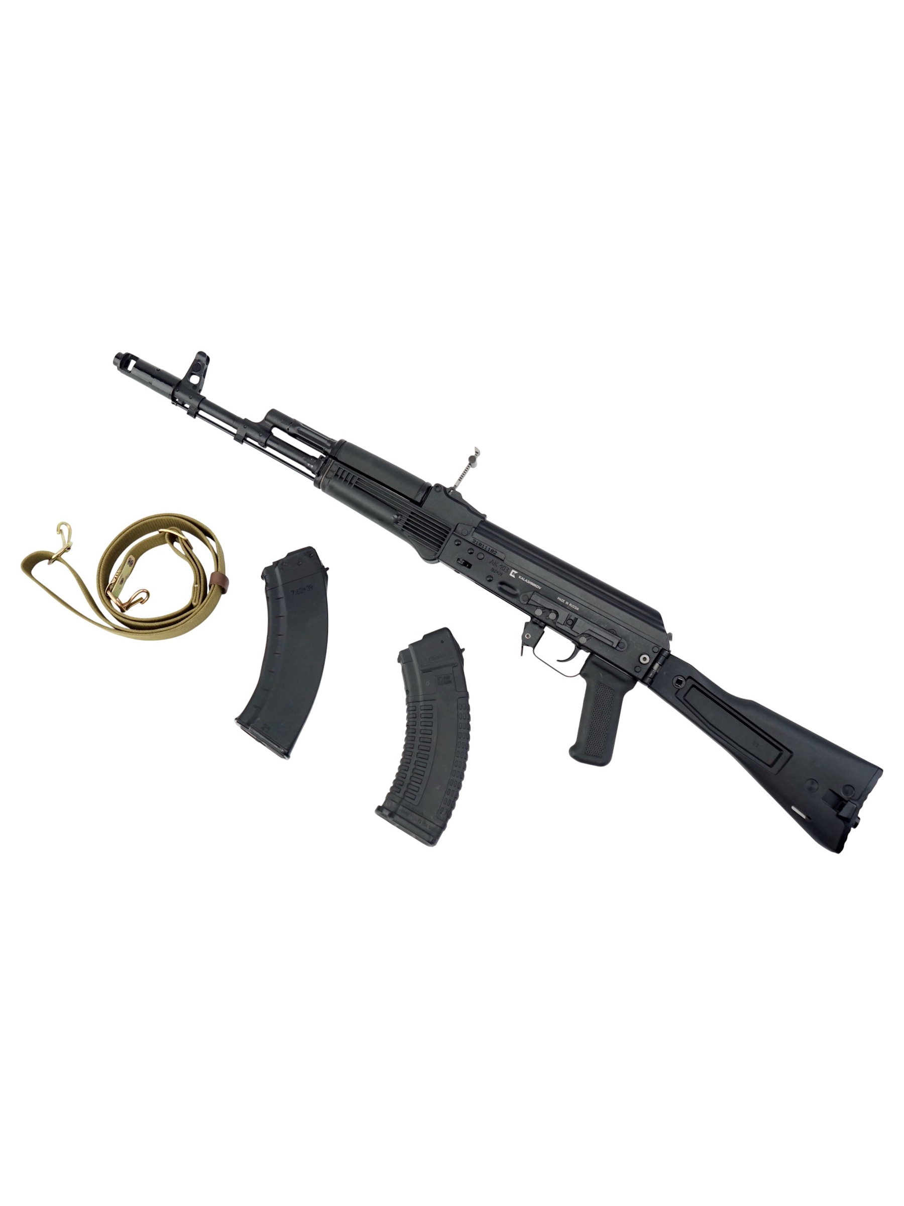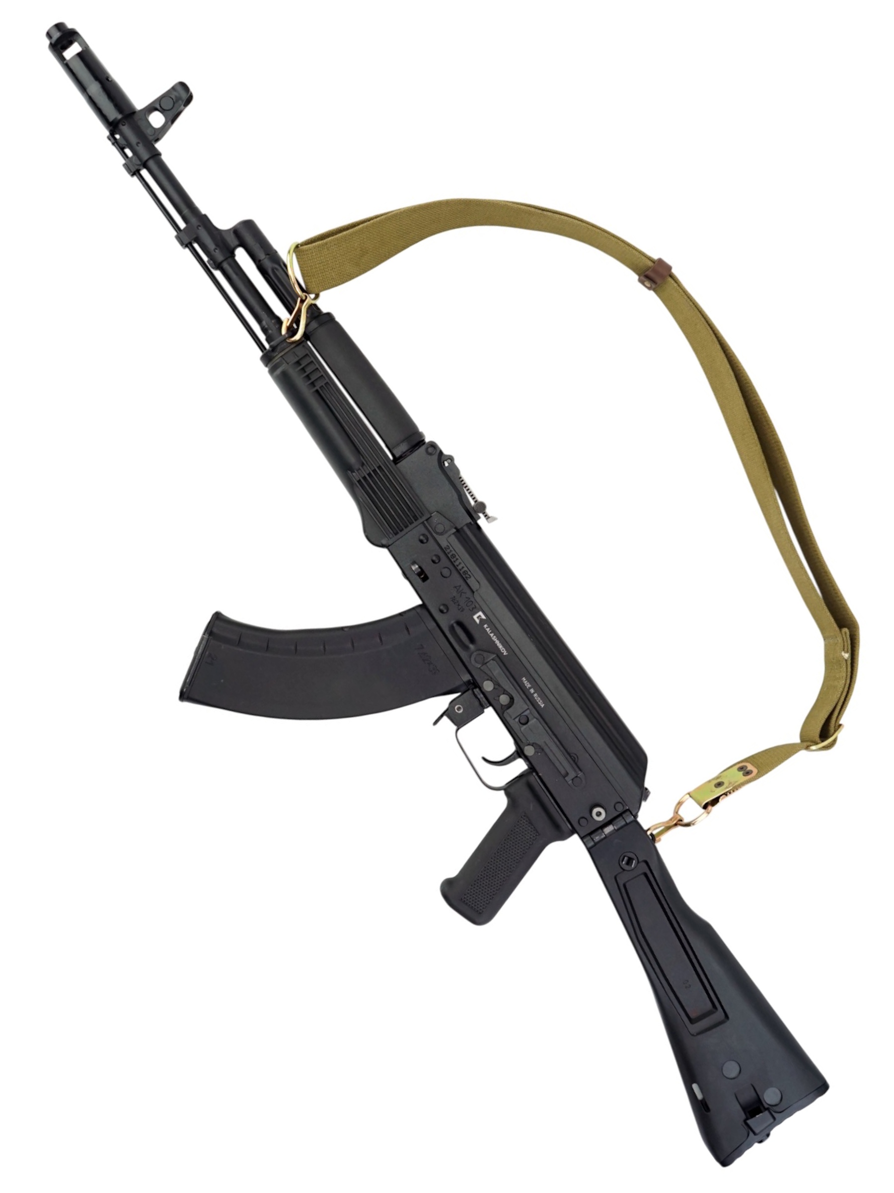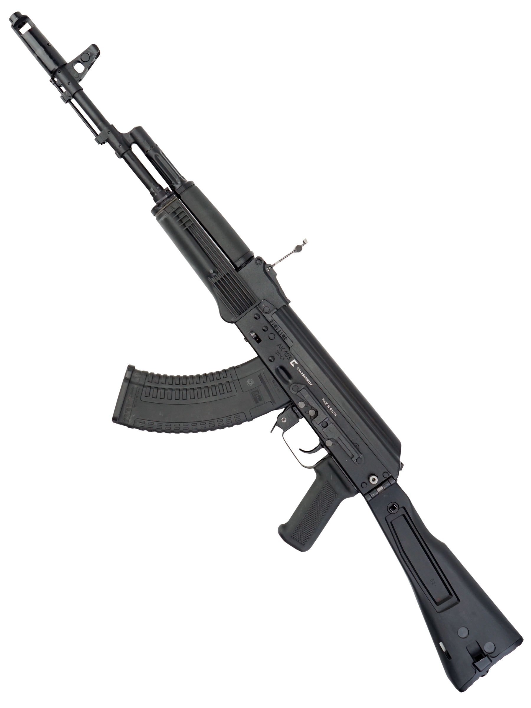 Автомат Калашникова АК-103 является экспортной модификацией штатного автомата Российской армии АК-74М. Главным (и фактически единственным) оличием АК-103 от АК-74М является калибр - этот автомат "сотой" серии использует патроны калибра 7.62 мм (7.62х39 М43) и соответствующие магазины (совместимые с магазинами более старых автоматов АК / АКМ), в остальном автоматы идентичны. В 2006 году значительное количесвто автоматов АК-103 (100 000 штук) было закуплено в Ижевске для Вооруженных сил Венесуэлы. АК103 является индивидуальным оружием армейских и специальных подразделений.