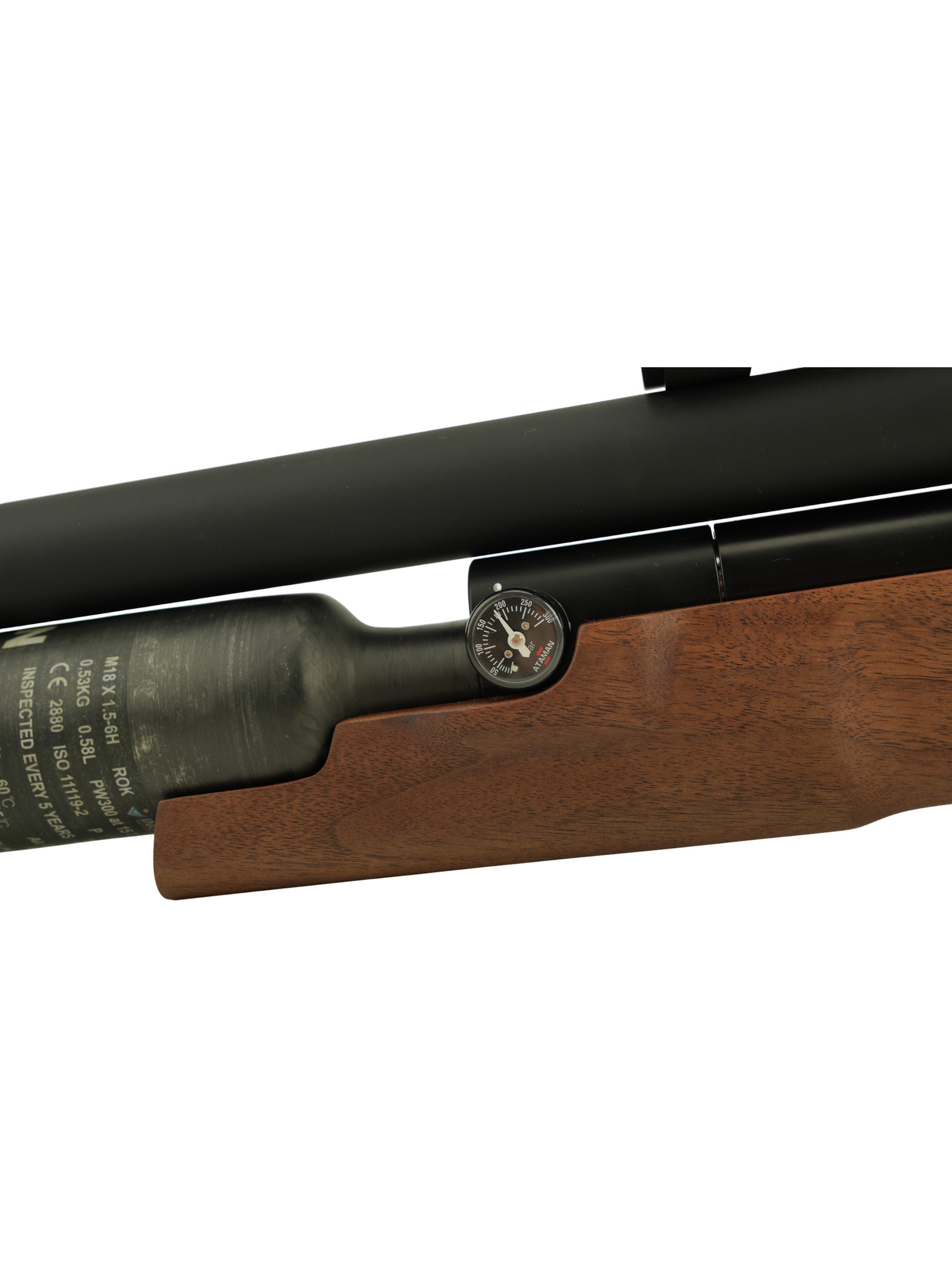 Данная модель представлена в калибре 6,35мм (.25), ложе выполнено из высококачественных пород дерева Орех (Walnut). Брендированная композитная колба объемом 480 см3, позволила увеличить кол-во возможных выстрелов с одной заправки. Рабочее давление колбы 310bar, проверочное 375bar.