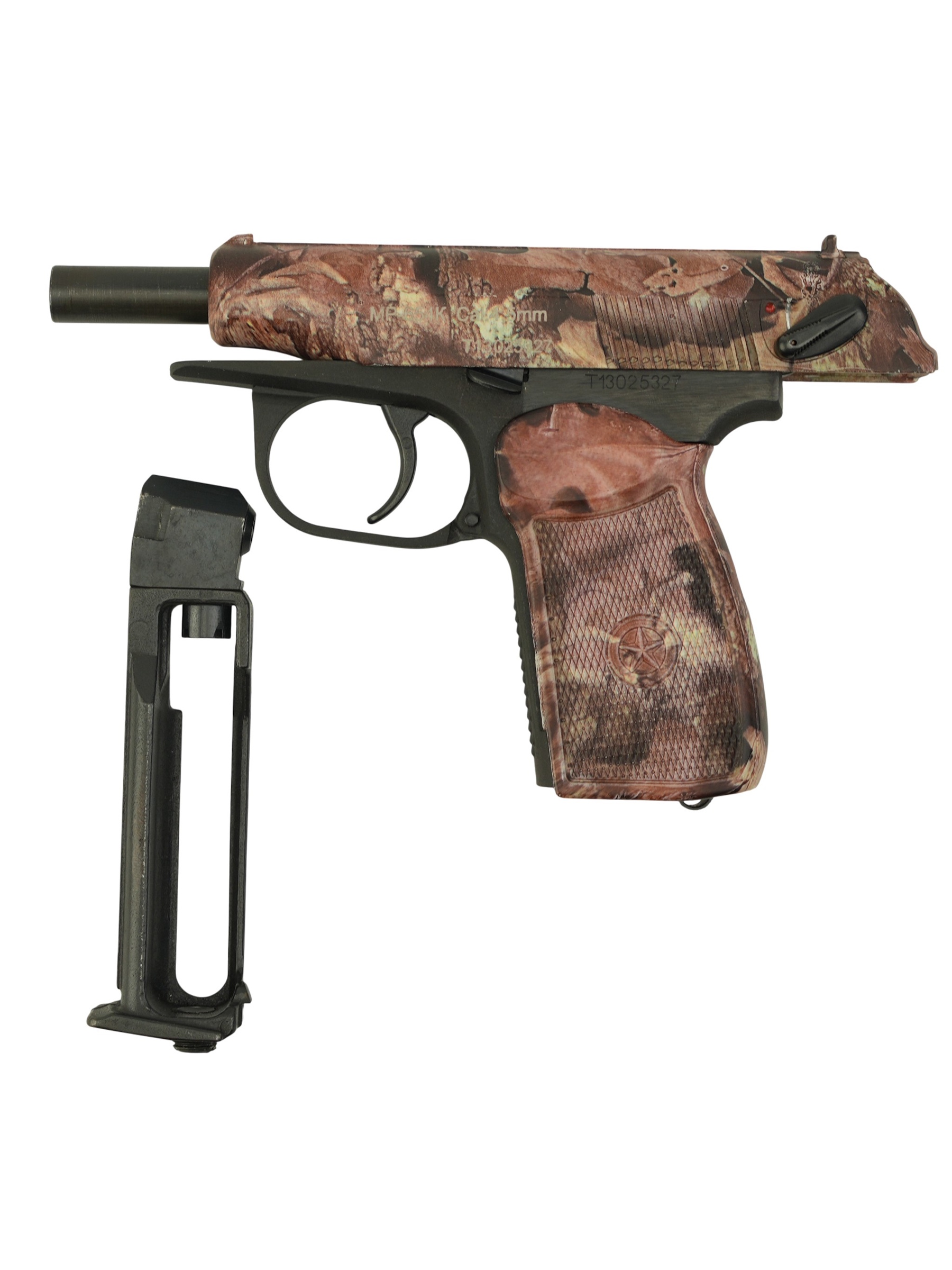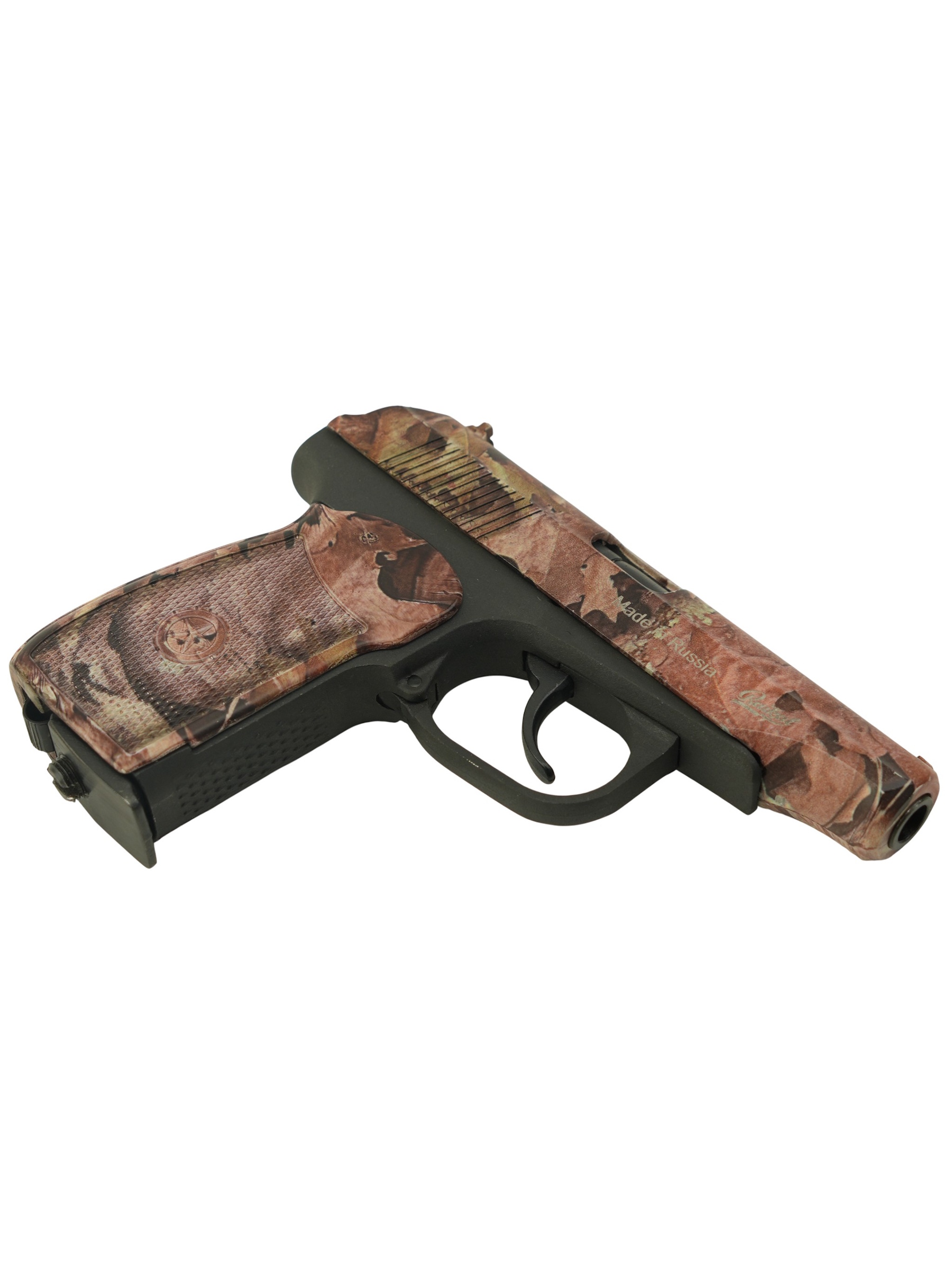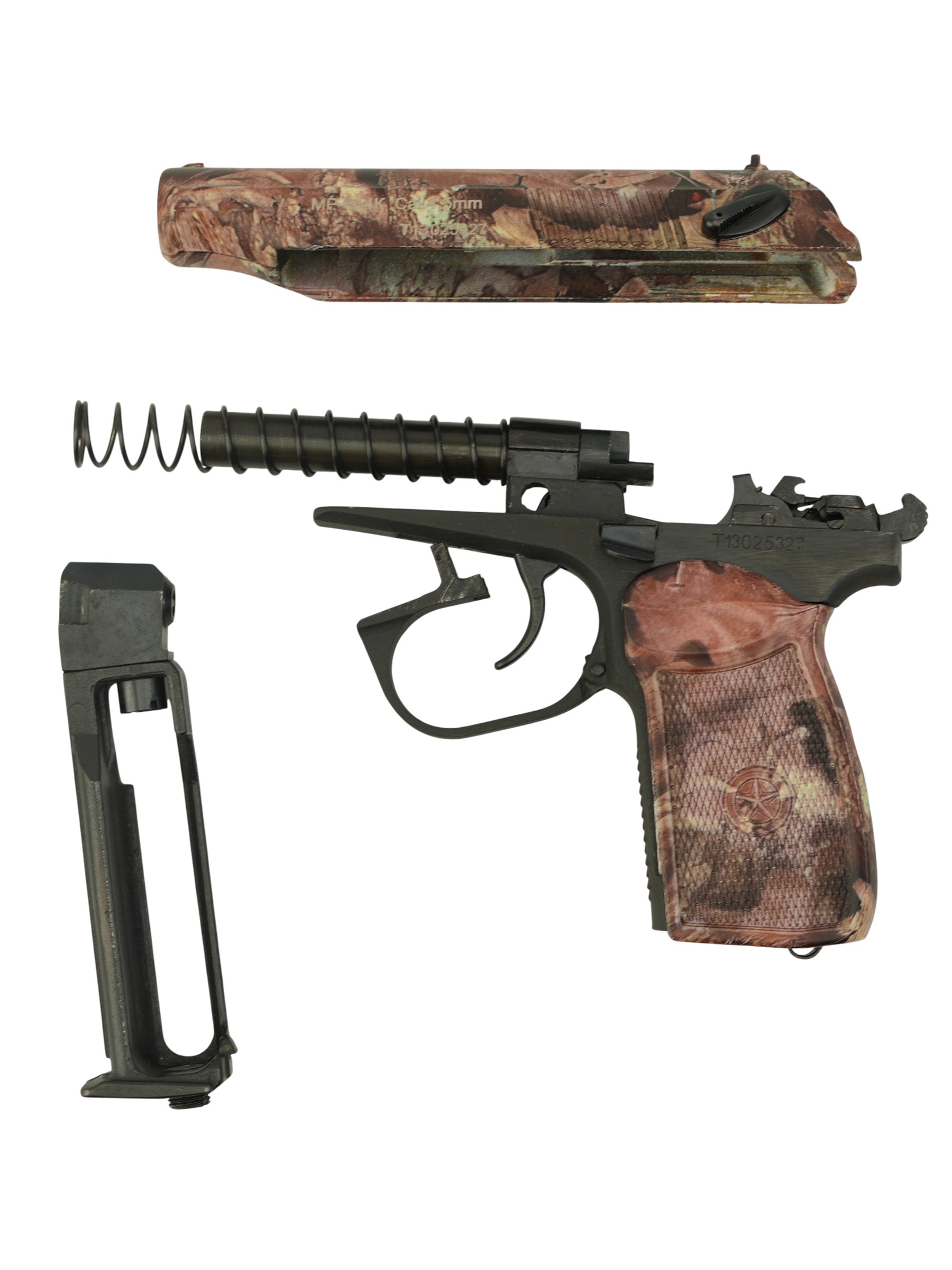МР-654К-23 - это еще одна газобаллонная копия всем известного пистолета Макарова. Пистолет сделан в необычном камуфляжном дизайне, что придает ему крайне интересный вид. На Ижевском механическом заводе когда-то производился оригинальный пистолет Макарова. Разумеется, работники данного завода знают как можно сделать пистолет очень похожим на огнестрельный и превосходно справляются с такой задачей.