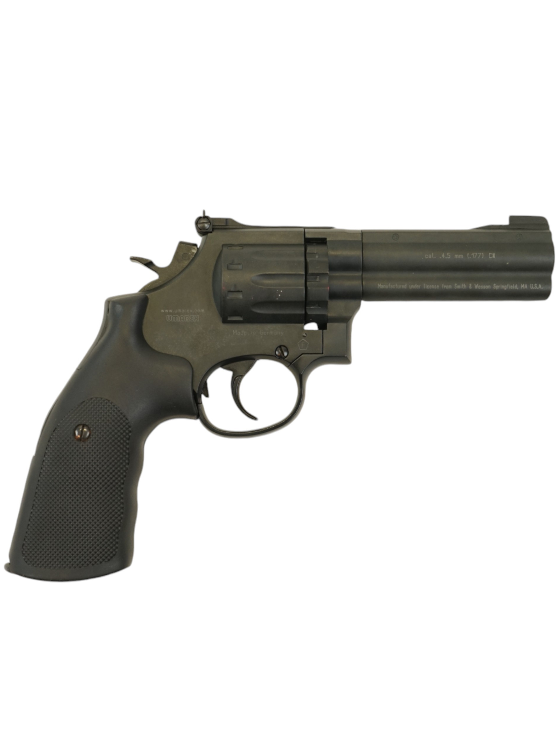 Модель револьвера Umarex Smith & Wesson 586, длина ствола которой 4 дюйма - это одна из моделей пневматических револьверов класса премиум от фирмы Umarex. Своими внешними данными эта пневматическая модель сходна с одноименным огнестрельным револьвером фирмы Smith & Wesson. Пневматический револьвер сделан из металлического сплава, масса его 1,1 кг. Потому, держа данный револьвер, не пропадает ощущение, что в руке настоящее оружие. Накладки на рукоятку сделаны из резинопластика, потому в руке данная модель револьвера сидит надёжно.