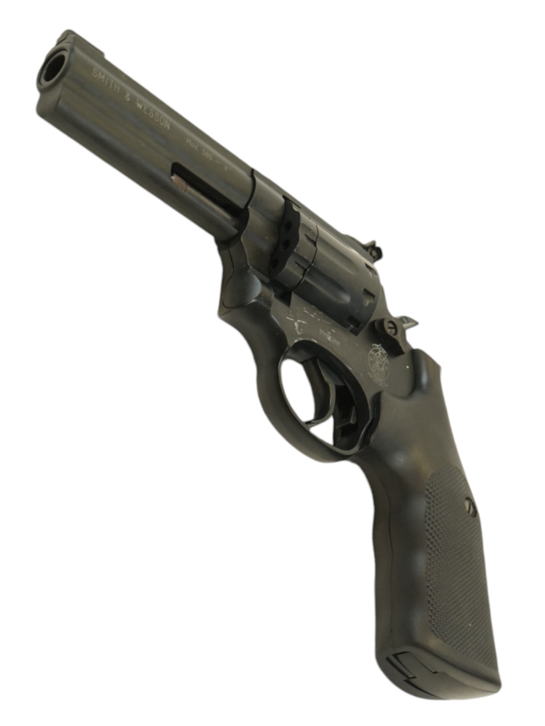 Металлические элементы Smith & Wesson 586 4" украшены чёрным матовым покрытием. Основная часть барабана сделана вместе с рамкой револьвера, это лишь имитация, вращающаяся же часть имеет вид клипа, снаряжающегося боеприпасами. Эта модель стреляет пулями из свинца, калибр которых 4,5, заряжаемыми в барабан-клип. Последний для зарядки откидывается влево. Сделан этот клип из металлического сплава, в него вмещаются 10 пуль. Баллон устанавливается в рукоять револьвера. Для получения доступа к отсеку для баллона надо снять правую накладку на рукояти.