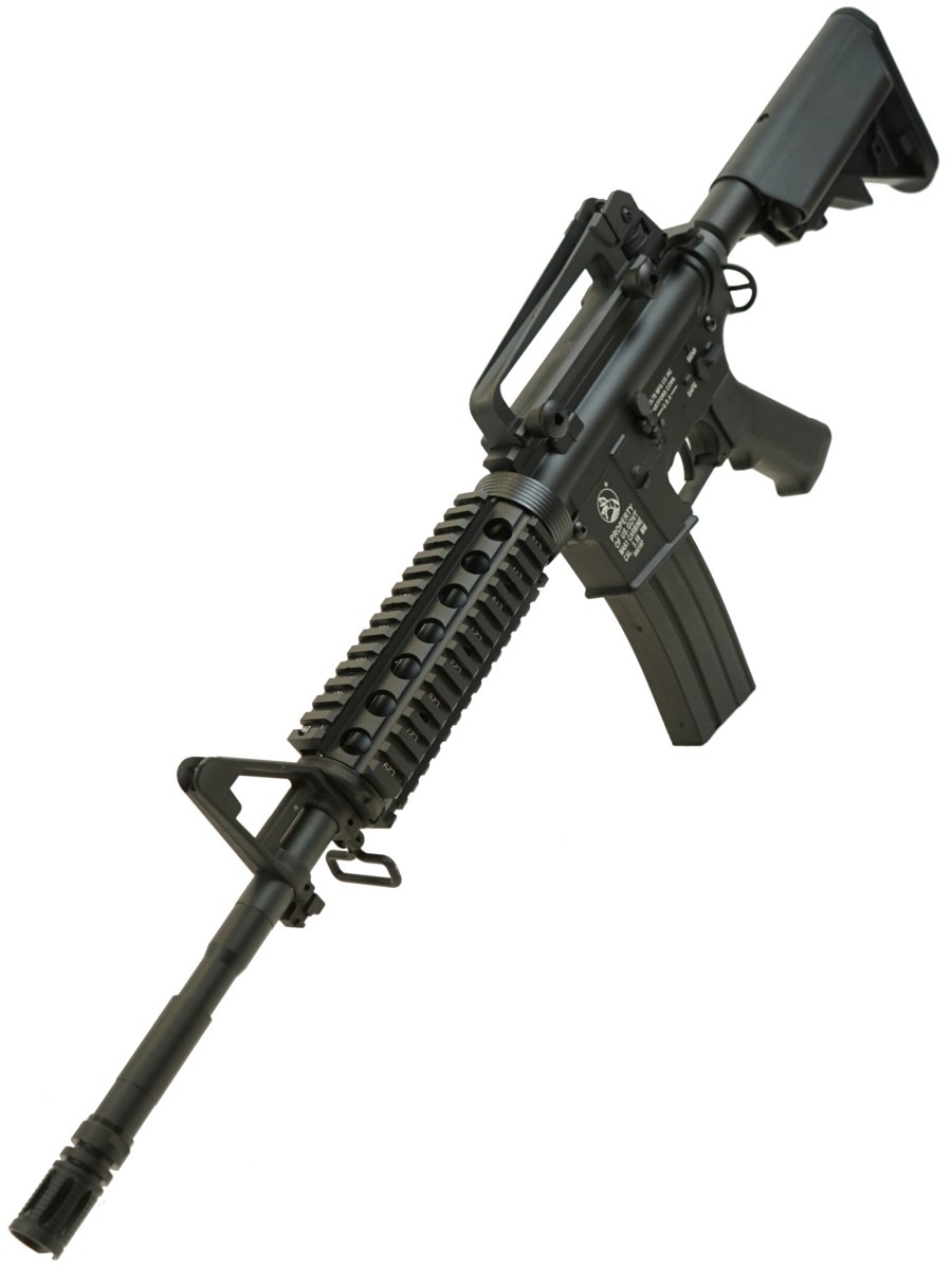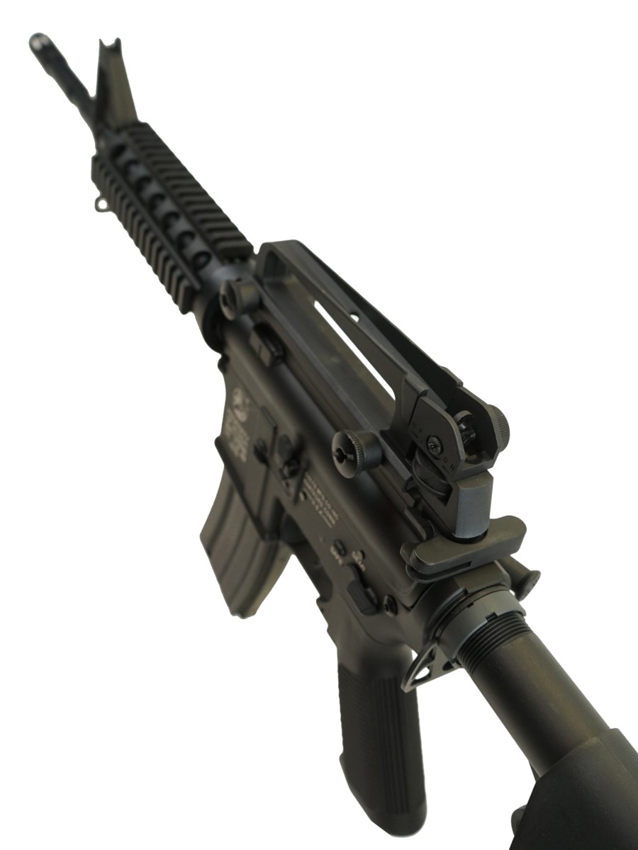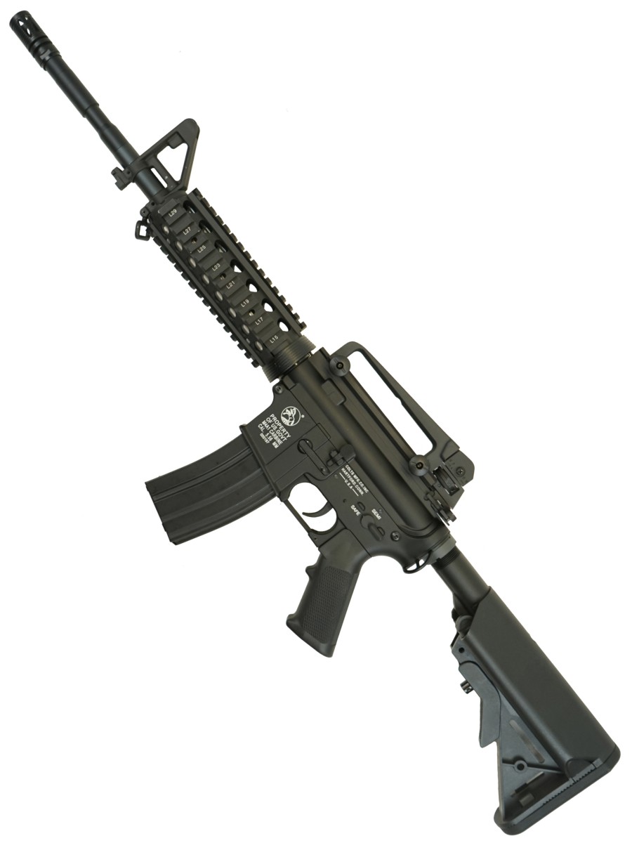 Страйкбольная копия карабина M4 RIS от фирмы East Crane, Гонконг. Корпус привода выполнен из алюминиевого сплава. Ствольная коробка состоит из двух половин: верхнего и нижнего ресиверов, которые соединяются двумя штифтами. К верхнему ресиверу крепятся ствол и цевьё, к нижнему - направляющая приклада и пистолетная рукоятка. Все соединения выполнены плотно и надёжно, люфты полностью отсутствуют. На крышке верхнего ресивера выполнена стандартная планка пикатинни, на которую можно установить практически любой коллиматорный или оптический прицел.