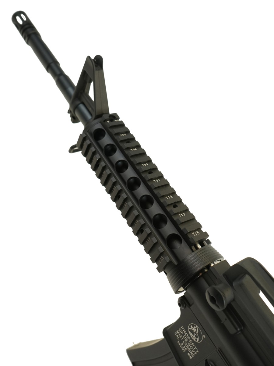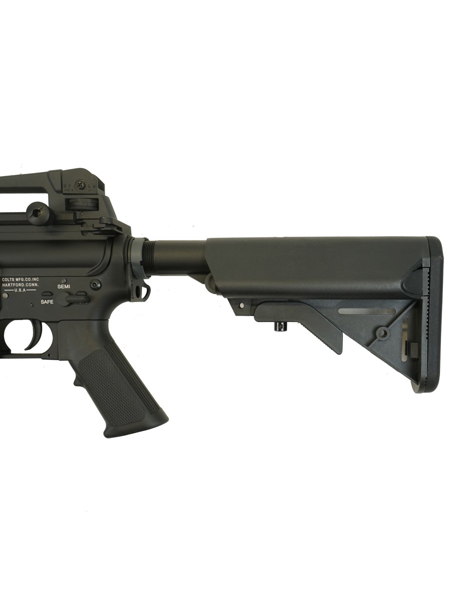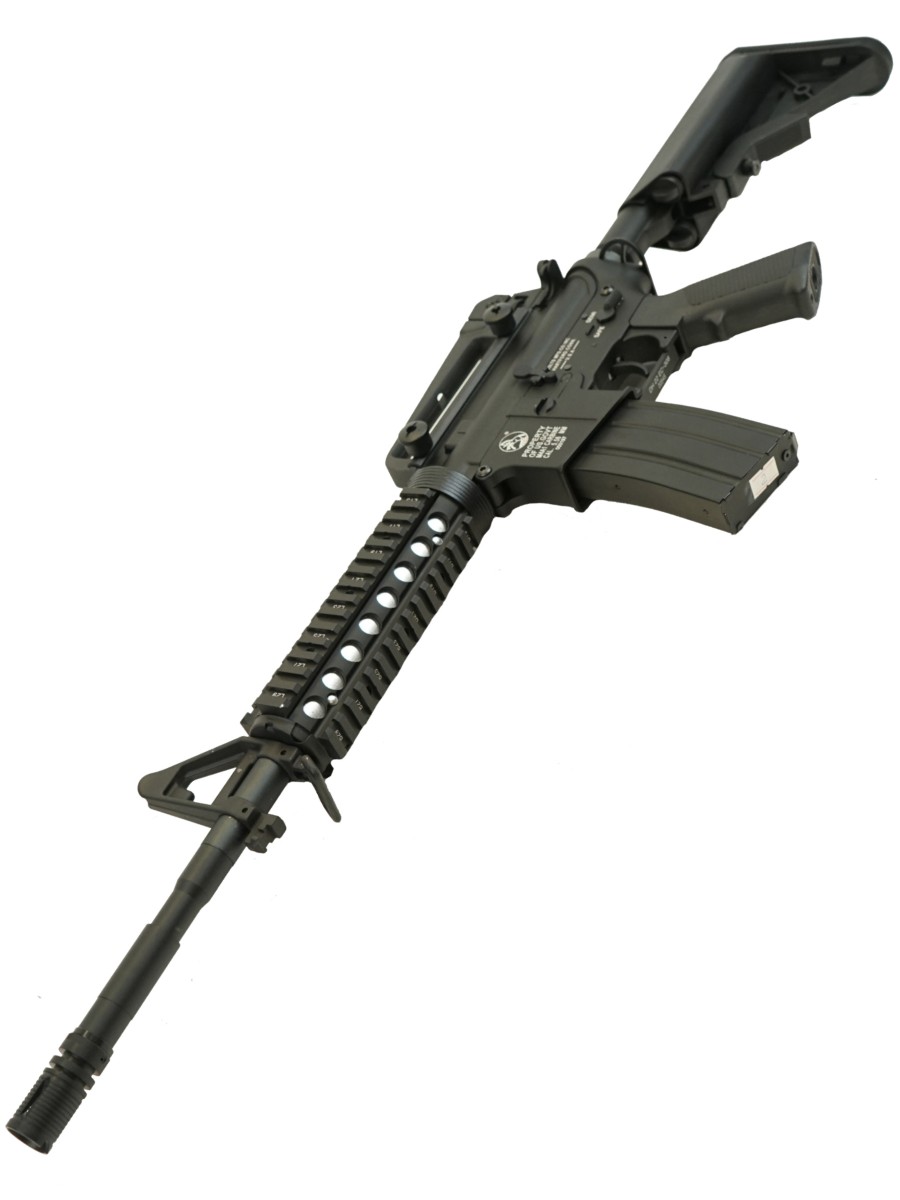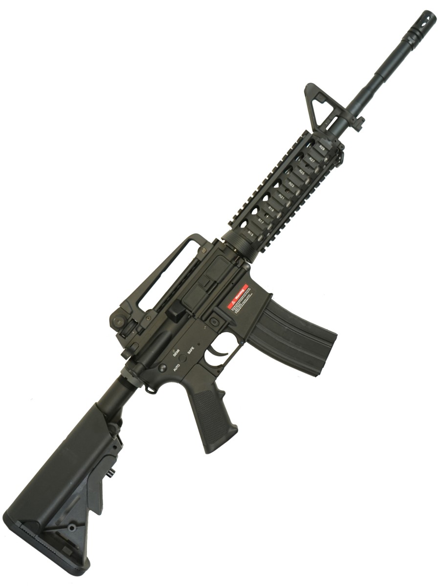 Страйкбольная копия карабина M4 RIS от фирмы East Crane, Гонконг. Корпус привода выполнен из алюминиевого сплава. Ствольная коробка состоит из двух половин: верхнего и нижнего ресиверов, которые соединяются двумя штифтами. К верхнему ресиверу крепятся ствол и цевьё, к нижнему - направляющая приклада и пистолетная рукоятка. Все соединения выполнены плотно и надёжно, люфты полностью отсутствуют. На крышке верхнего ресивера выполнена стандартная планка пикатинни, на которую можно установить практически любой коллиматорный или оптический прицел.