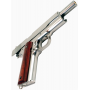 Пистолет изготовлен из металла – это основной материал, за счет чего такое вооружение будет долговечным и надежным. Накладки на рукоятку с фактурными насечками выполнены из пластика коричневого цвета. Цвет металла серебристый.