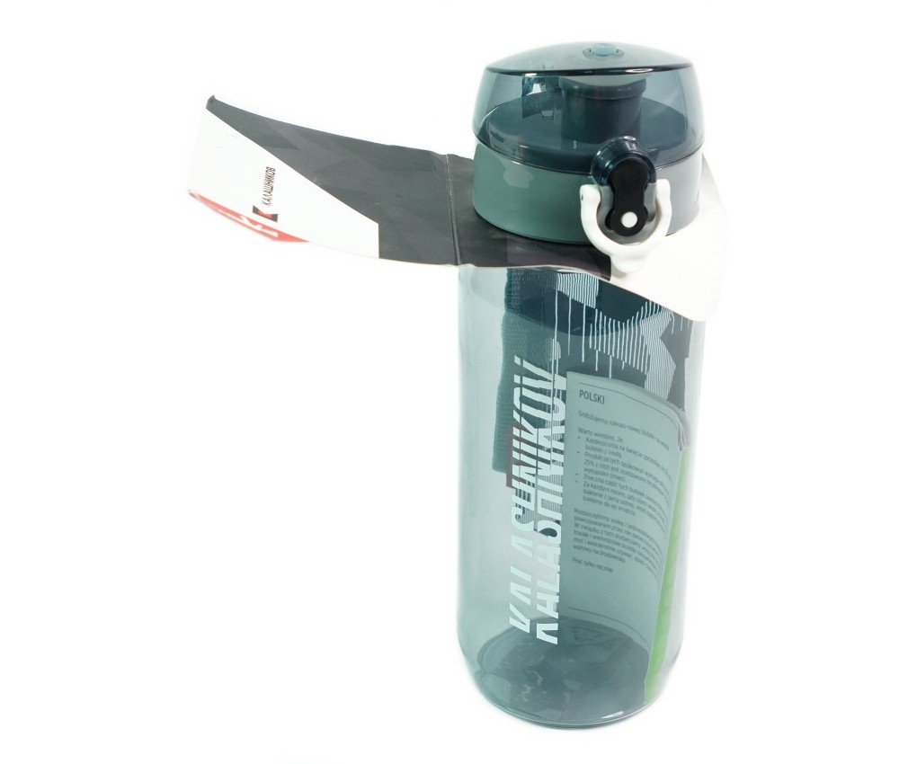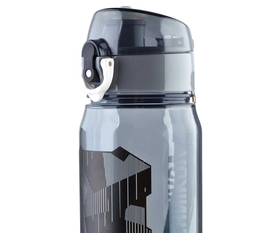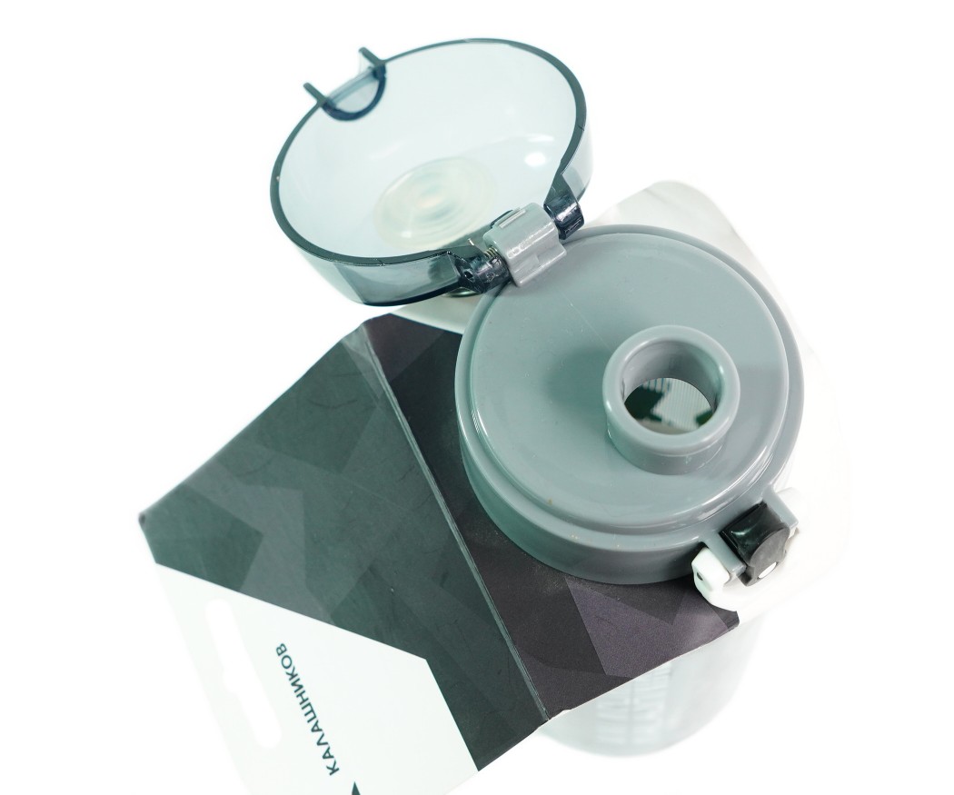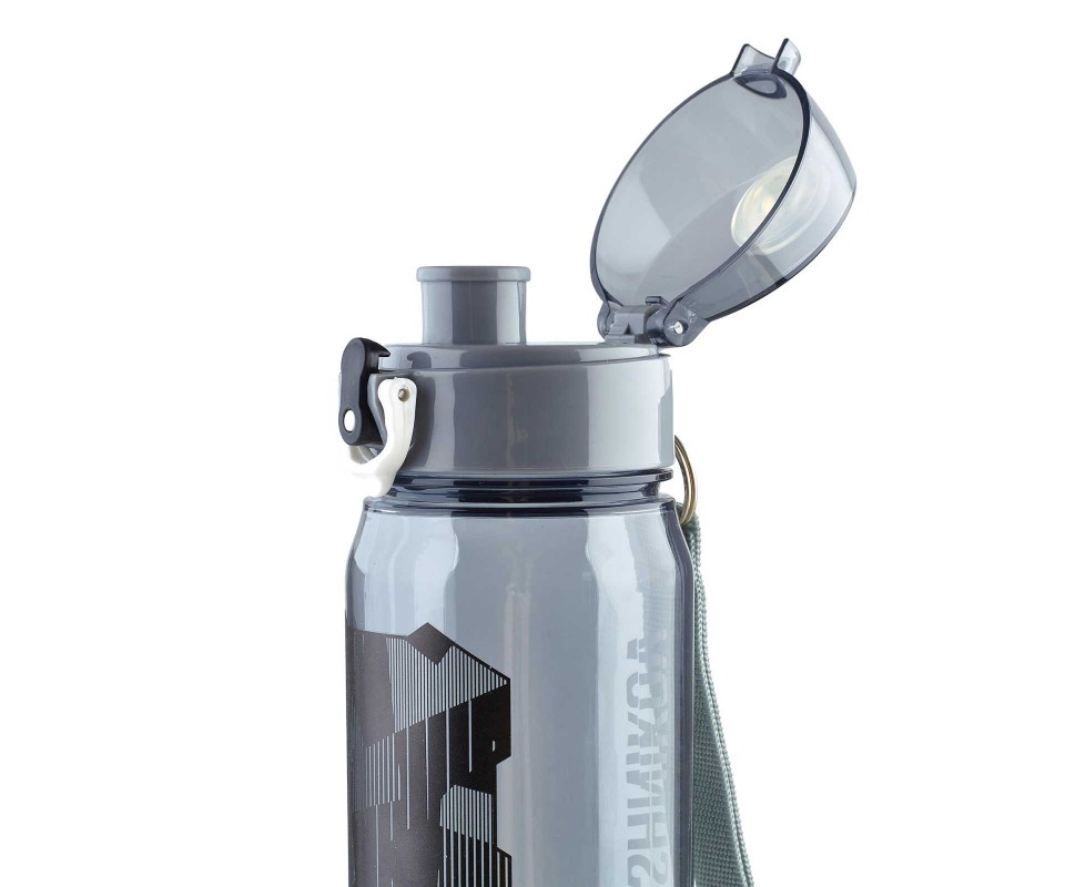 Откидывающаяся крышка с защитой от протекания и ремешком для удобного удержания позволяют утолять жажду, не открываясь от тренировки.