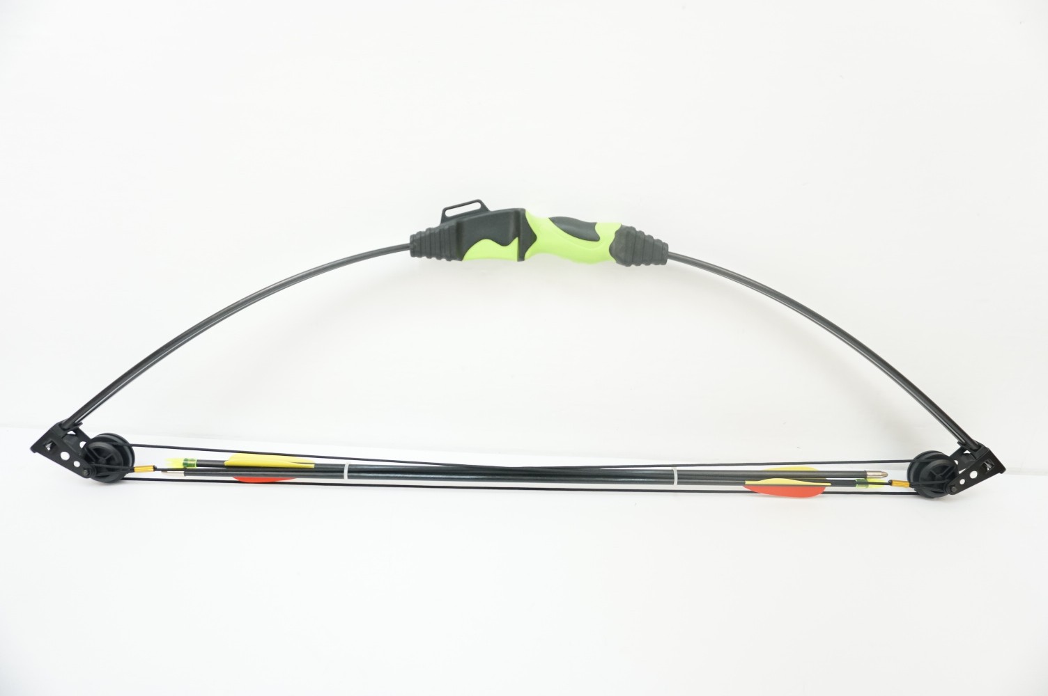 Материал рукоятки и дуг – пластик хорошего качества с отличными противоударными свойствами. На рукоятке имеются насечки и выпуклости для удобного хвата. Благодаря наличию прицела, а также полочки юный стрелок может точно прицелиться. Длина лука 86 см, его вес 0,5 кг. В комплекте две фиберглассовых стрелы, прицел, защитная крага, напальчник и полочка.