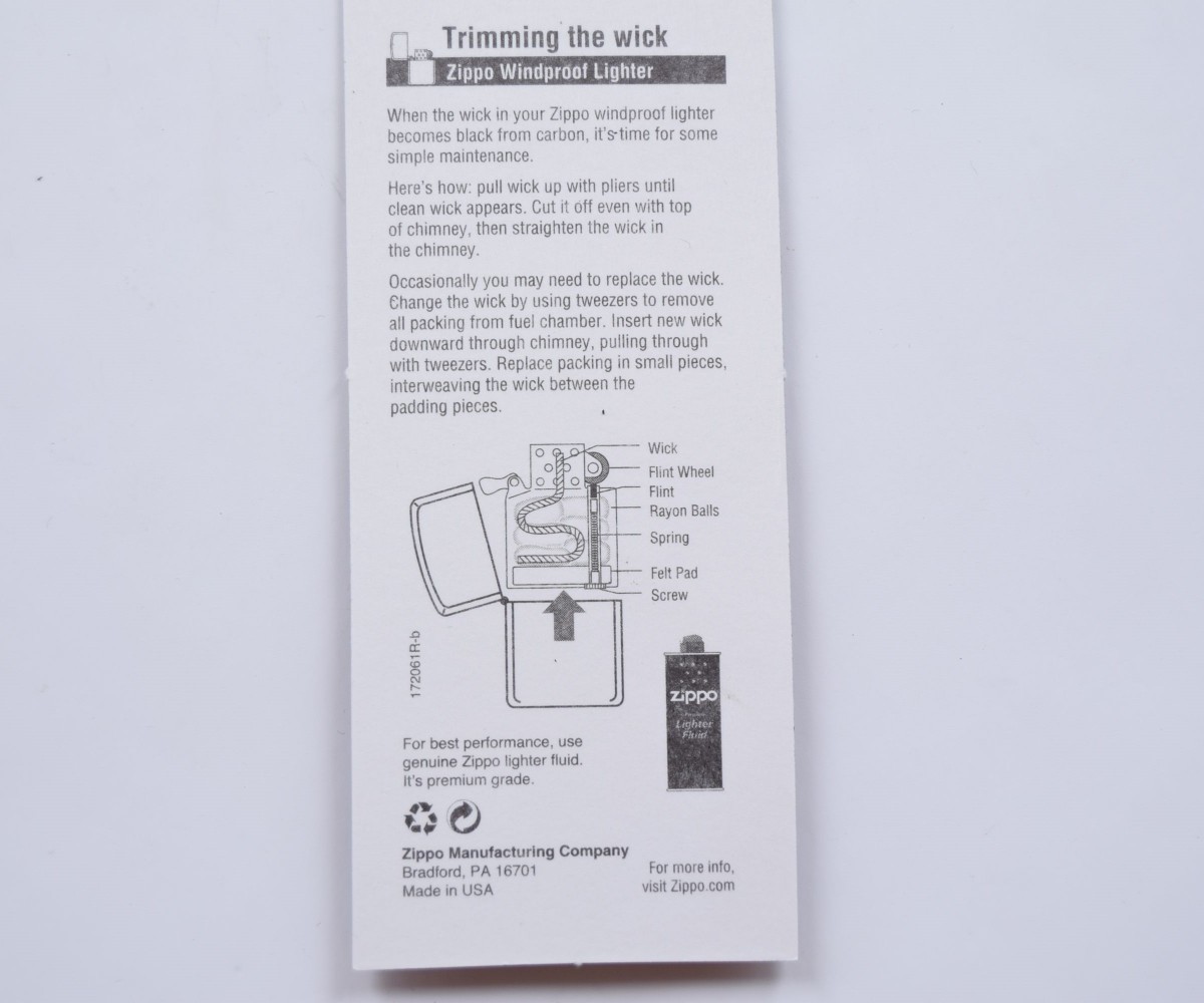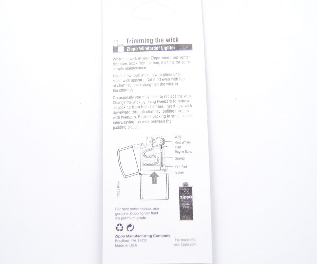 Надежный фитиль имеет длительный срок службы. В случае необходимости фитиль легко заменить самостоятельно. Подходит к любой зажигалке Zippo.