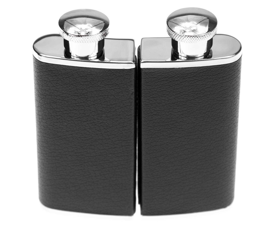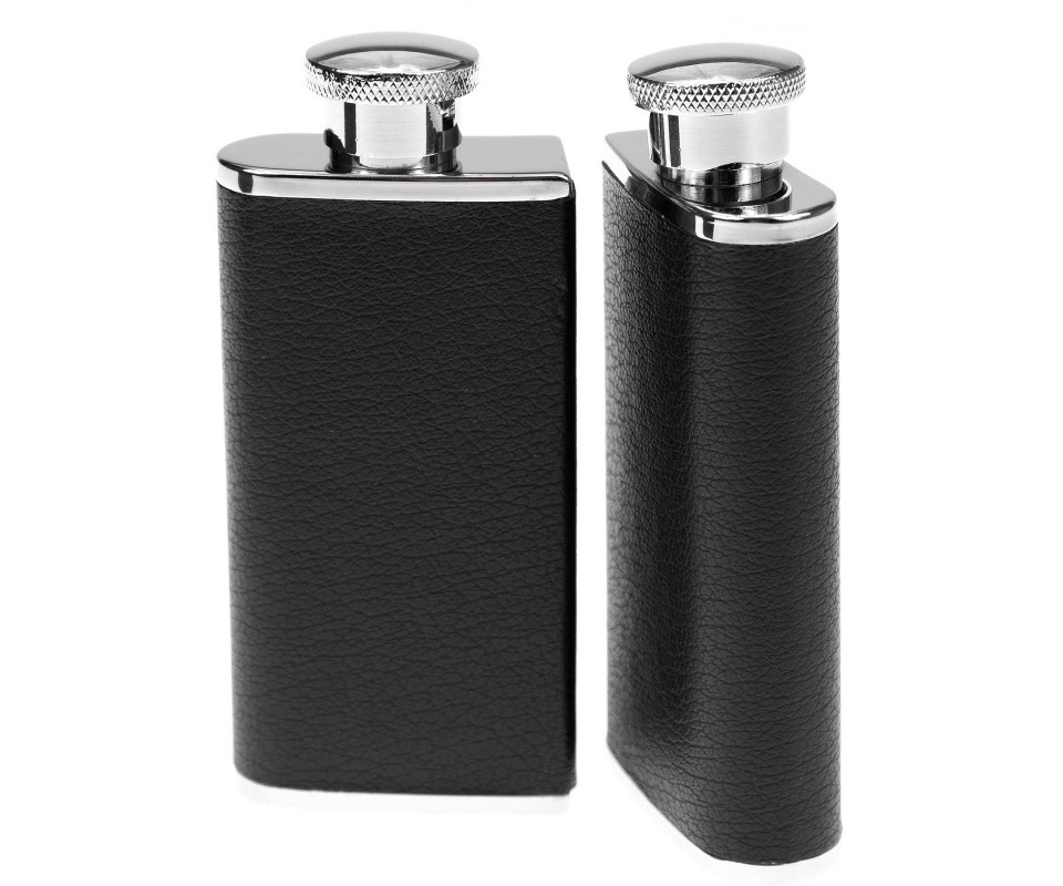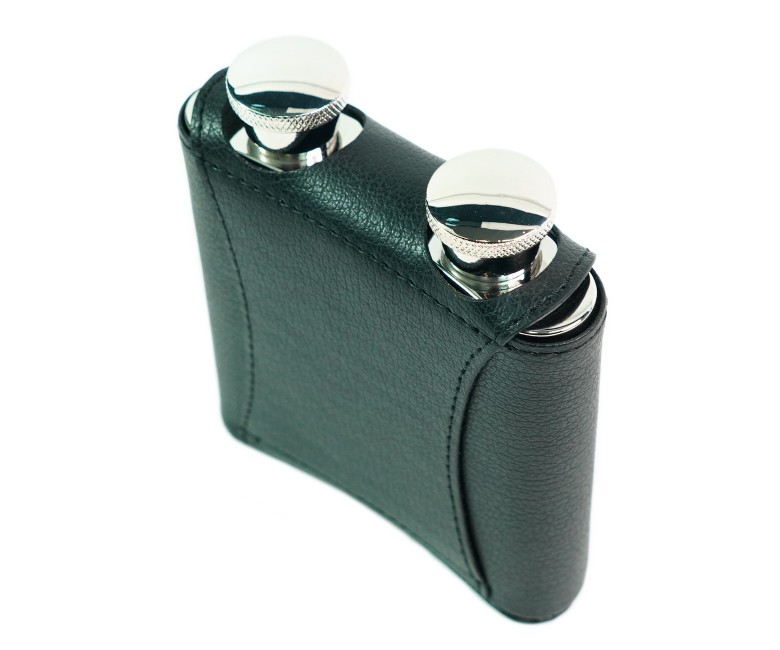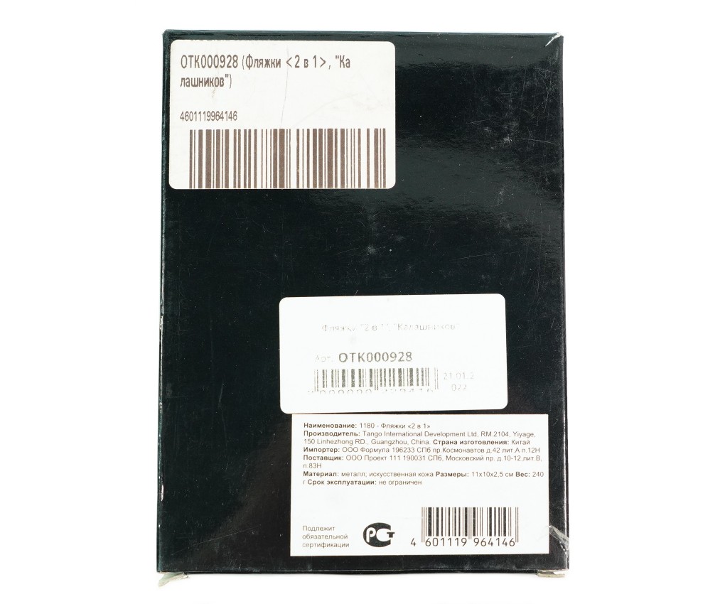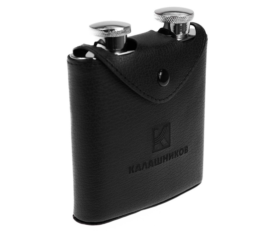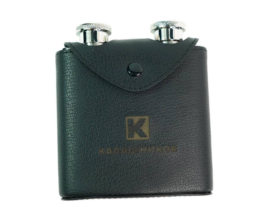 2 фляжки по 89 мл, в чехле из эко-кожи. Фляги сделаны из нержавеющей стали, декорированные силуэтом автомата и логотипом Концерна Калашников.