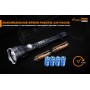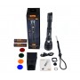 | Комплектация (?): | фонарь, USB шнур, 2 аккумулятора 18650 емкостью 2600 мАч со встроенными зарядными устройствами, комплект съемных цветных светофильтров (красный, синий, зеленый, оранжевый), запасное уплотнительное кольцо, тактическое кольцо, запасная накладка торцевой кнопки, чехол, темляк, инструкция |