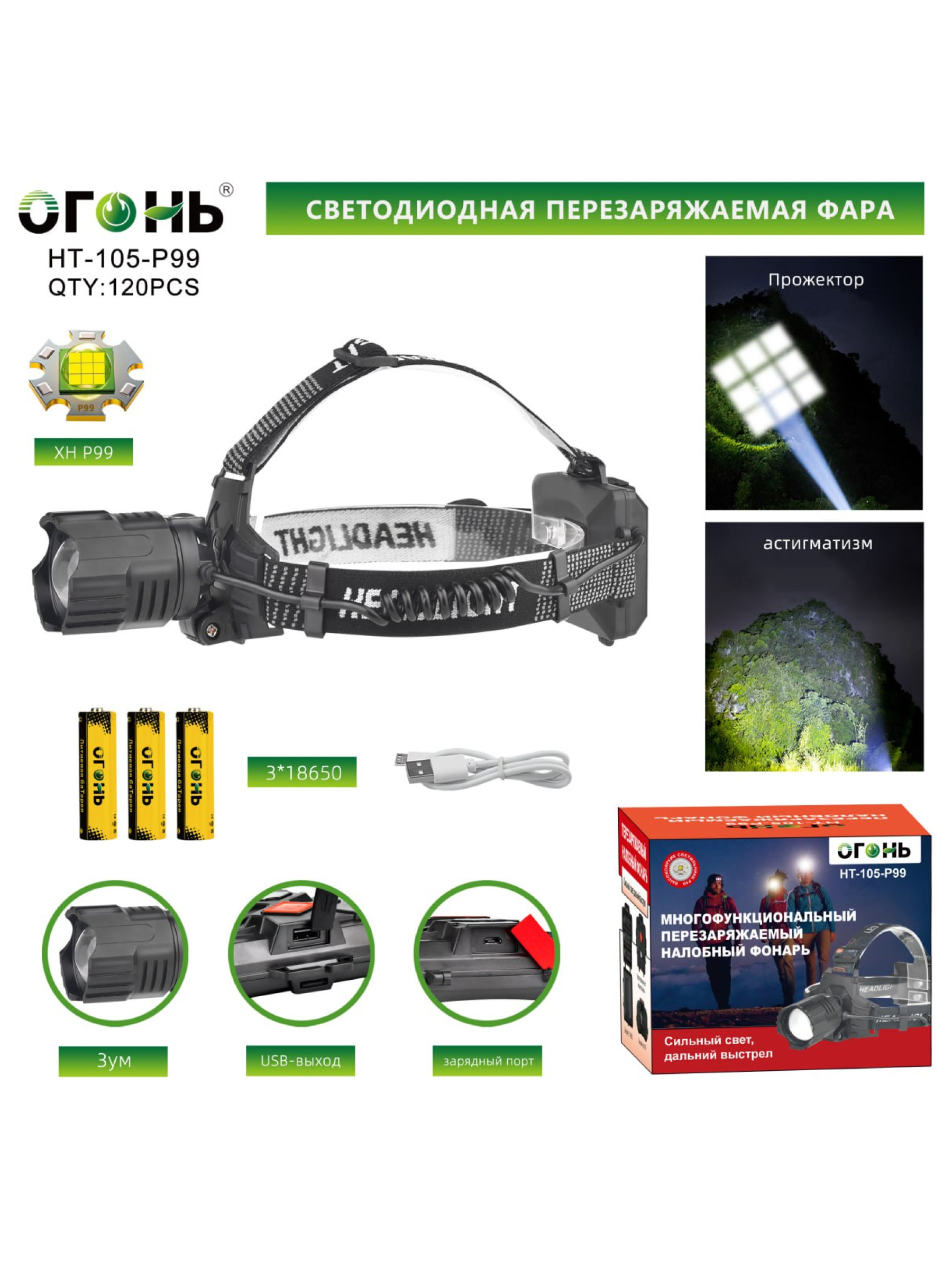 Фонарь налобный Огонь HT-105-P99 Zoom — это сочетание мощности, удобства и универсальности, готовое обеспечить яркое и надежное освещение в любой ситуации.