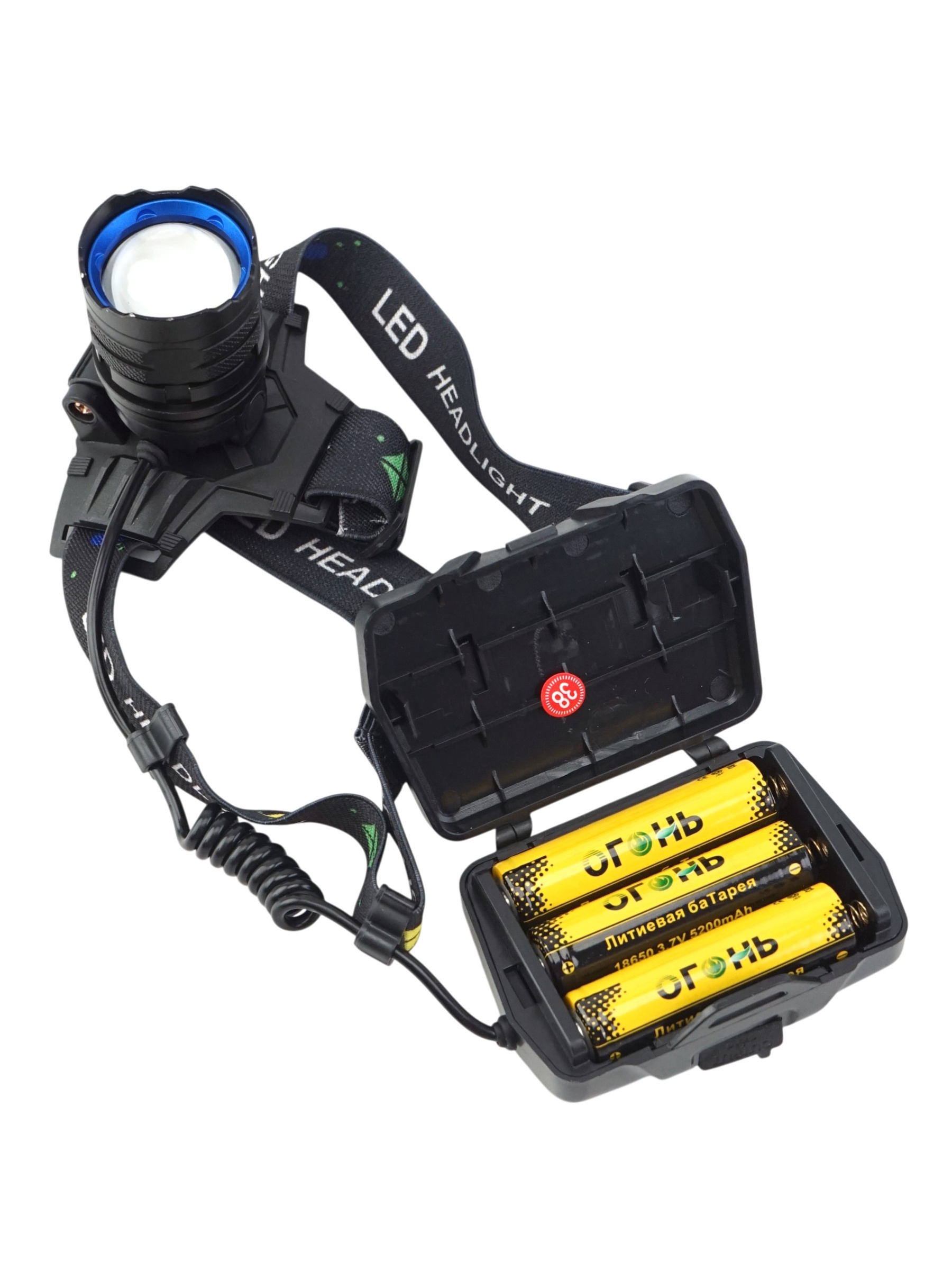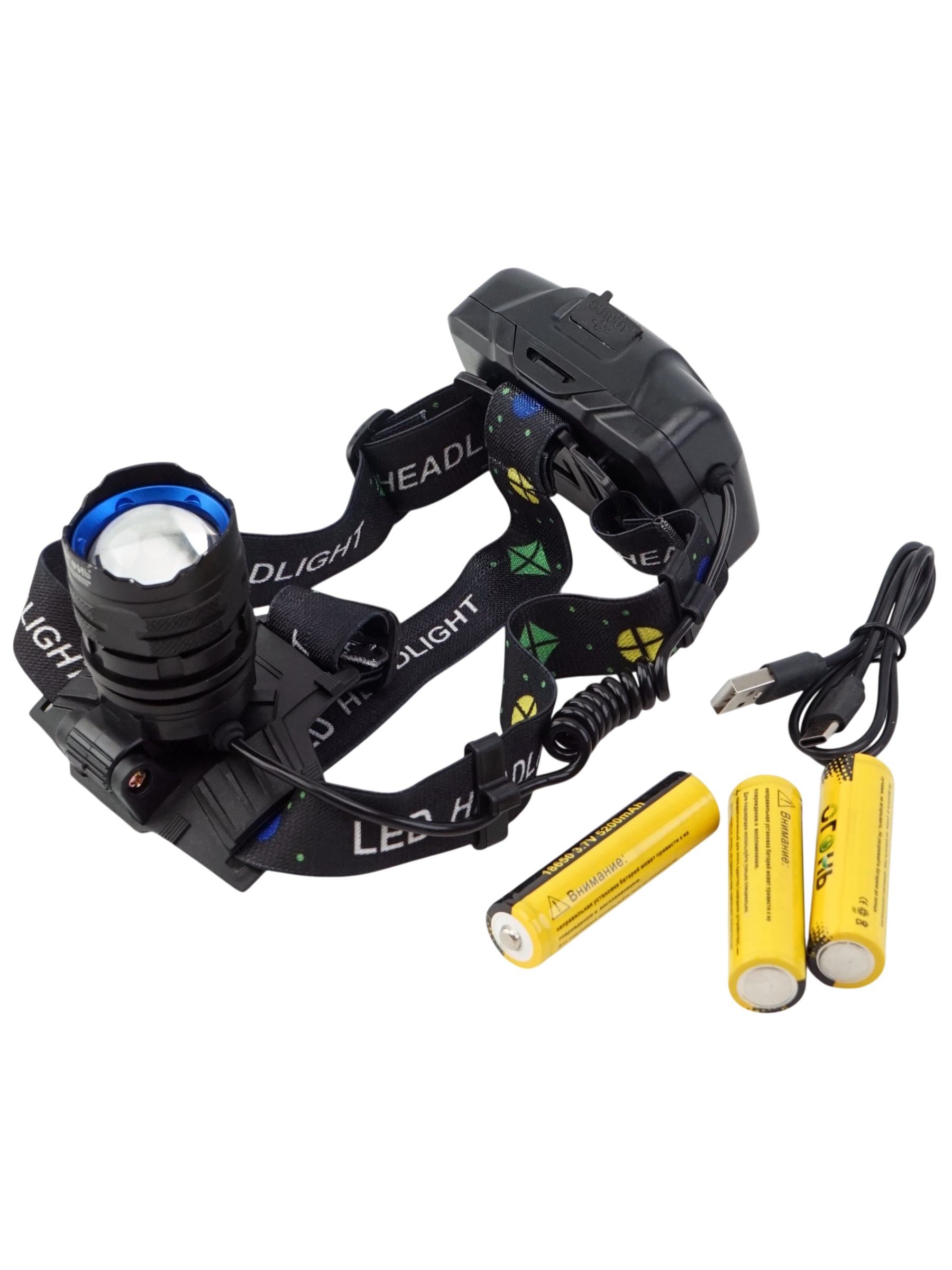 В комплект входит всё необходимое — сам фонарь, две аккумуляторные батарейки, провод для зарядки или замены питания, инструкция и аккуратная упаковка, которая обеспечивает сохранность изделия.