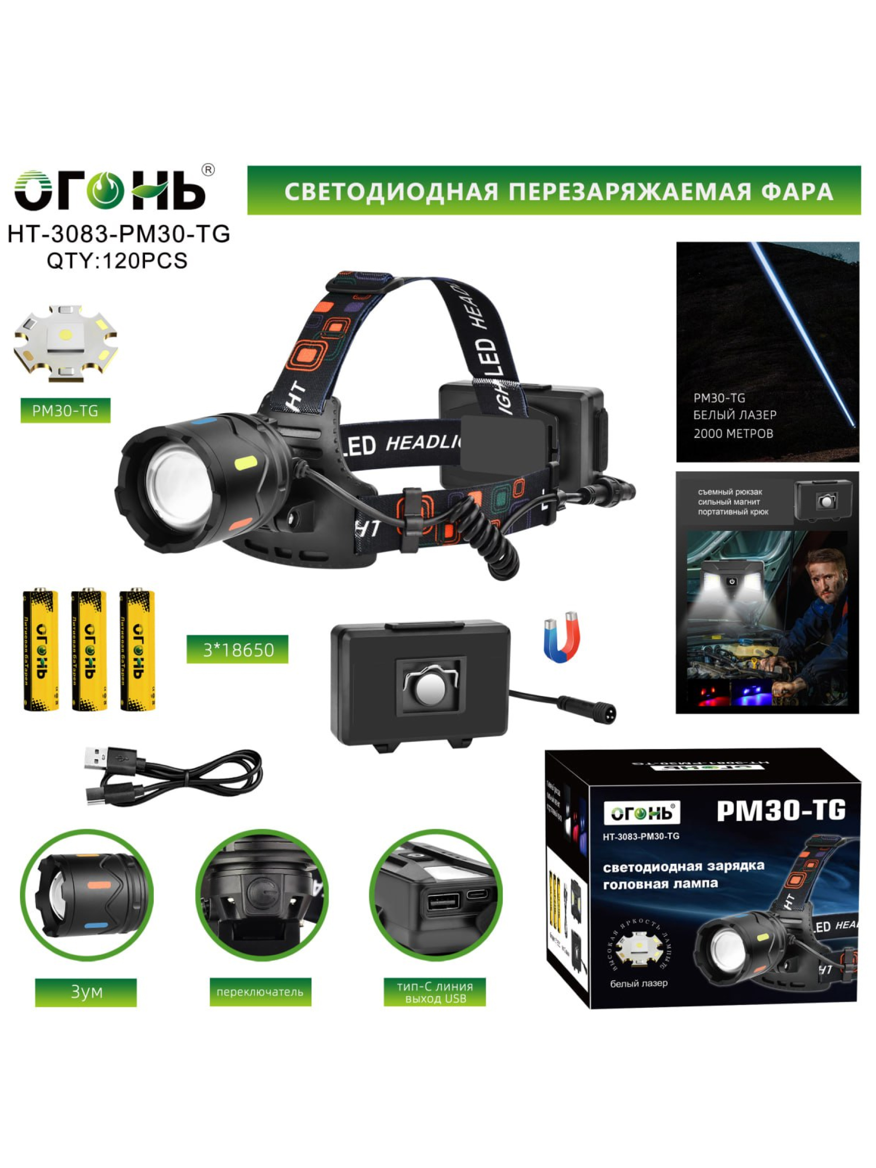 Представляем вам налобный фонарь Огонь HT-3083-PM30-TG Zoom — передовое решение для тех, кто требует яркого и дальнего освещения, а также многофункциональности в любой ситуации. Этот светодиодный фонарь, произведённый в Китае компанией Огонь, оснащён мощным светодиодом PM30-TG, который способен освещать территорию на внушительном расстоянии до 3000 метров, что делает его идеальным для ночных походов, работы в темноте или поисково-спасательных операций.