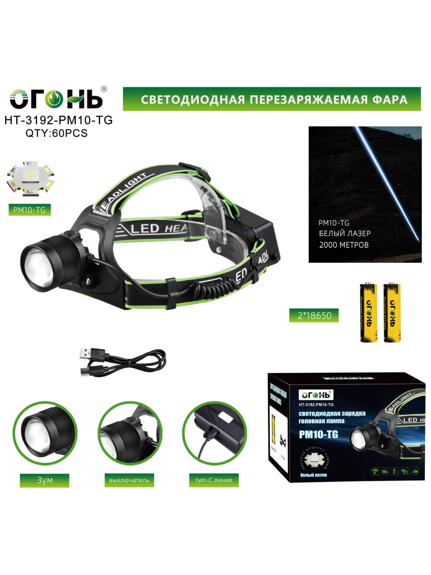 Представляем вам налобный фонарь Огонь HT-3192-PM10-TG Zoom — мощное и надежное решение для тех, кто ценит яркое освещение и дальность. Этот светодиодный фонарь, произведённый в Китае компанией Огонь, оснащён передовым светодиодом PM10-TG, который способен освещать пространство на расстоянии до 2000 метров, делая его незаменимым спутником в ночных походах, рыбалке, путешествиях или профессиональных задачах.