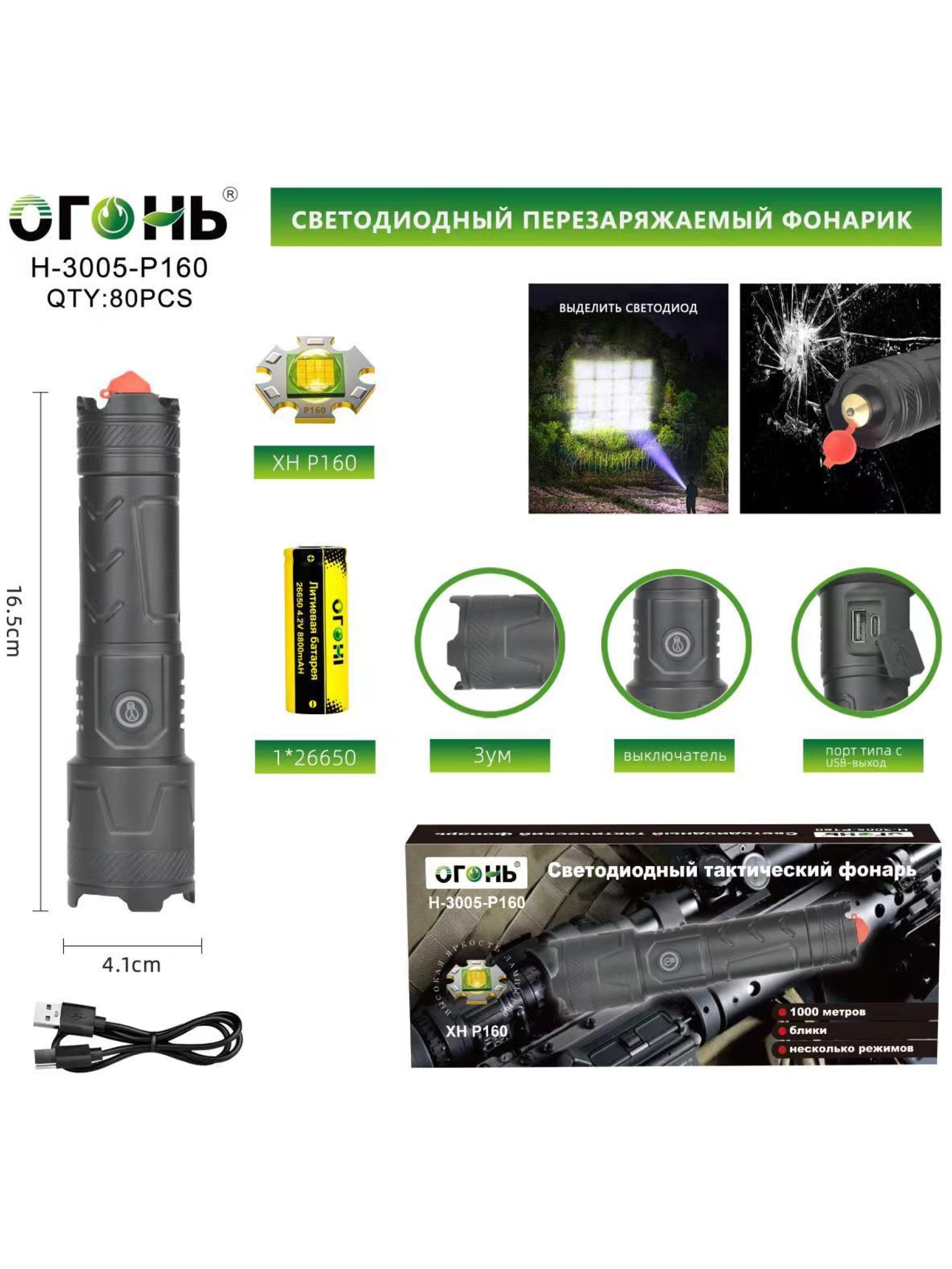 Представляем вам светодиодный тактический фонарь Огонь H-3005-P160 Zoom — это мощное, многофункциональное устройство, созданное для тех, кто требует высокой эффективности и надежности в компактном корпусе. Этот ручной, карманный фонарь, произведённый компанией Огонь из Китая, оснащён источником света P160, позволяющим освещать объекты на расстоянии до 1000 метров, что делает его незаменимым для охоты, тактических операций, поисково-спасательных работ и экстремальных путешествий.