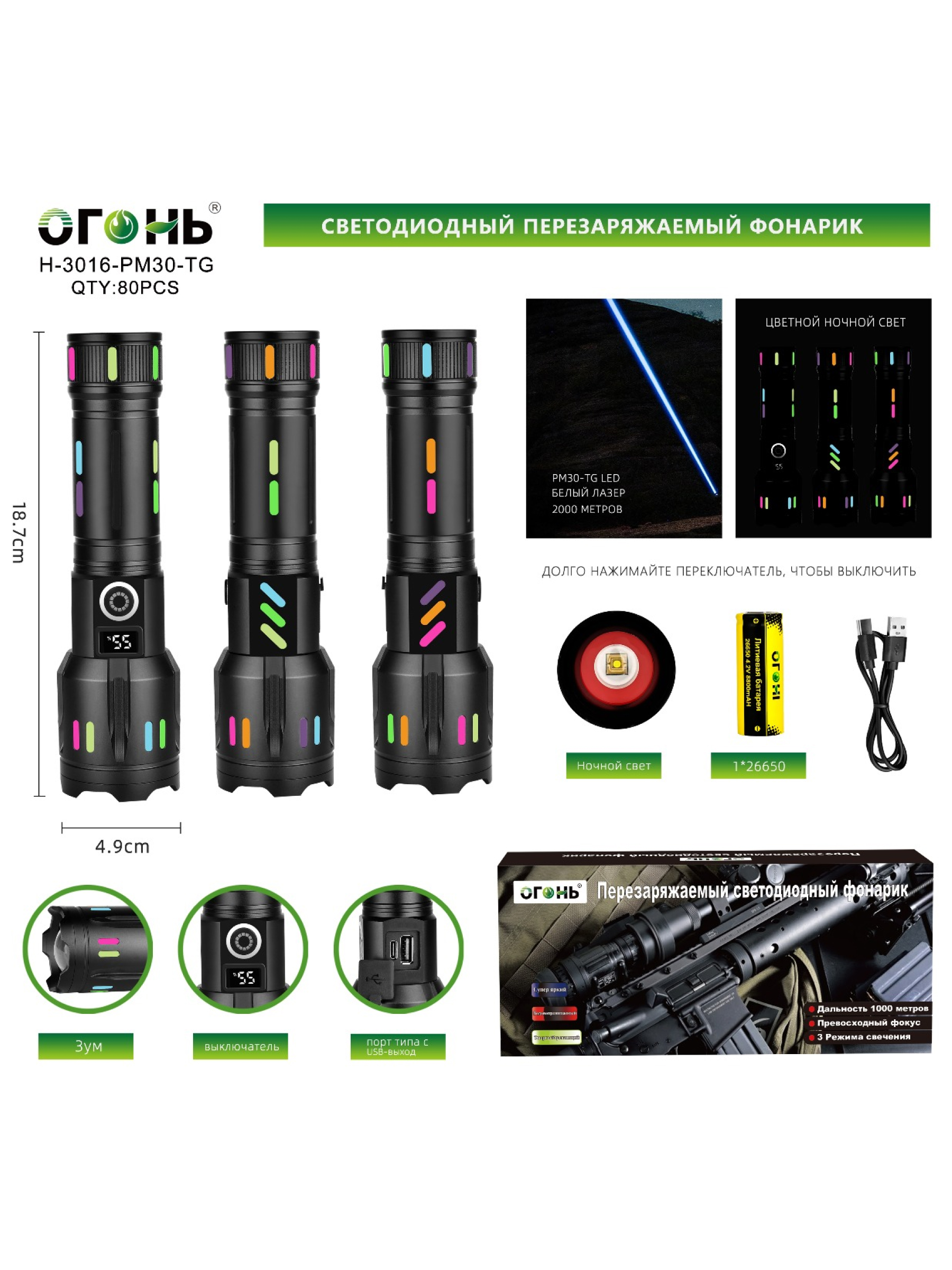 Представляем вам светодиодный тактический фонарь Огонь H-3016-PM30-TG Zoom — это универсальное и мощное устройство, созданное для тех, кто ценит надежность, компактность и многофункциональность в одном аксессуаре. Этот ручной, карманный фонарь производства компании Огонь из Китая обладает высокой дальностью освещения благодаря источнику света PM30-TG, который способен освещать объекты на расстоянии до 1000 метров, делая его незаменимым для поиска, охоты, тактических операций и ночных поездок.
