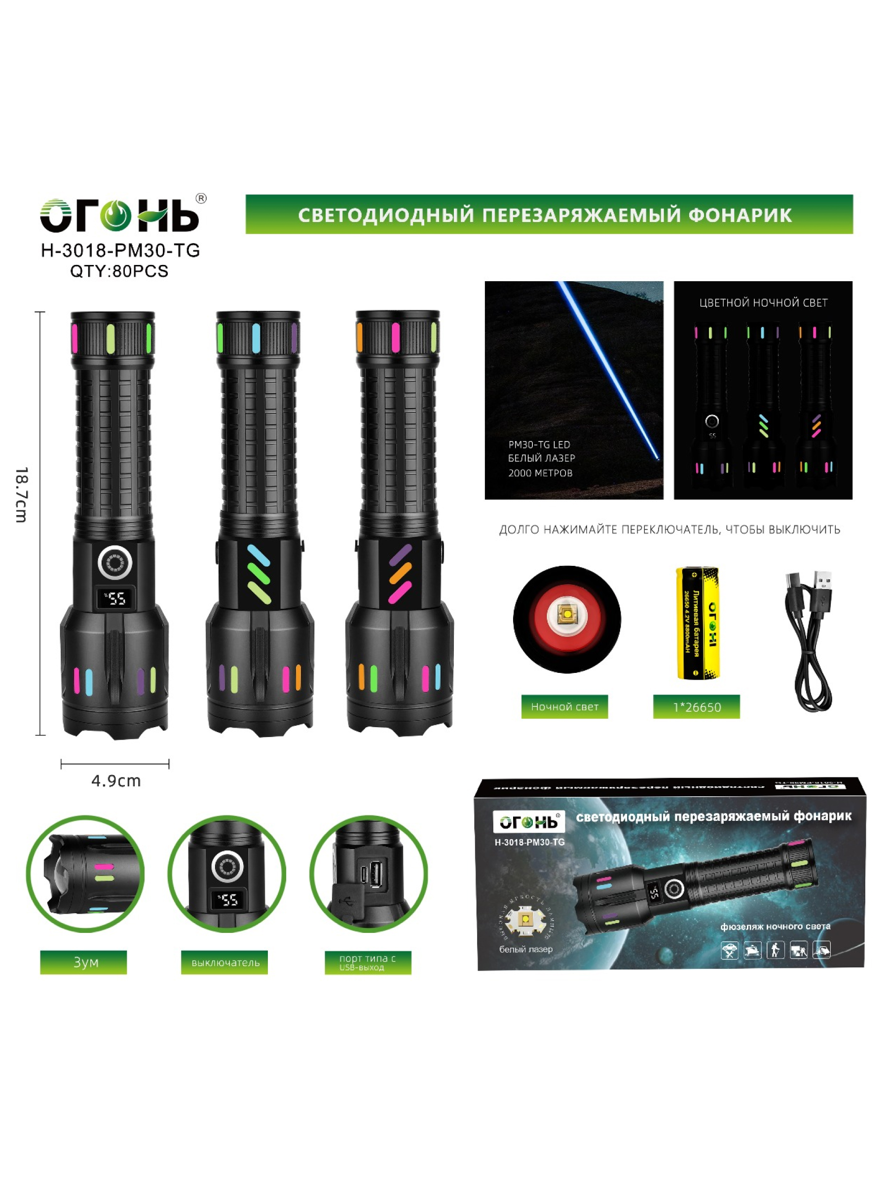 Представляем вам светодиодный тактический фонарь Огонь H-3018-PM30-TG Zoom — это универсальное и мощное устройство, созданное для тех, кто ценит надежность, компактность и многофункциональность в одном аксессуаре. Этот ручной, карманный фонарь производства компании Огонь из Китая обладает высокой дальностью освещения благодаря источнику света PM30-TG, который способен освещать объекты на расстоянии до 1000 метров, делая его незаменимым для поиска, охоты, тактических операций и ночных поездок.