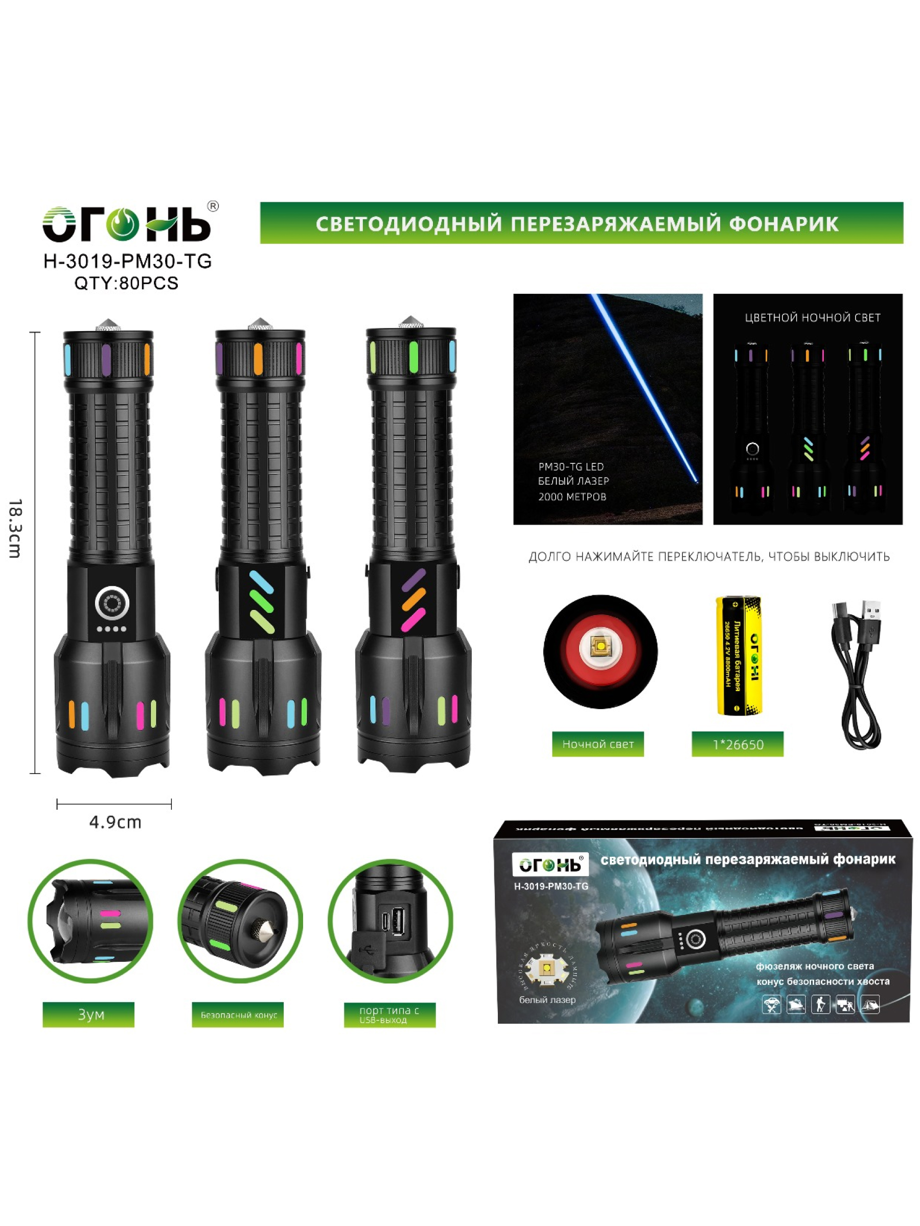 Представляем вам светодиодный тактический фонарь Огонь H-3019-PM30-TG Zoom — это сочетание высокой производительности, надежности и компактности, идеально подходящее для профессионалов и любителей, ищущих универсальный источник света в экстремальных условиях. Этот ручной, карманный фонарь из Китая оснащен мощным источником света PM30-TG, который способен освещать объекты на расстоянии до 1000 метров, обеспечивая превосходную дальность и яркое белое освещение.