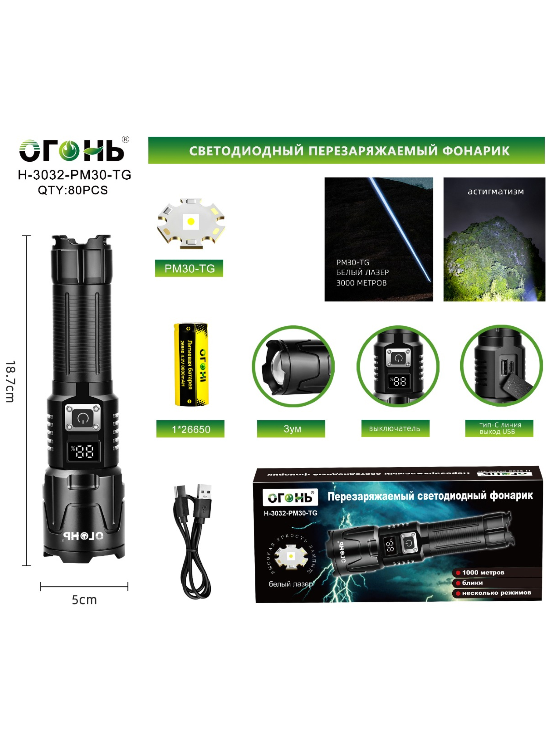 Представляем вам светодиодный фонарь Огонь H-3032-PM30-TG Zoom — надёжный и универсальный источник освещения, который станет вашим незаменимым помощником в самых суровых условиях. Этот карманный фонарь, выполненный из прочного алюминиевого сплава, обладает компактными размерами 187 х 50 мм и весом всего 180 граммов, благодаря чему легко помещается в карман или на поясе, а его эргономичный дизайн обеспечивает комфорт при использовании.