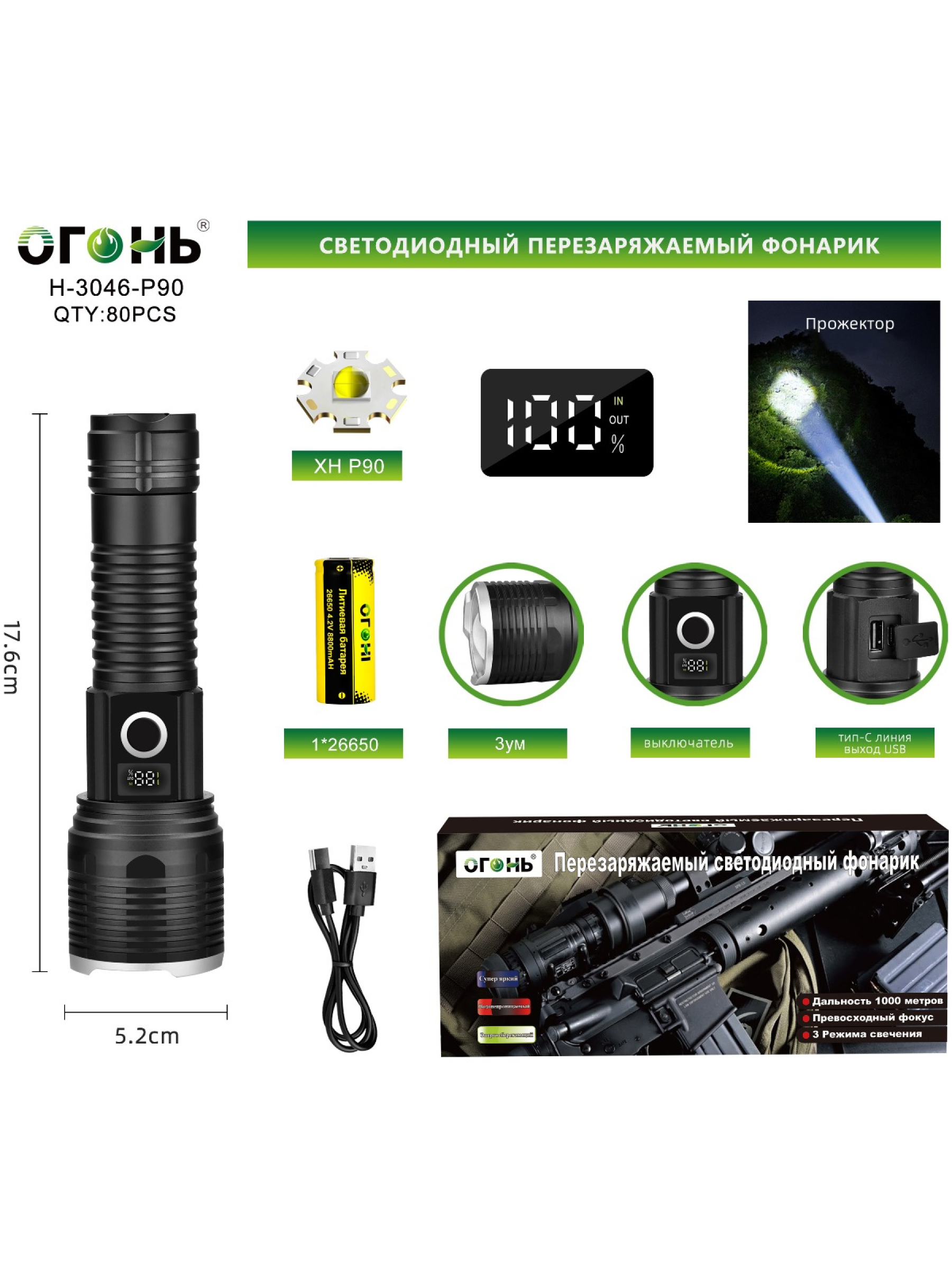 Фонарь Огонь H-3046-P90 Zoom сочетает в себе мощь, компактность и инновационные технологии, что делает его незаменимым помощником для профессионалов и энтузиастов, требующих надежного источника света в любой ситуации.