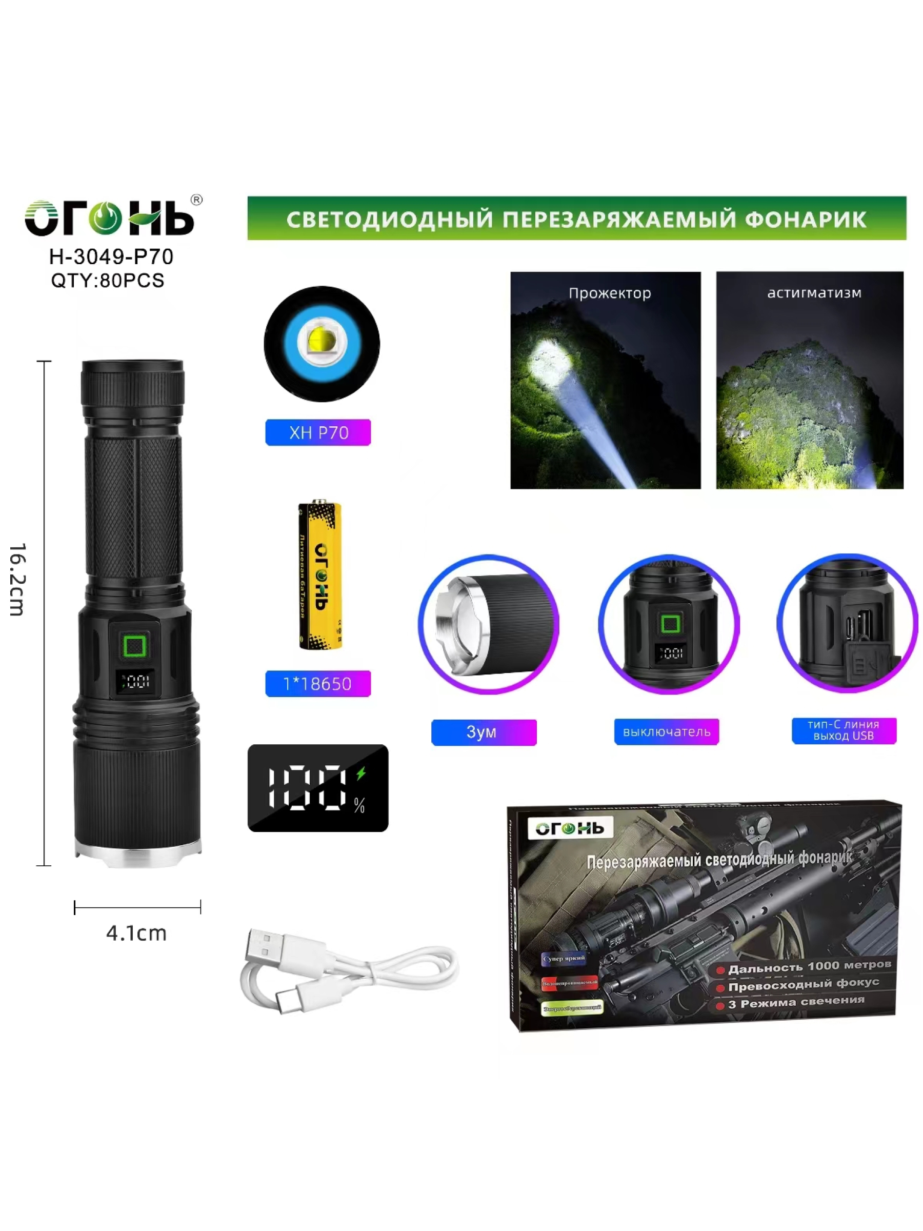 Фонарь Огонь H-3049-P70 Zoom — это надежный и многофункциональный источник света, сочетающий в себе технологичные решения и удобство использования, который станет незаменимым помощником в любой ситуации.