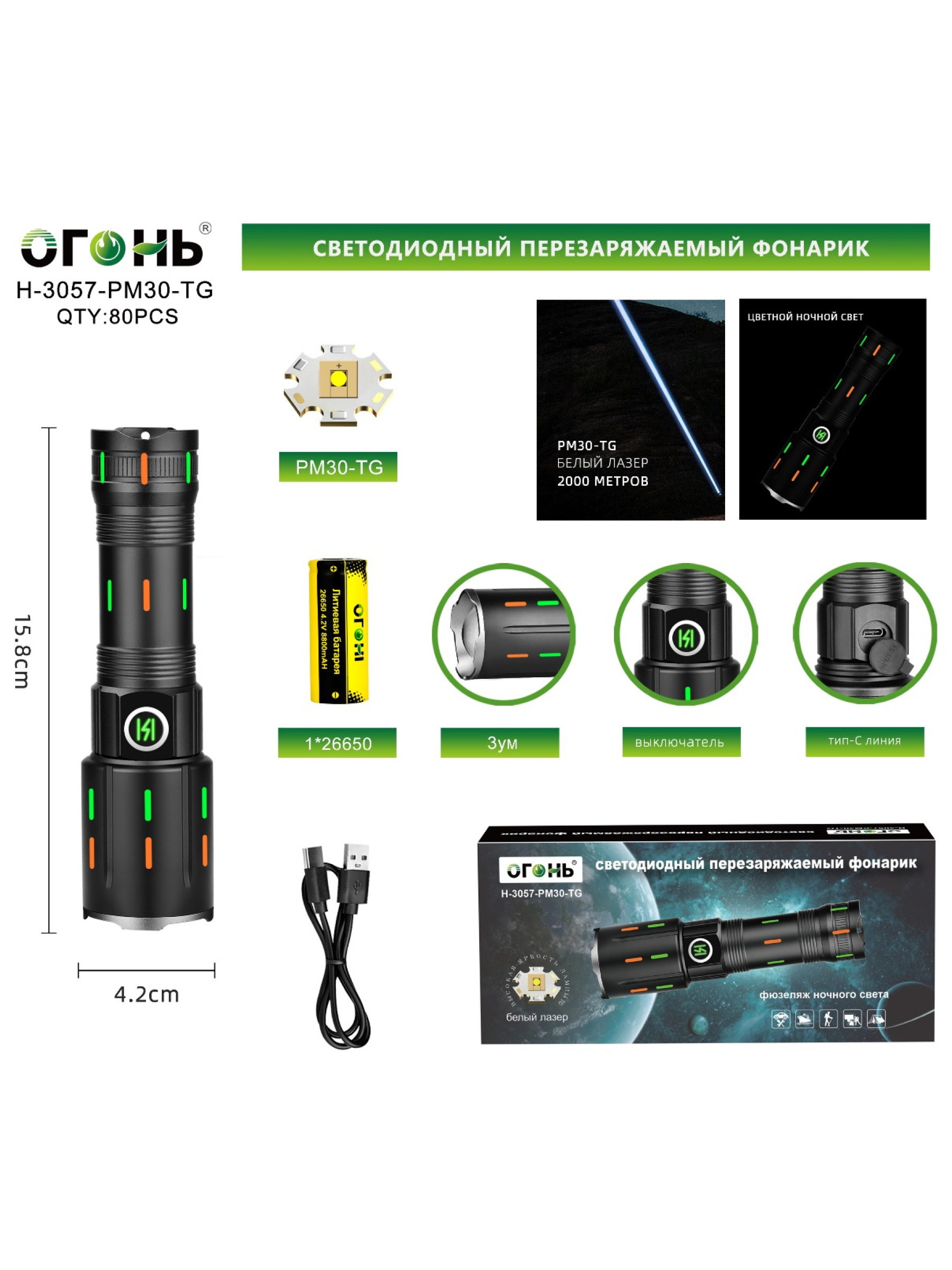 Фонарь Огонь H-3057-PM30-TG Zoom сочетает в себе мощность, универсальность и технологические инновации, делая его идеальным выбором для профессионалов, охотников и любителей, требующих надежного освещения на высшем уровне.