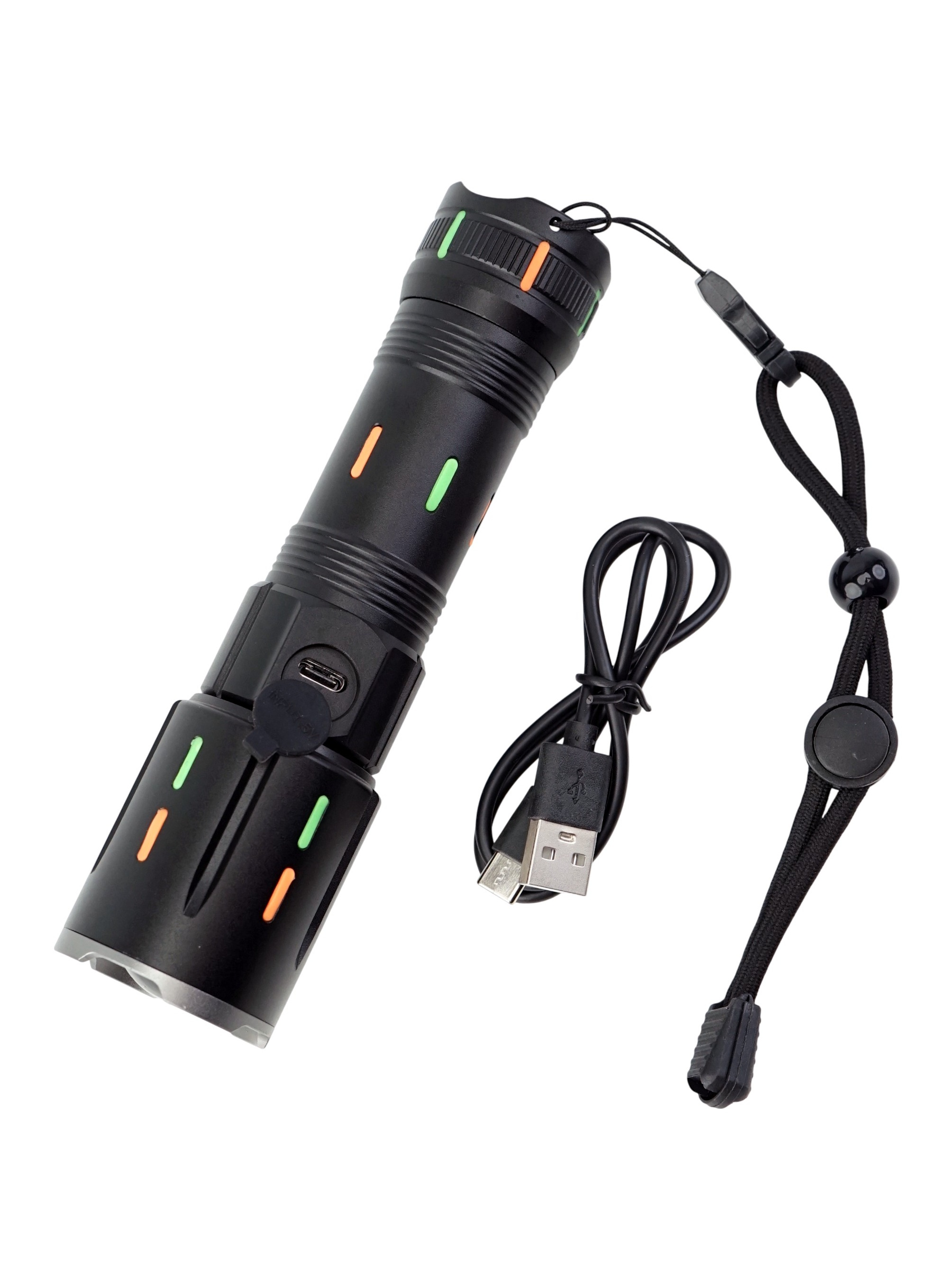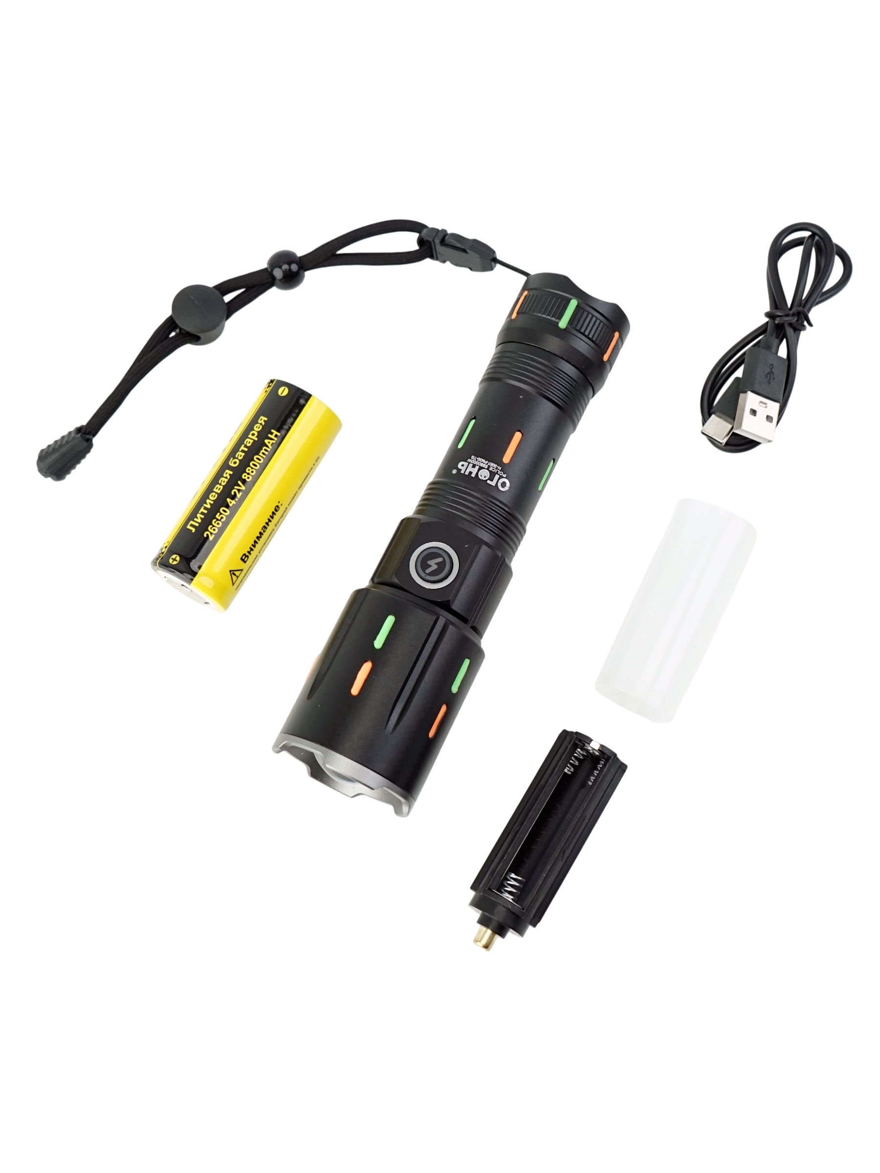 Зарядка осуществляется через современный порт Type-C, что гарантирует быструю и удобную подзарядку. В комплект входит всё необходимое — фонарь, аккумулятор, кабель Type-C, инструкция и стильная упаковка.