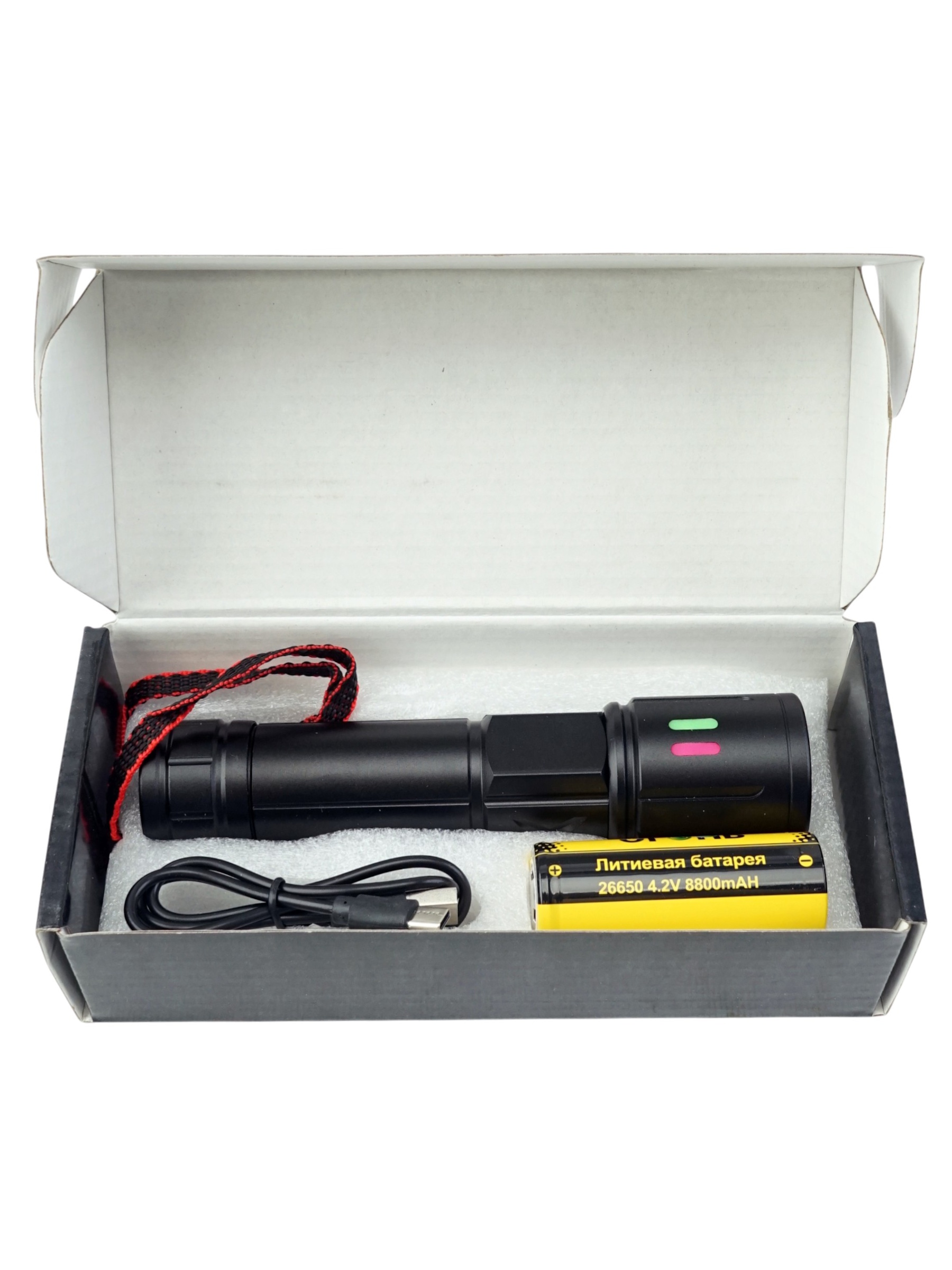 Модель использует источник света PM20-TG и оснащена встроенным аккумулятором типа 26650, что обеспечивает продолжительную работу и надежность. Управление осуществляется через современный порт Type-C, который обеспечивает быструю зарядку и удобство в использовании. Встроенная индикация заряда позволяет всегда контролировать уровень энергии и своевременно подзаряжать устройство, чтобы оно было готово к любым ситуациям. В комплект входит сам фонарь, аккумулятор, кабель Type-C, инструкция и стильная упаковка — всё, что нужно для быстрого и комфортного начала эксплуатации.